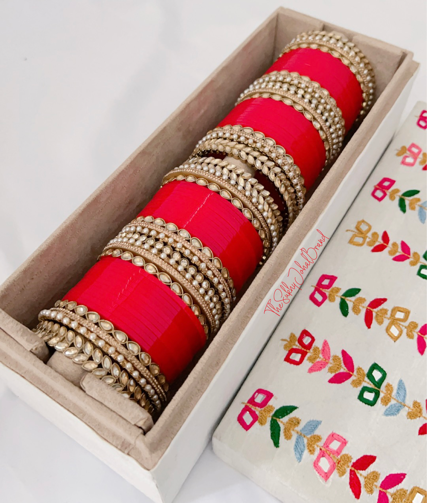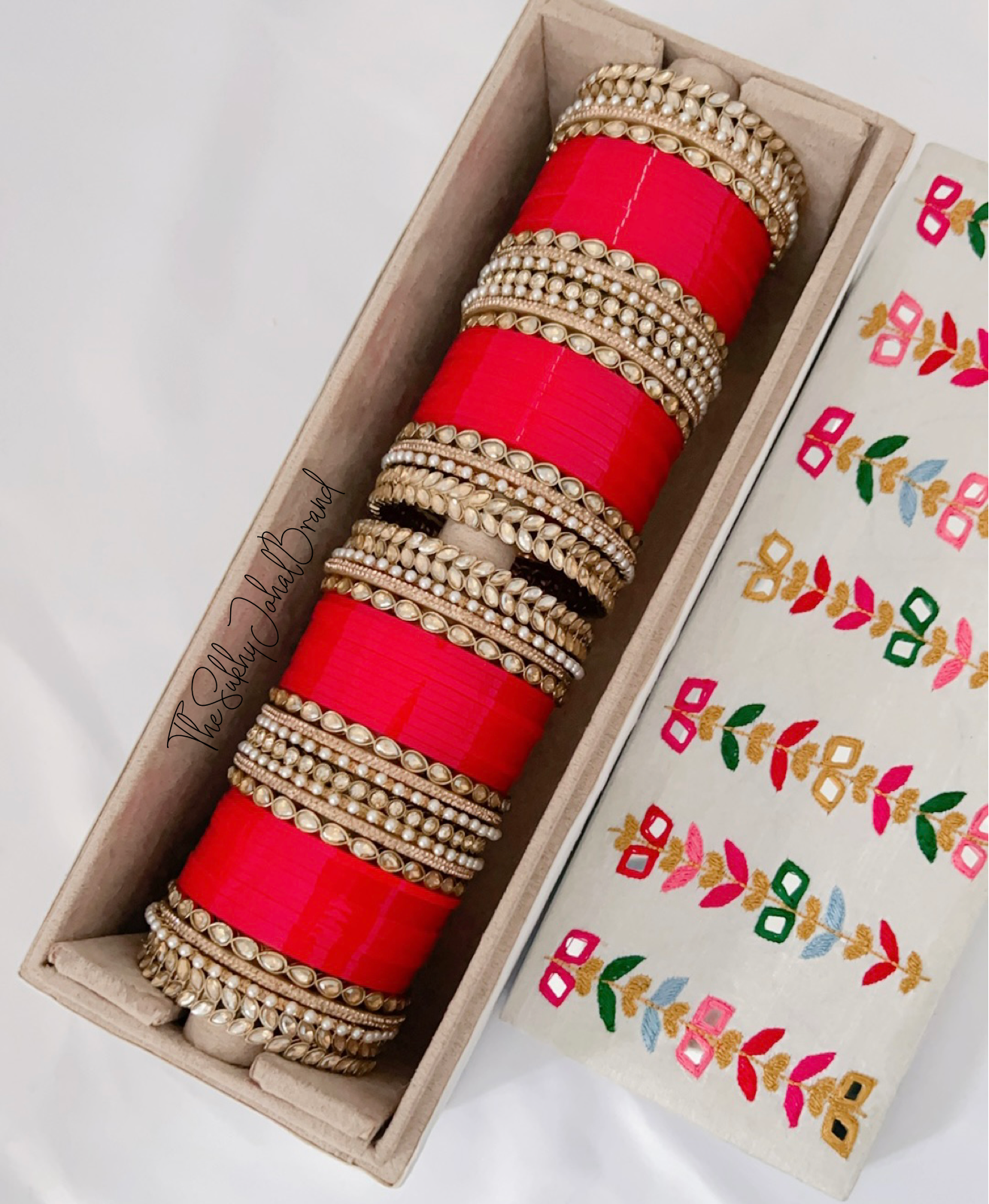 This design was made using polki, pearl, and stone bangles with red chooda bangles.