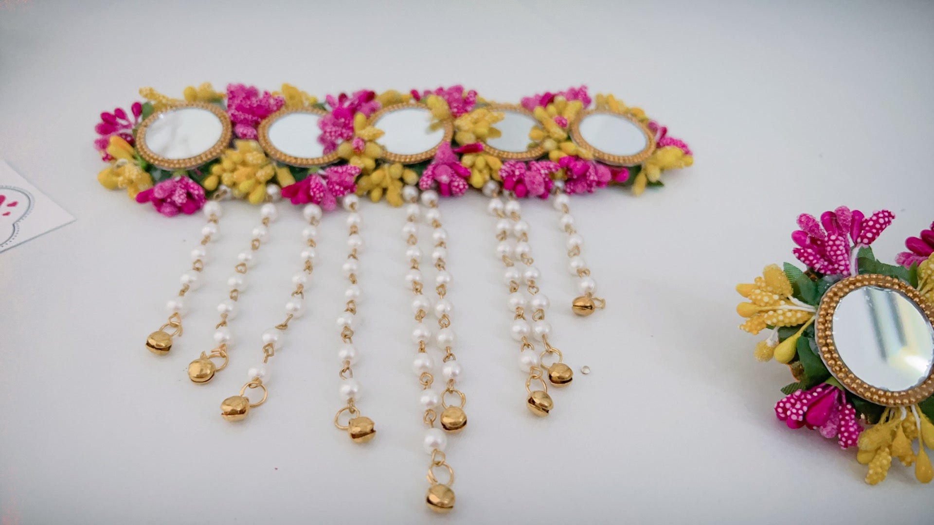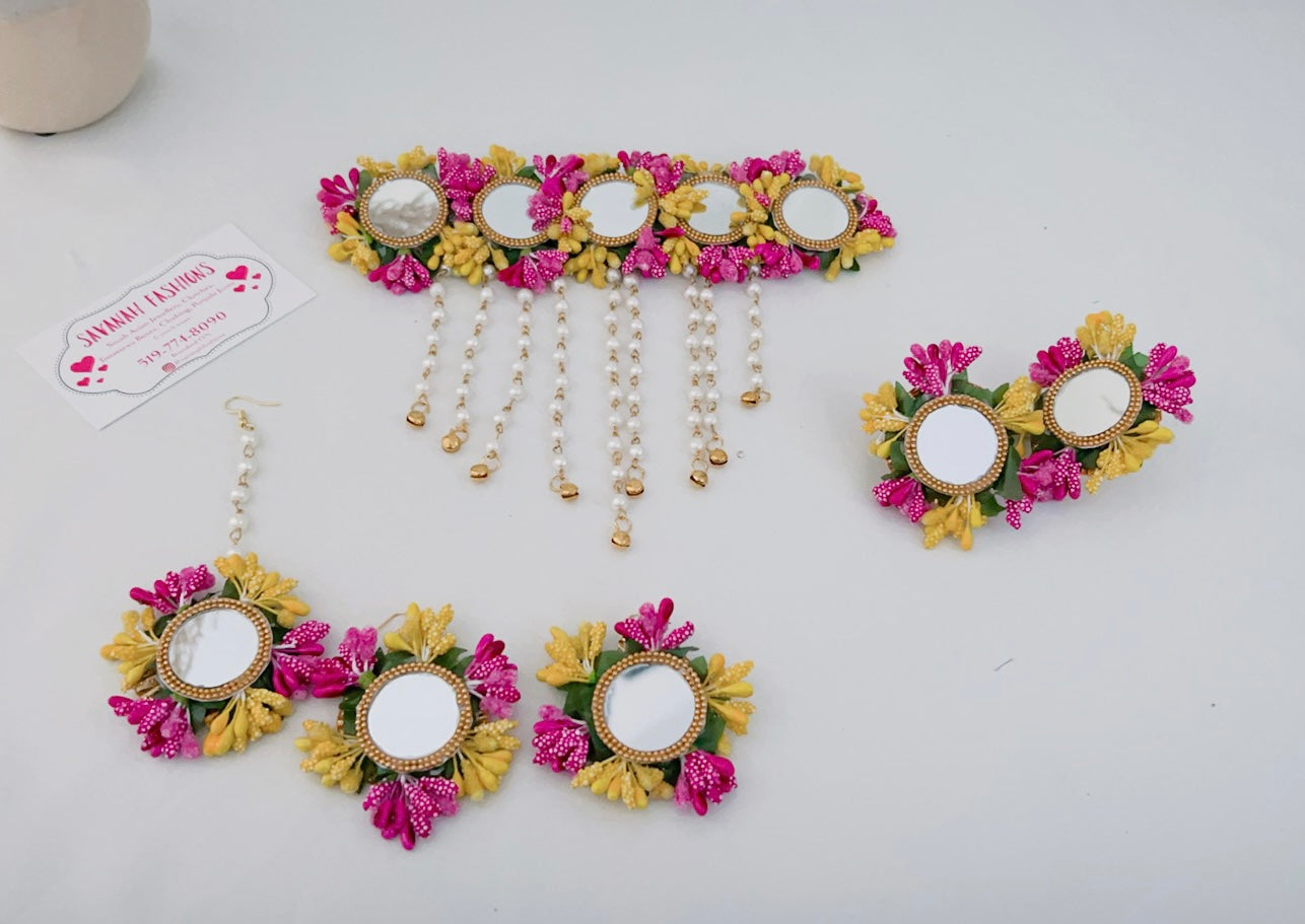 Flower jewellery is unique and in latest trend for all special occasions like Mehendi, Wedding, Sangeet, and Haldi. This full set consists of necklace, tikka, earrings, and rings. Hand made with soft material.