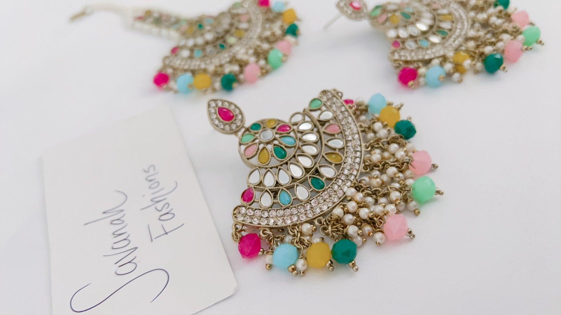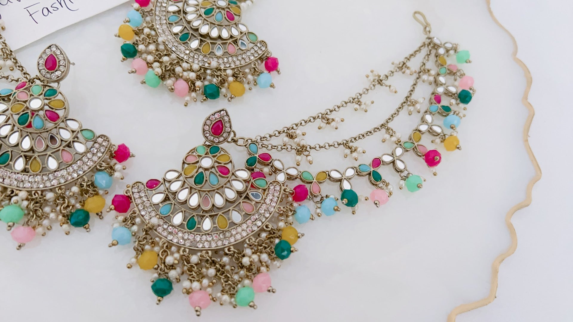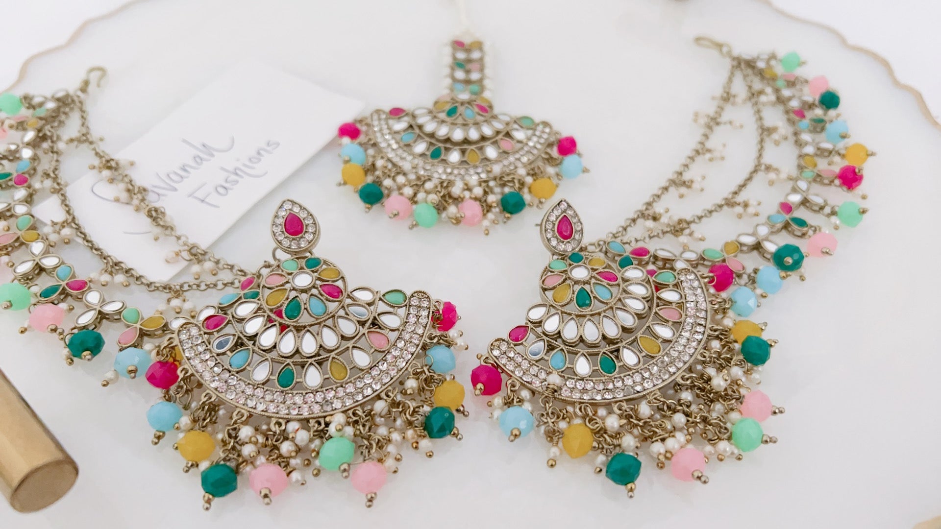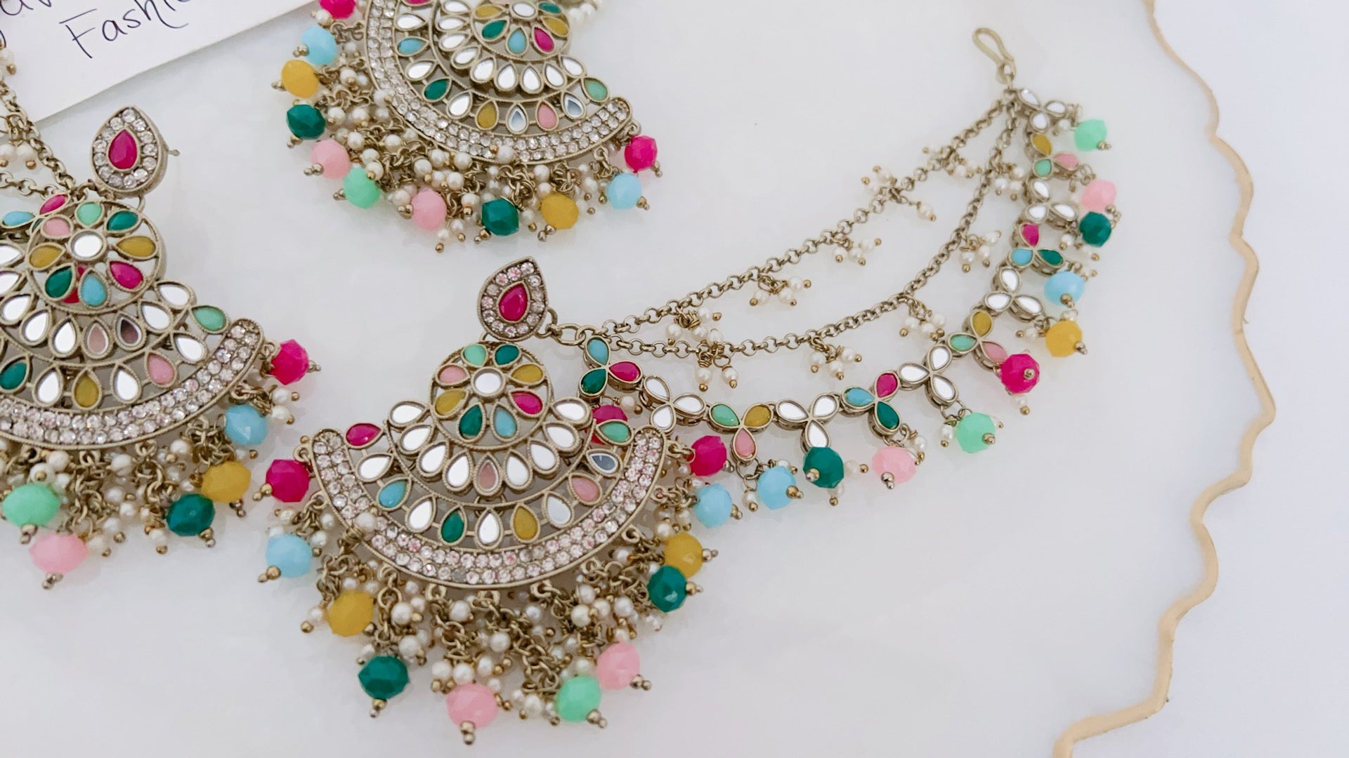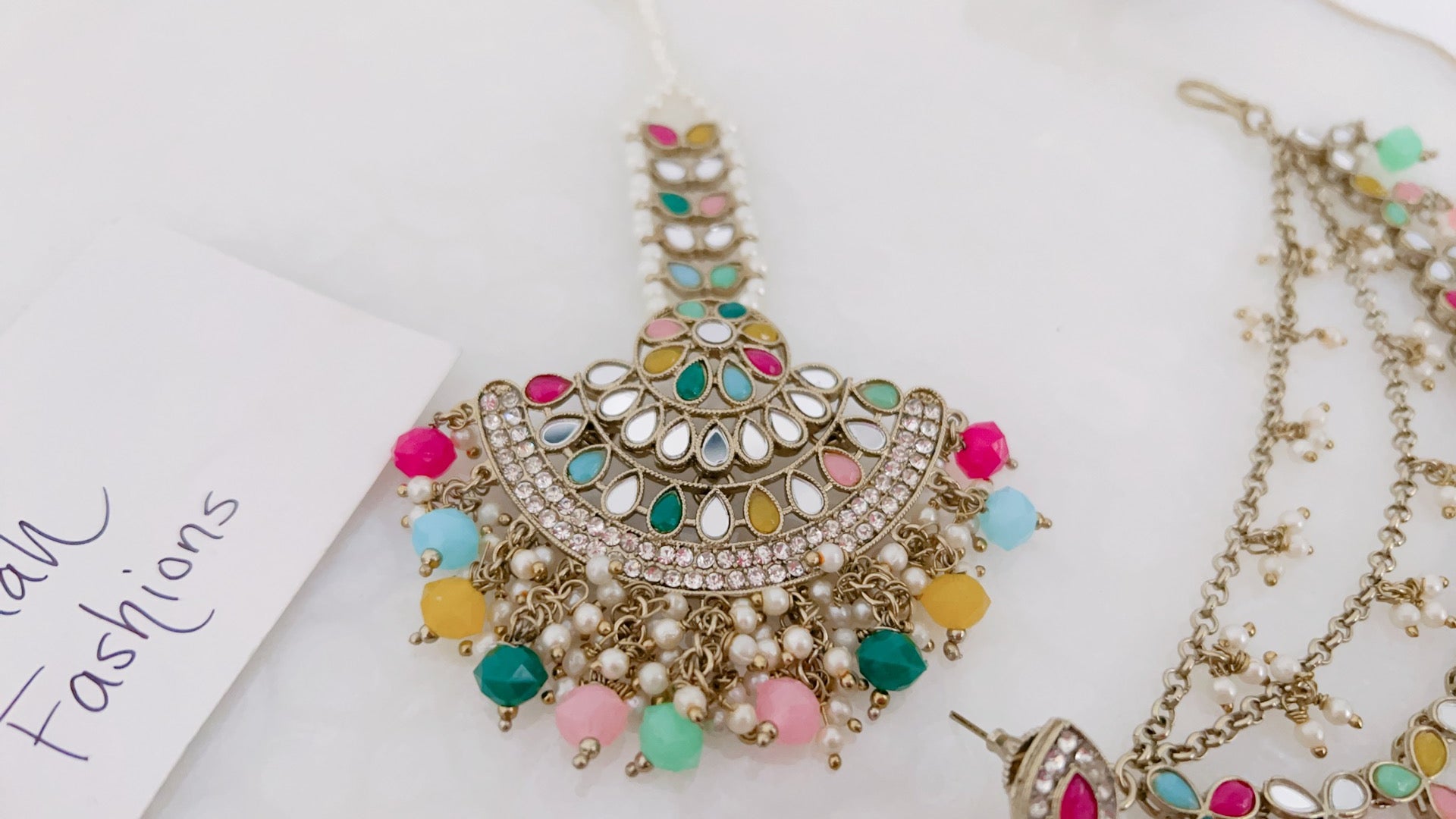 A creation that makes me proud to add to our collection. Our Lucy tikka set made with detachable sahare in mirror material with soft multicoloured stones and pearls.