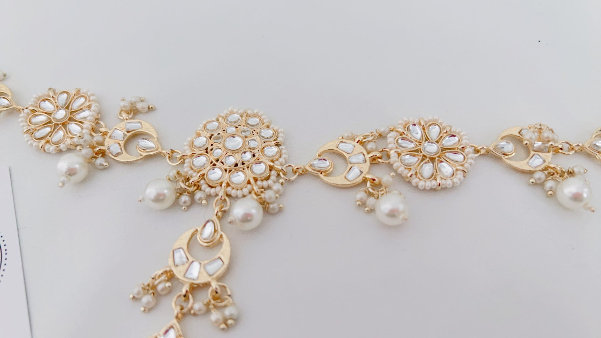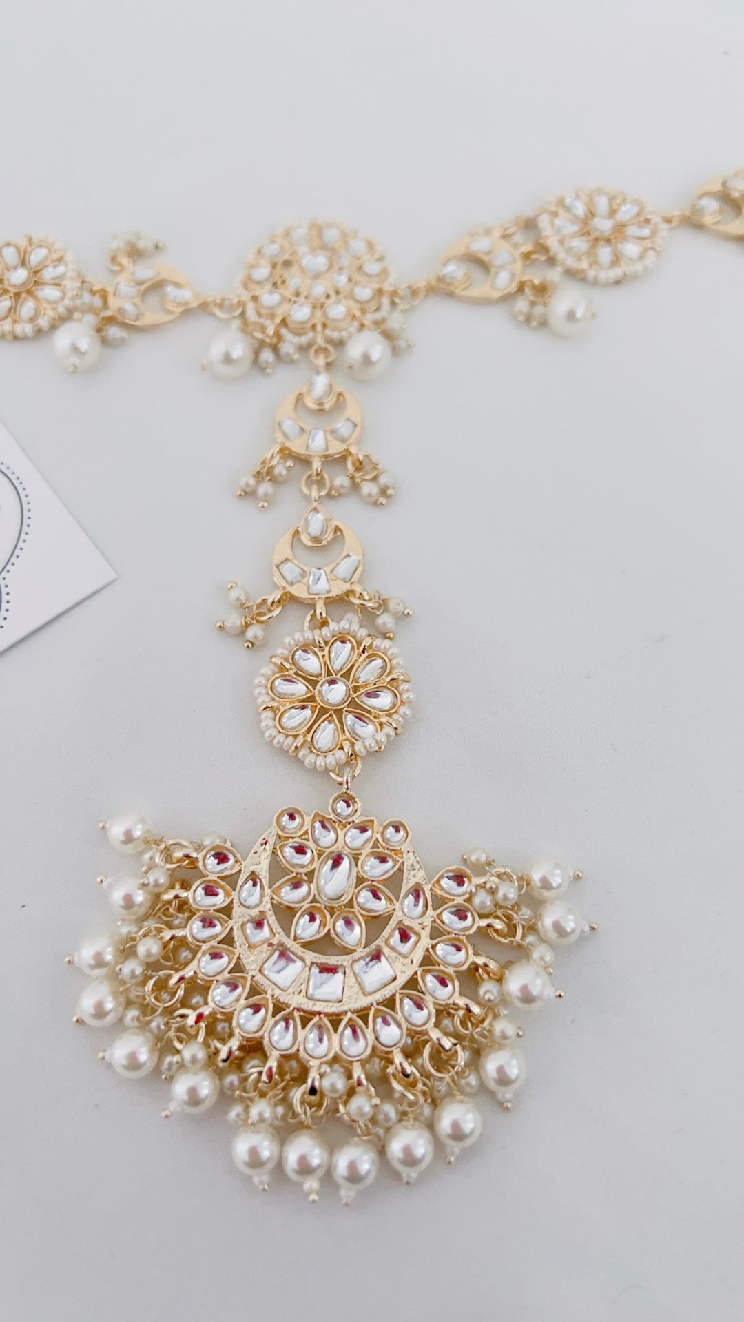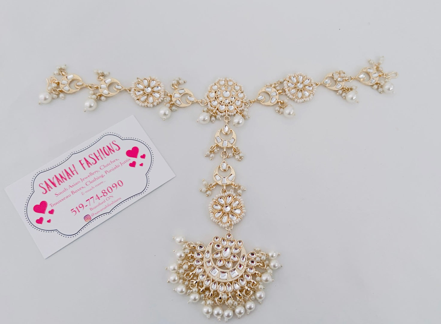 Alia Bhatt inspired sheesh phool with tikka, an elegant hair accessory featuring a hint of kundan.