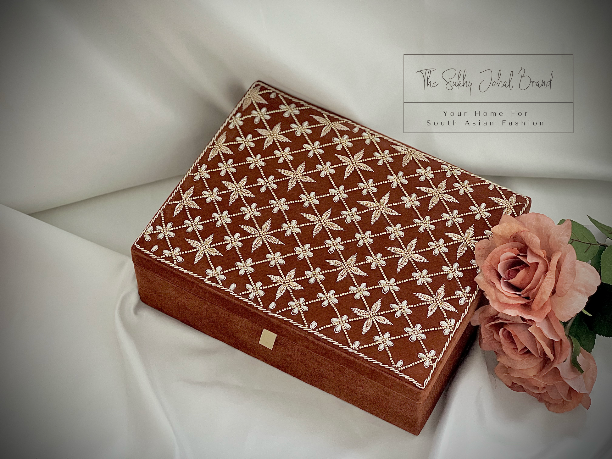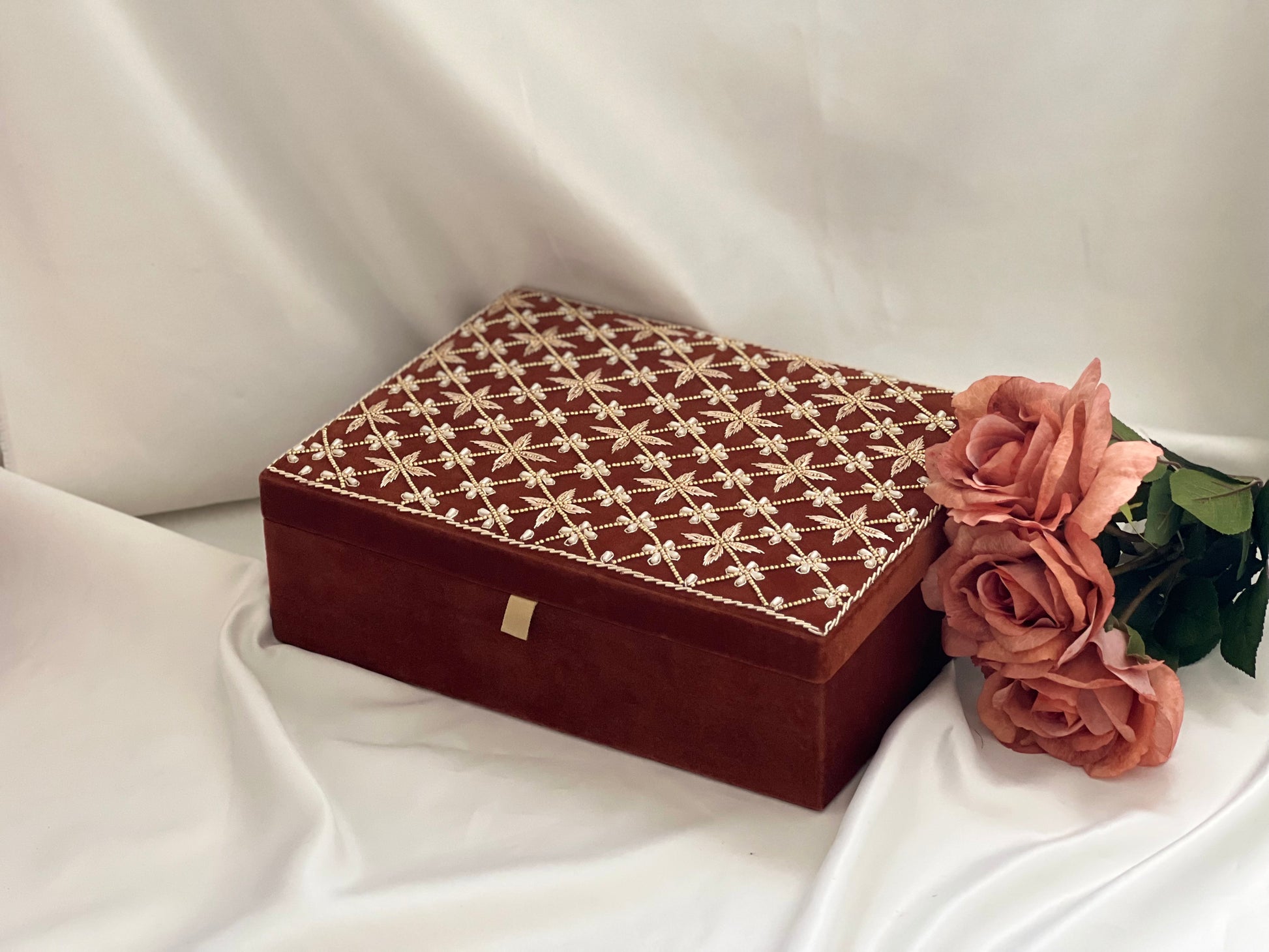 Meer trousseau box is our Meet bangle box but in a different size and for a broader purpose. I have made this design for clients many times but did not have the opportunity to keep it in stock. With my favourite season approaching (not Spring - that is my favourite too), I decided to colour this one golden brown in velvet fabric.