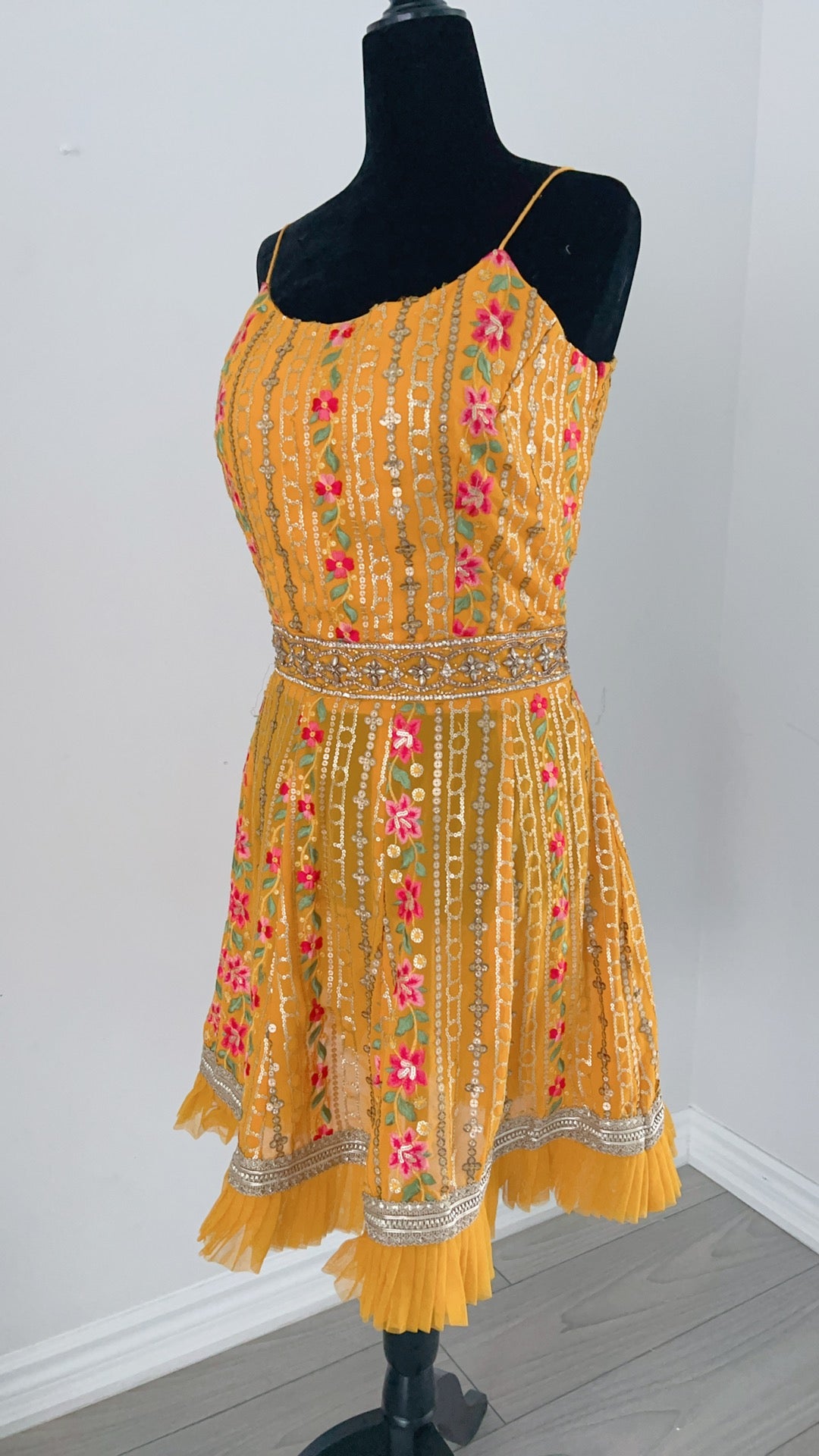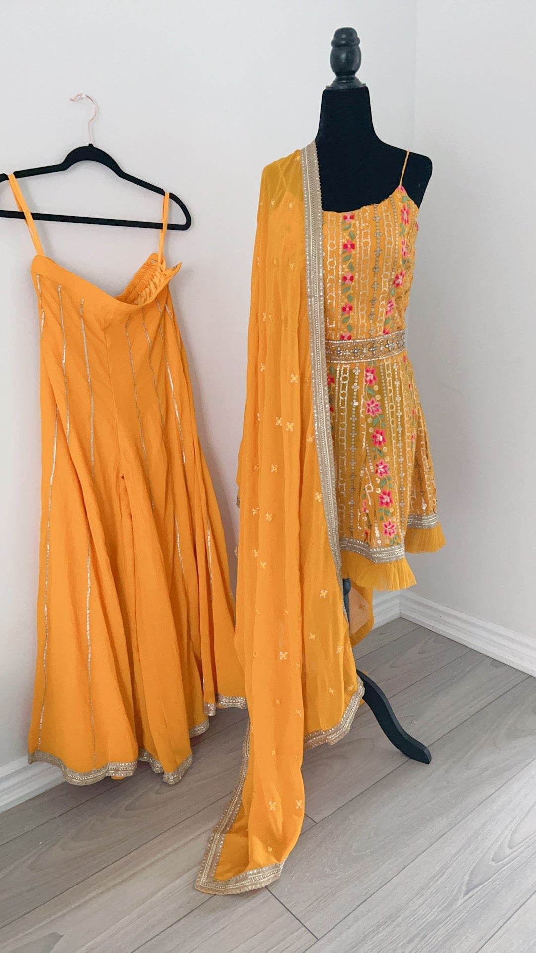 A pure fashion statement: embroidery all over the top (front and back) with net border, pure chinon dupatta and sharara. A great way to dress up for any summer occasion. Available in sizes 38-44.