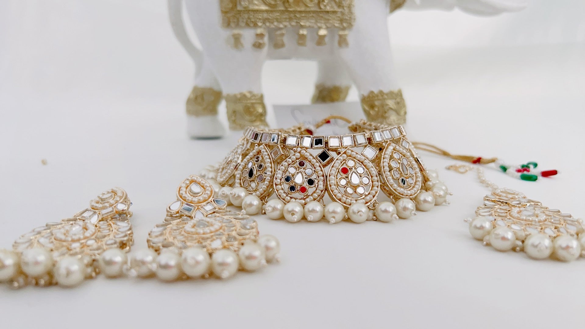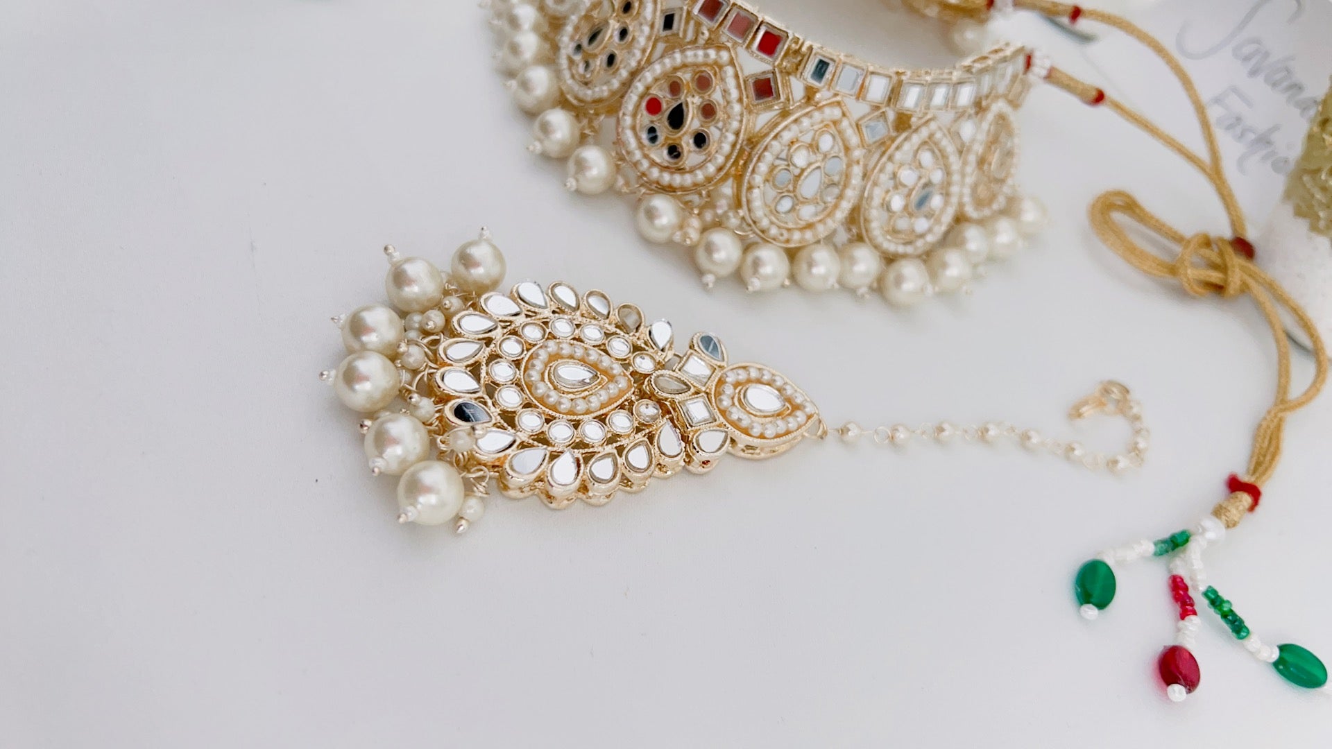 Mirror inspired set consisting of light weight earrings, tikka, and a necklace that can be worn beautifully as a choker.
