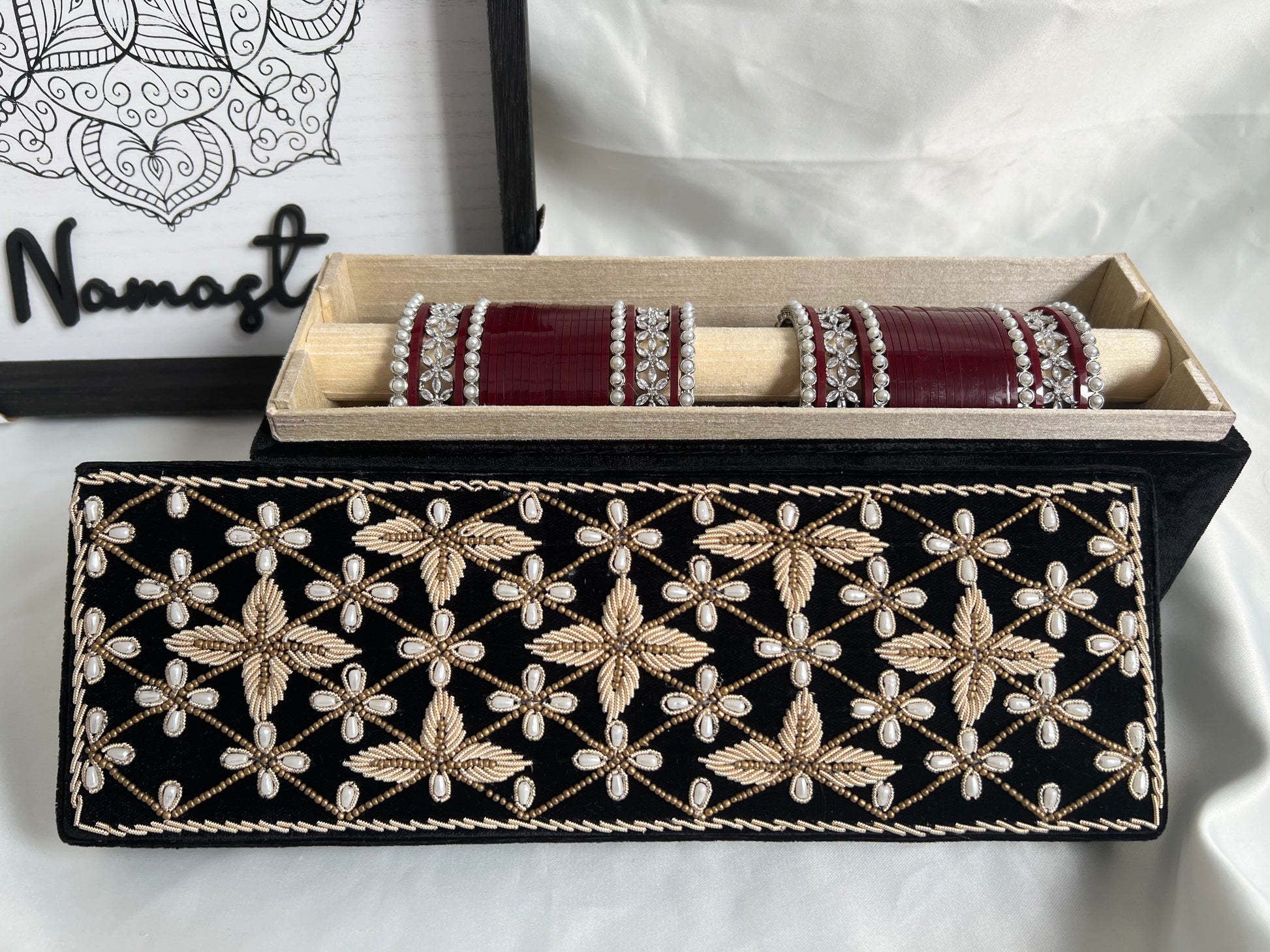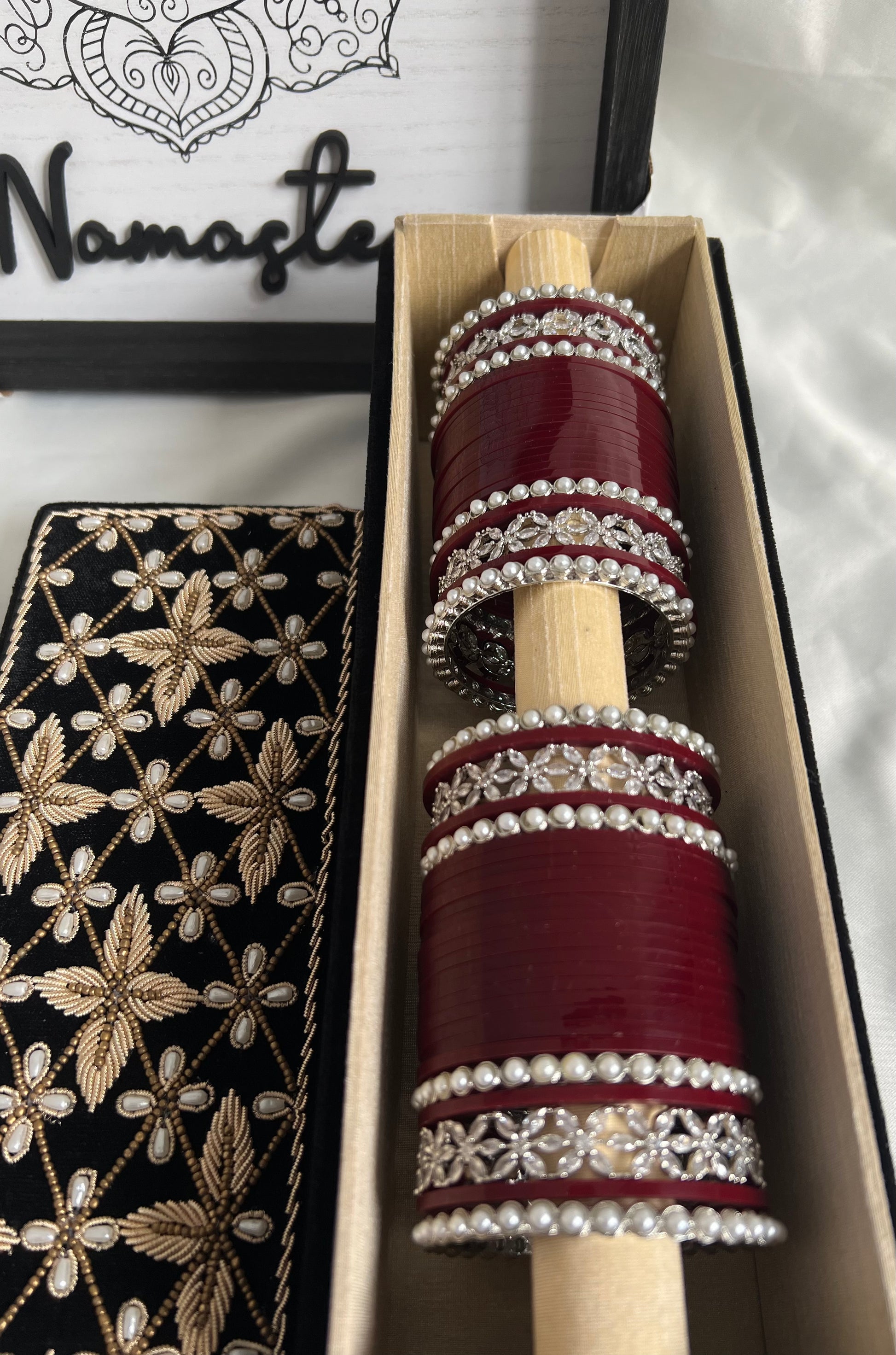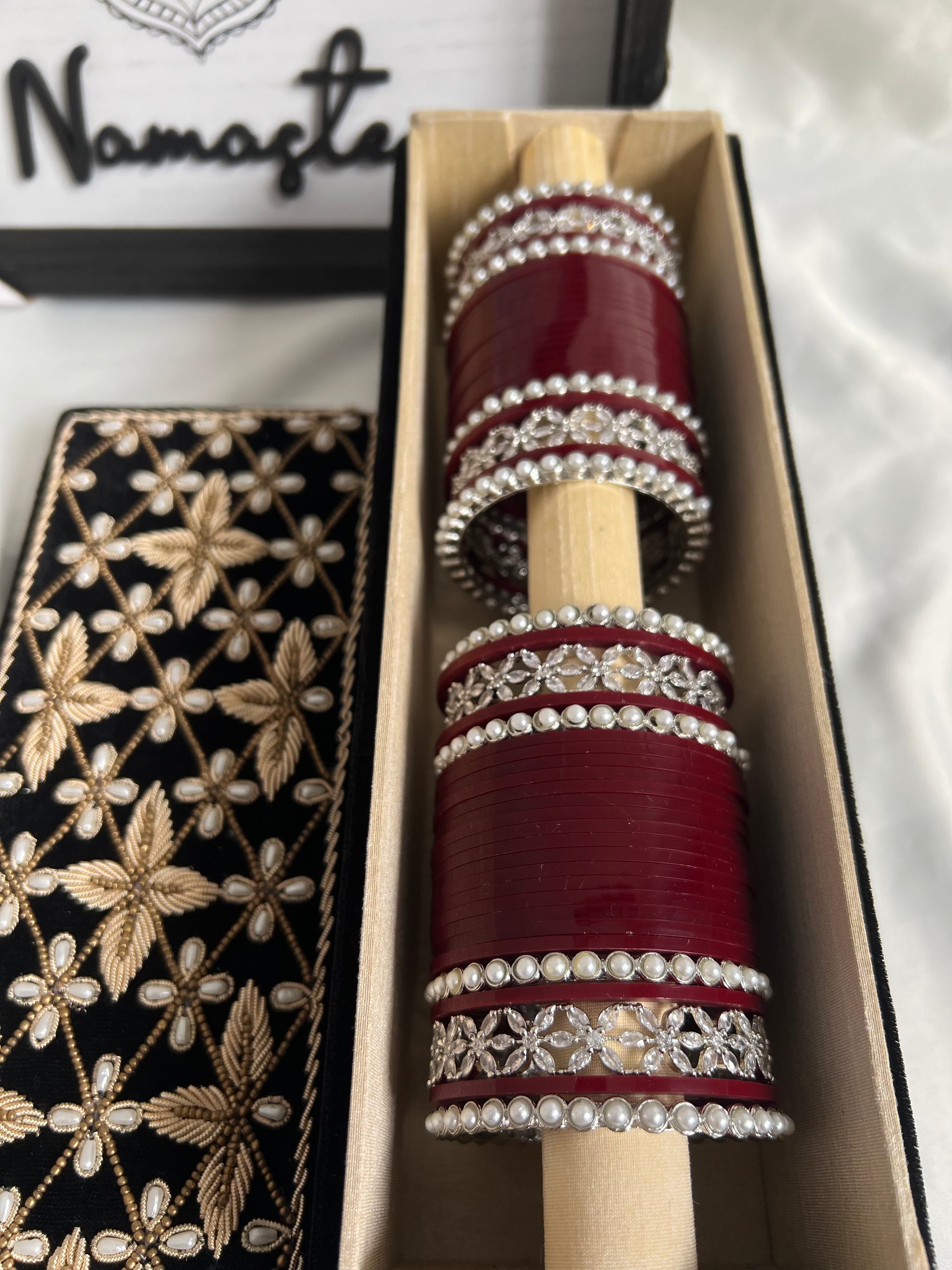 I made this design using silver pearl and stone bangles with a really dark shade of maroon chooda bangles.