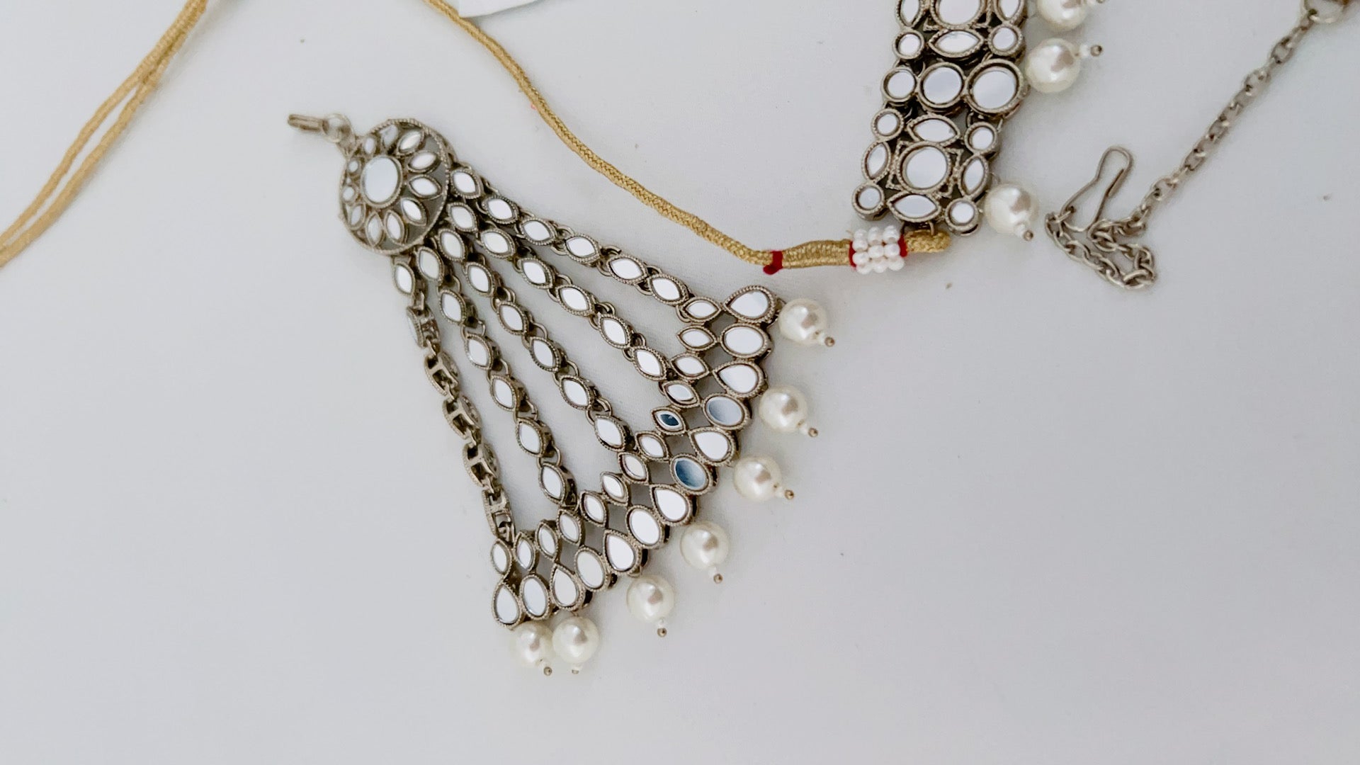 Full set includes: necklace, earrings, tikka, and jhoomar.