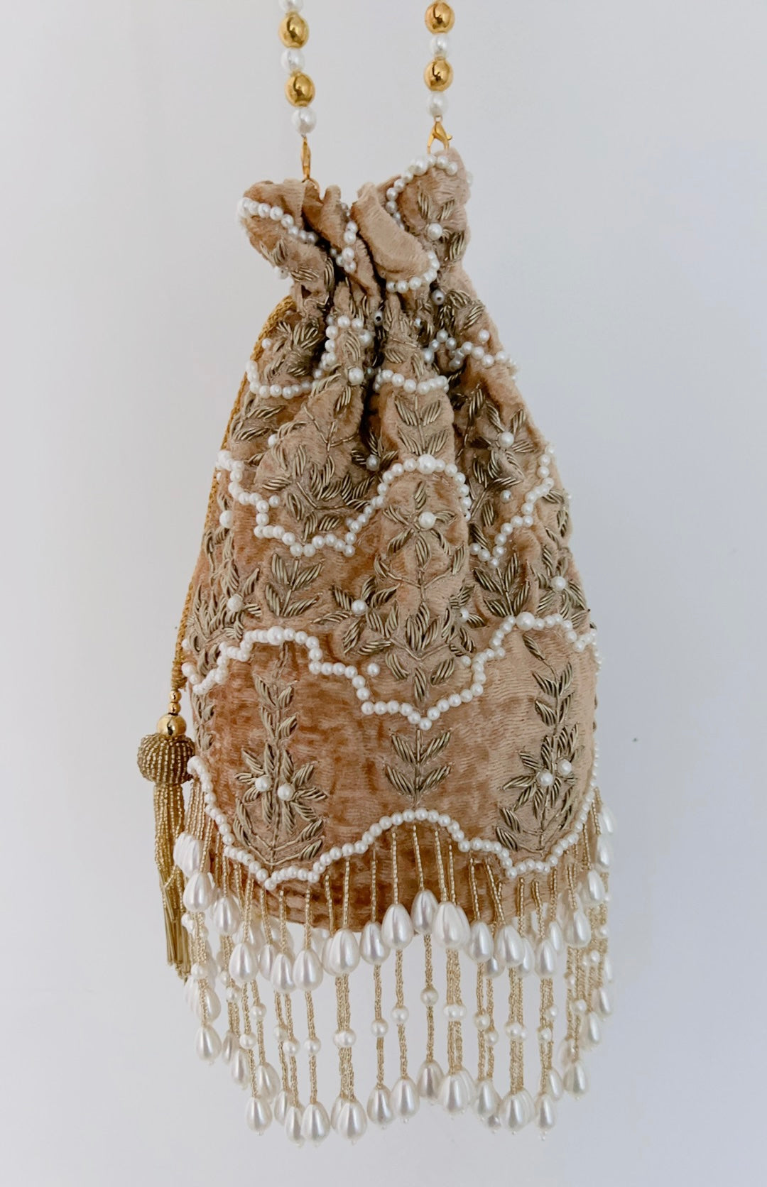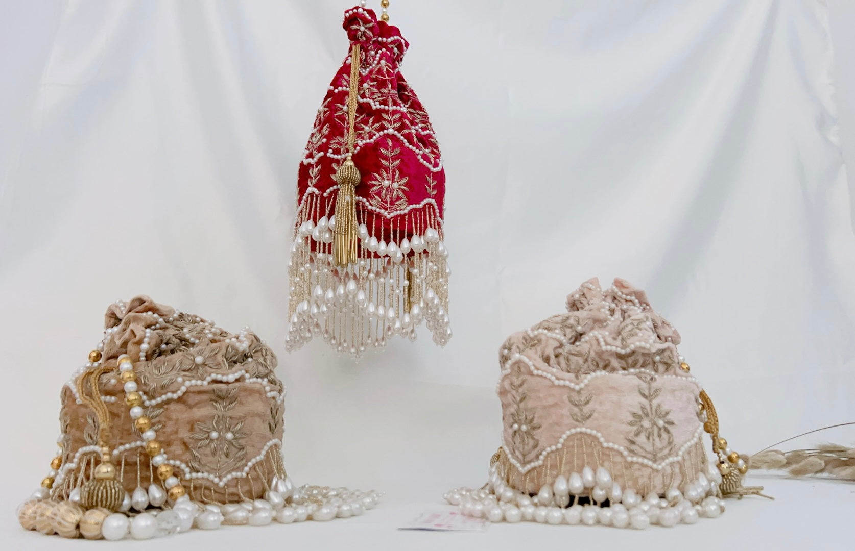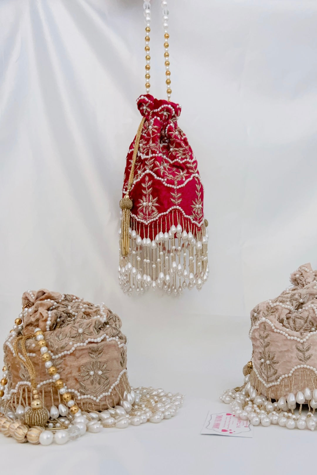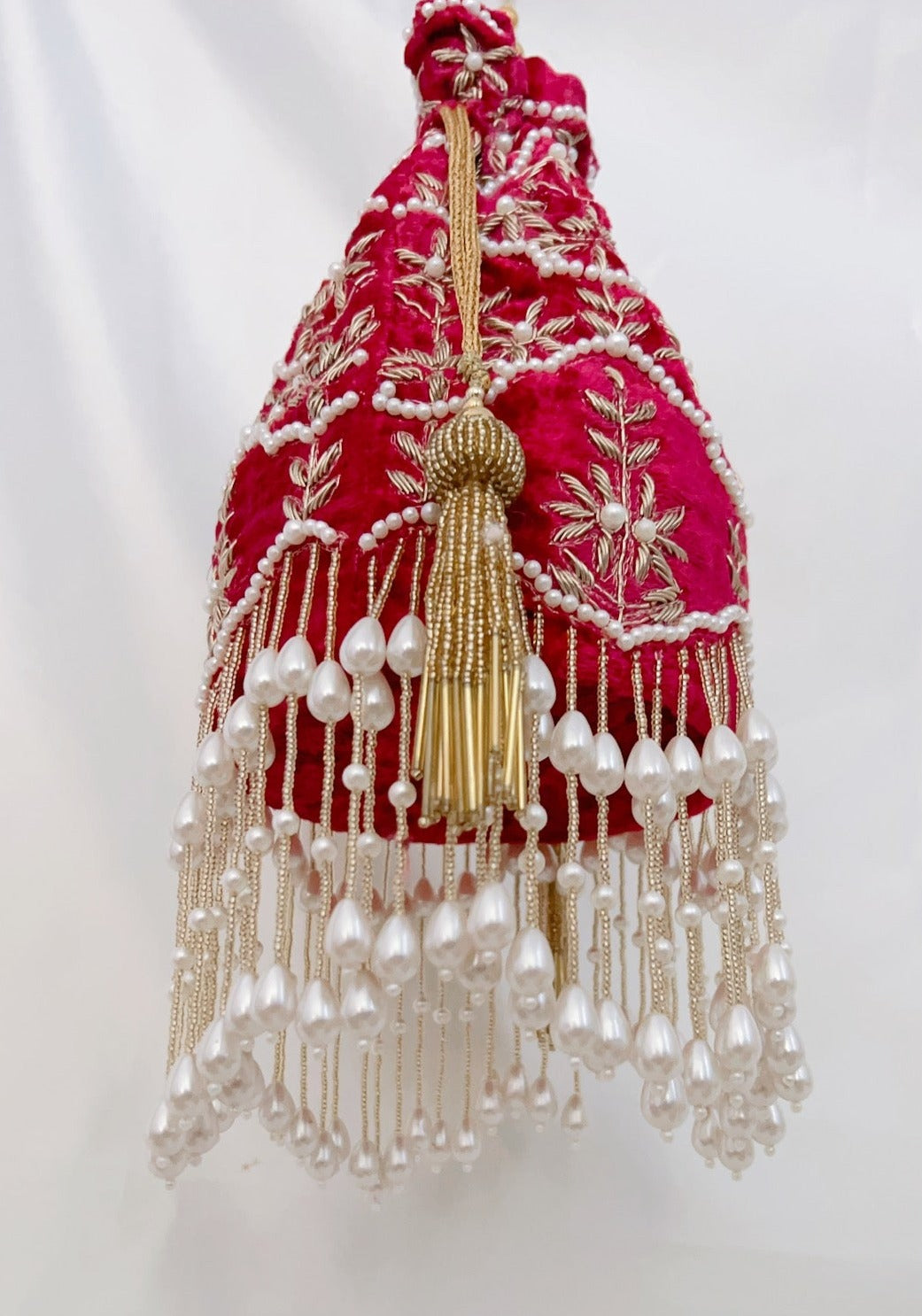 For this design we used superior material only from the fabric to the pearls. The pearls are double polished, high quality that will not change colour over time or peel off. The fabric of the potli is velvet, double cushioned with a solid bottom that allows it to sit alone.