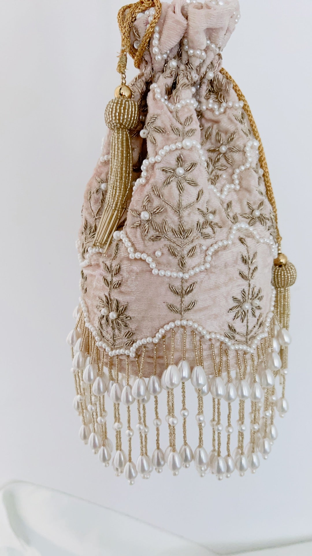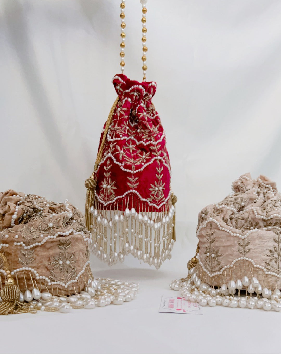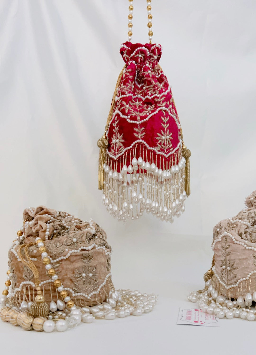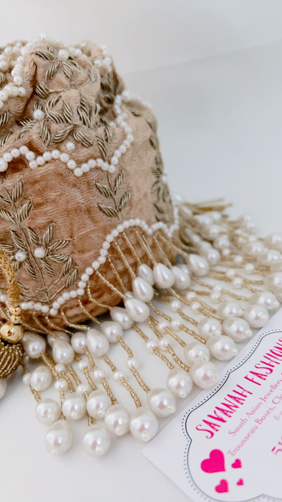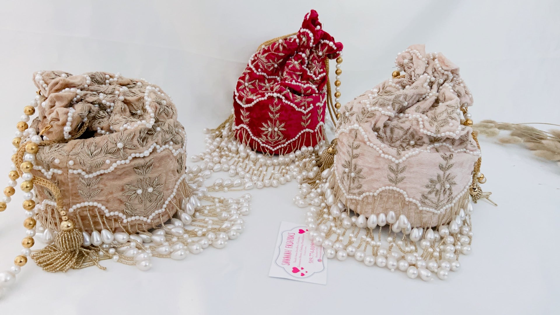 For this design we used superior material only from the fabric to the pearls. The pearls are double polished, high quality that will not change colour over time or peel off. The fabric of the potli is velvet, double cushioned with a solid bottom that allows it to sit alone.