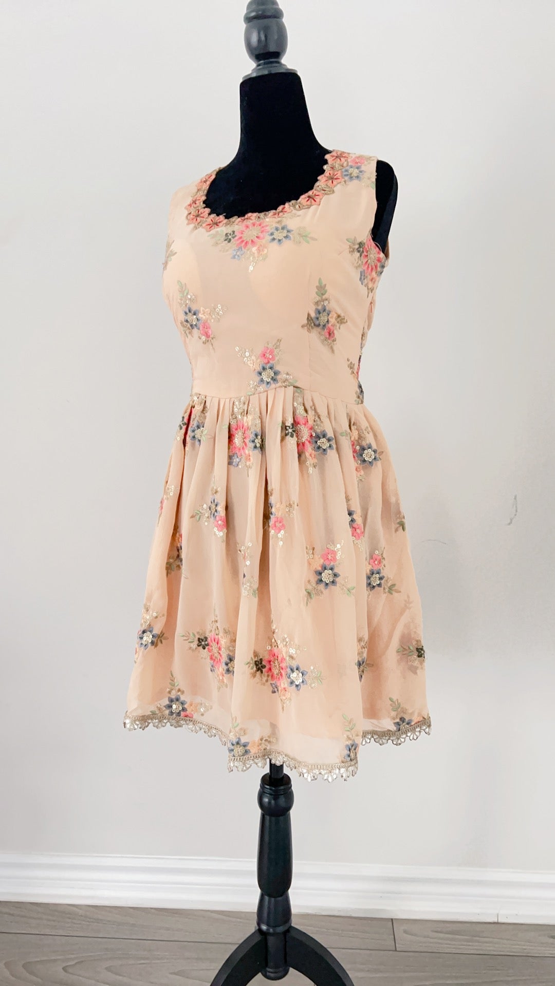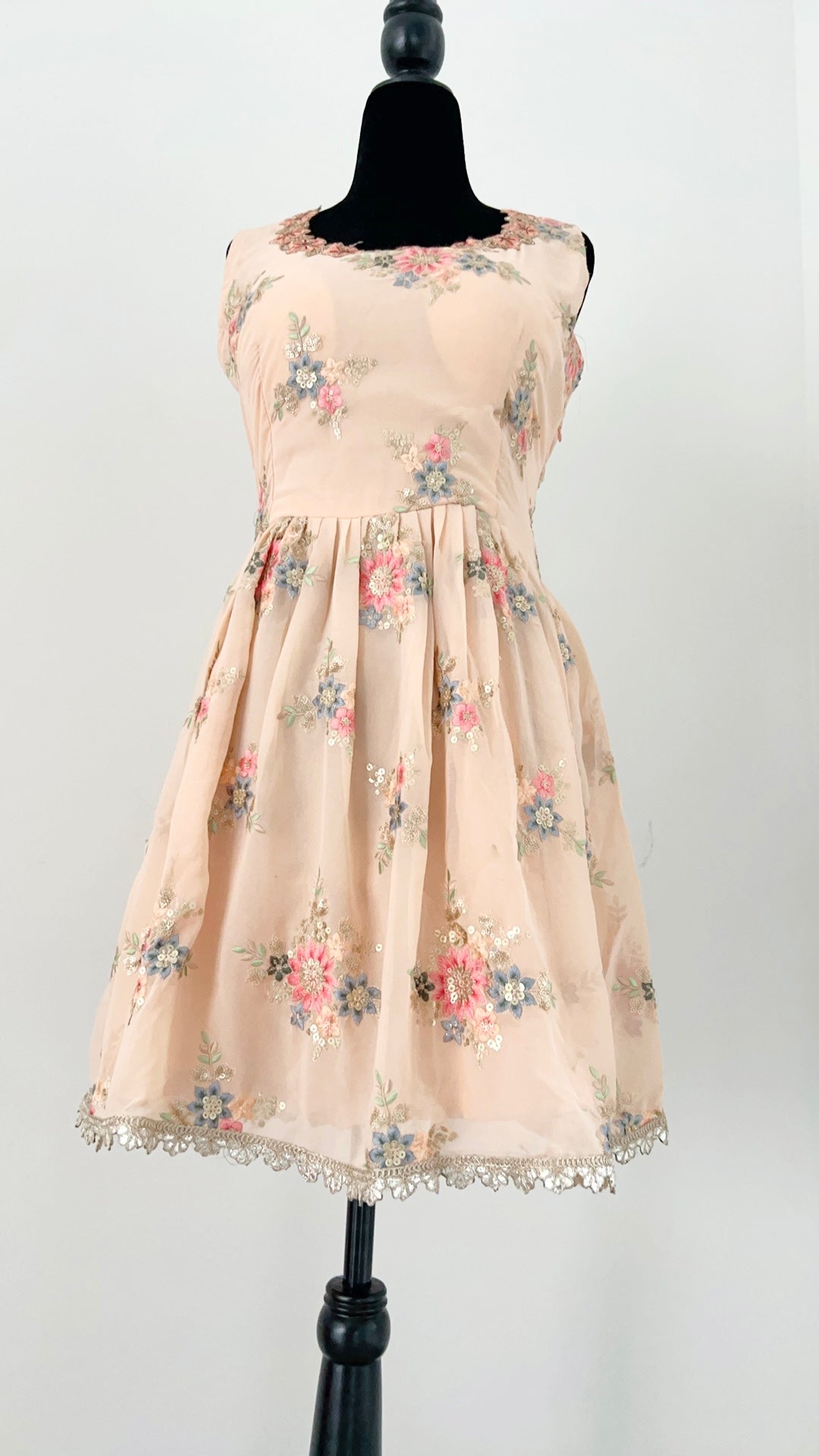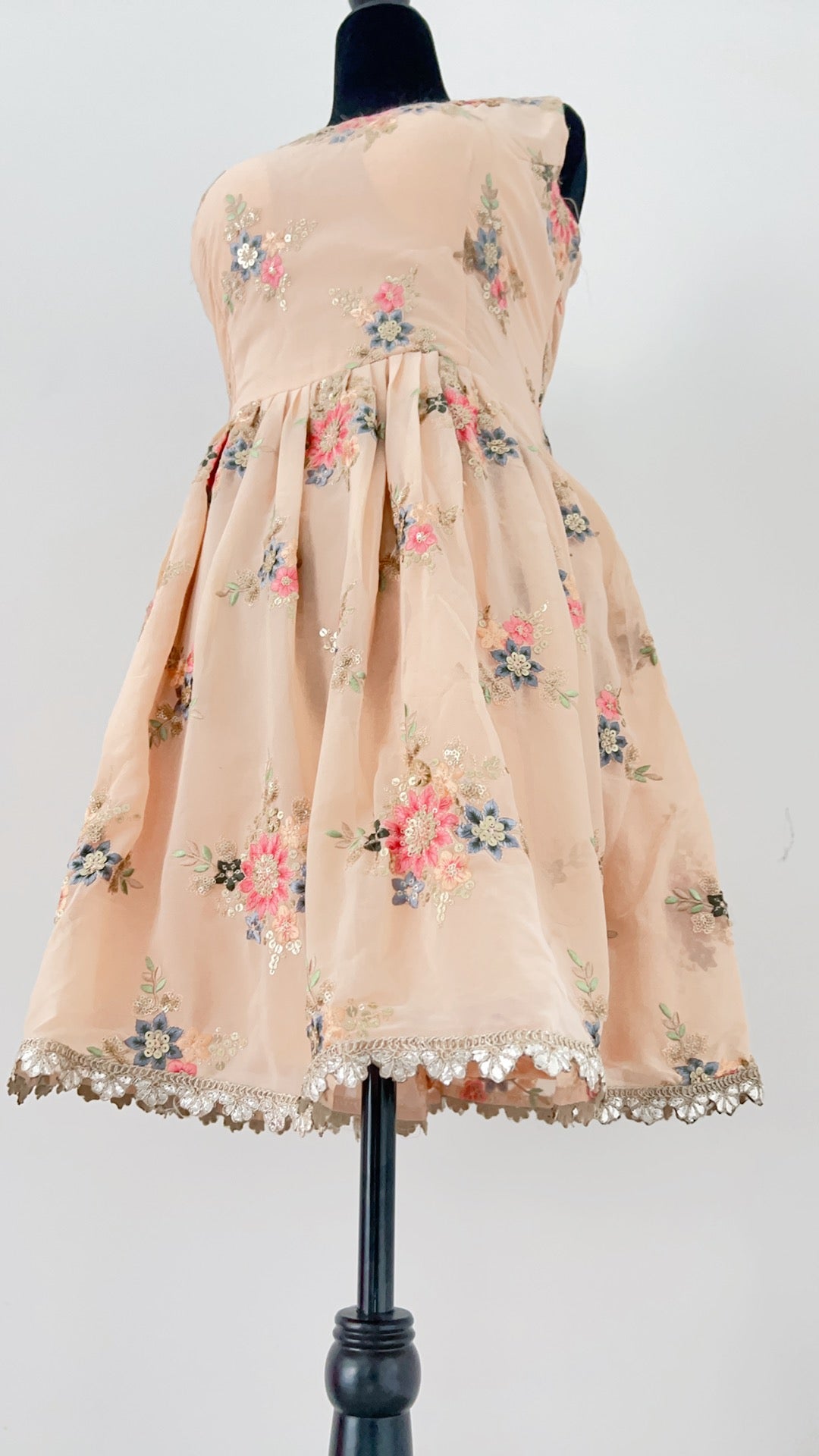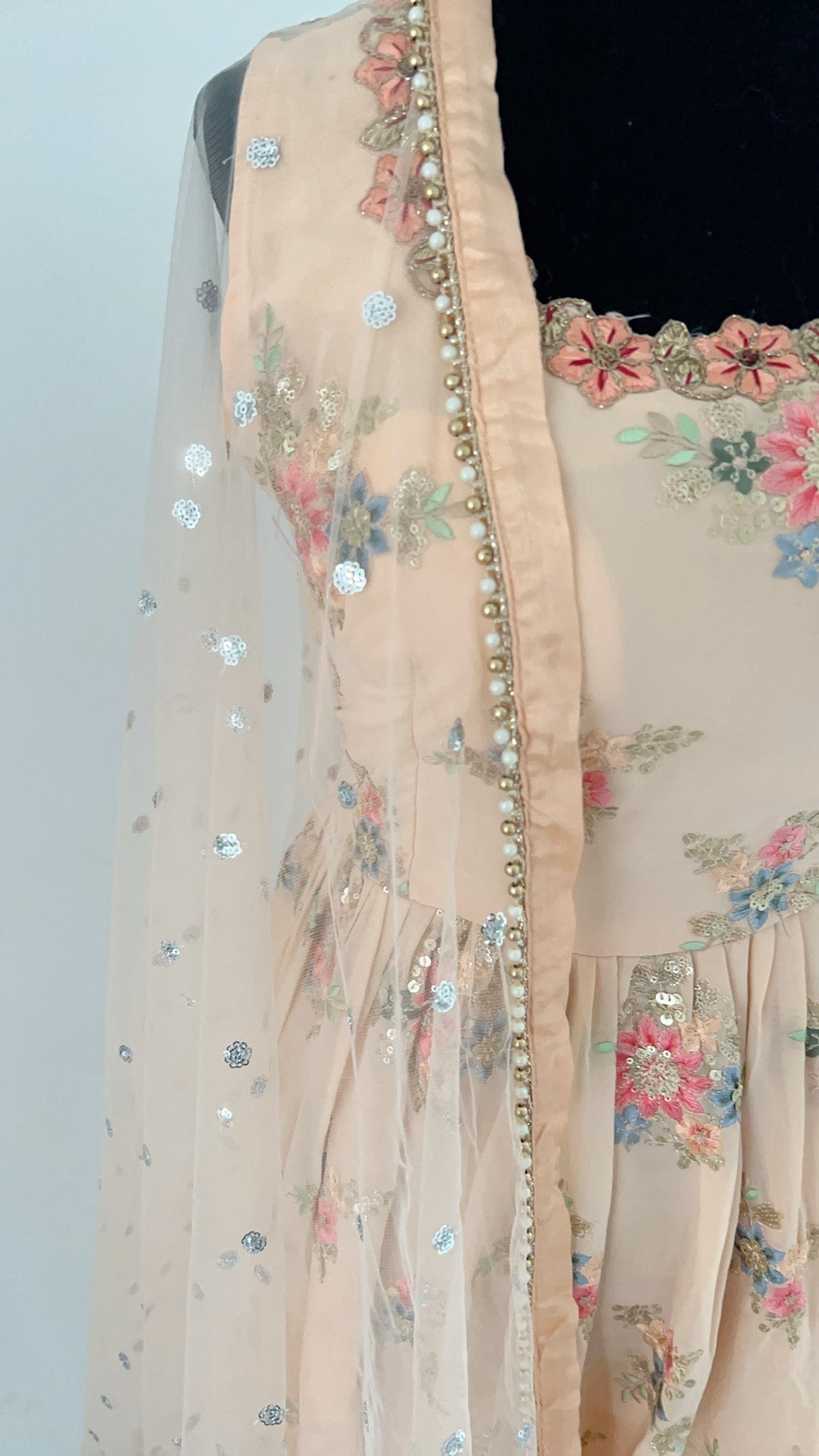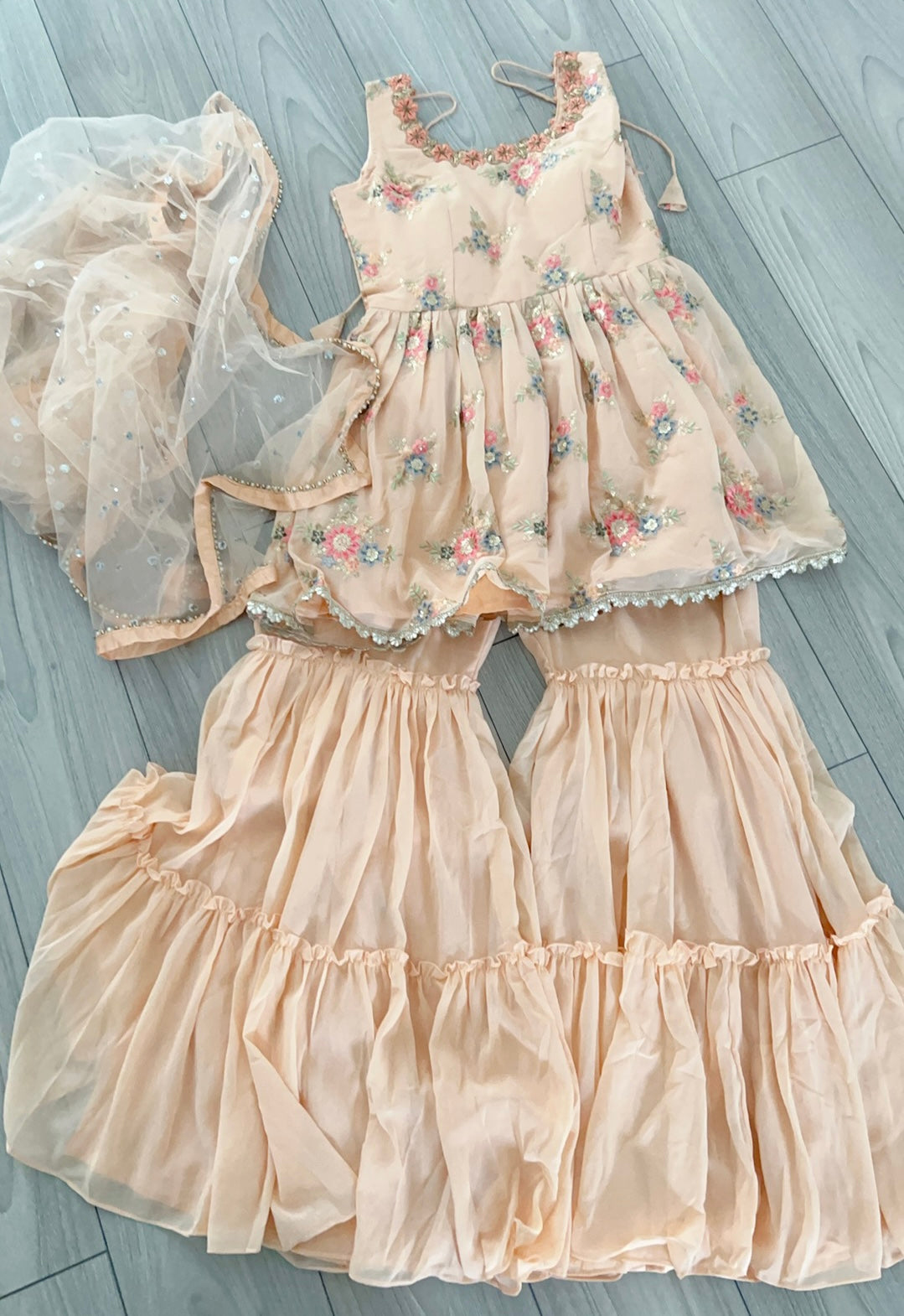 Soft peach is the colour! Baby doll chic style suit comes with soft net dupatta and sharara. Made on pure fabric with attention to detail. Available in sizes 38-44.