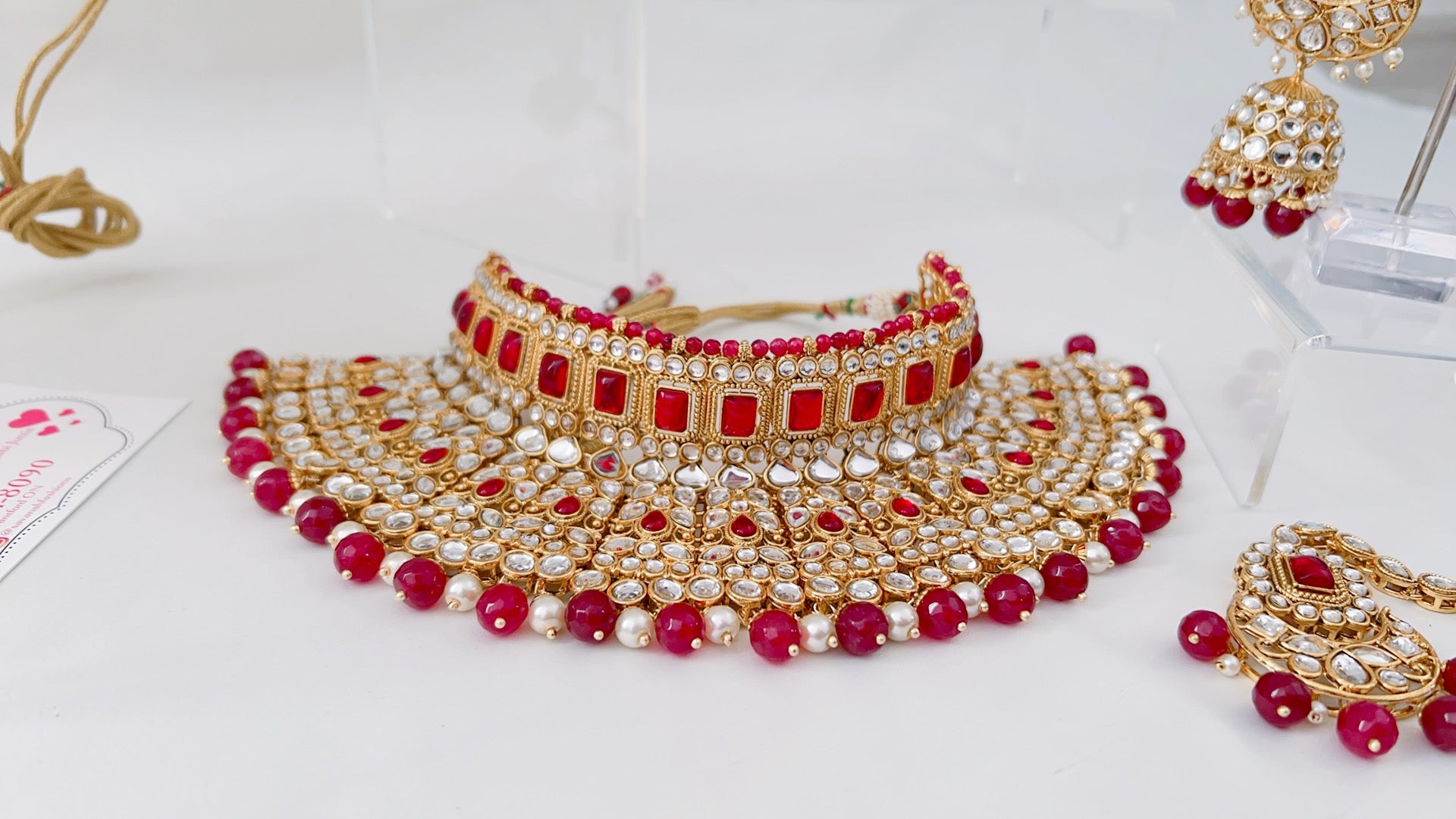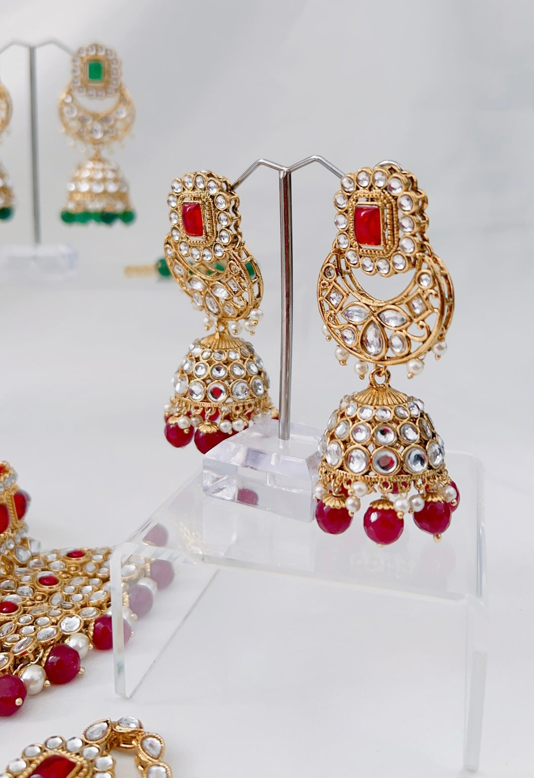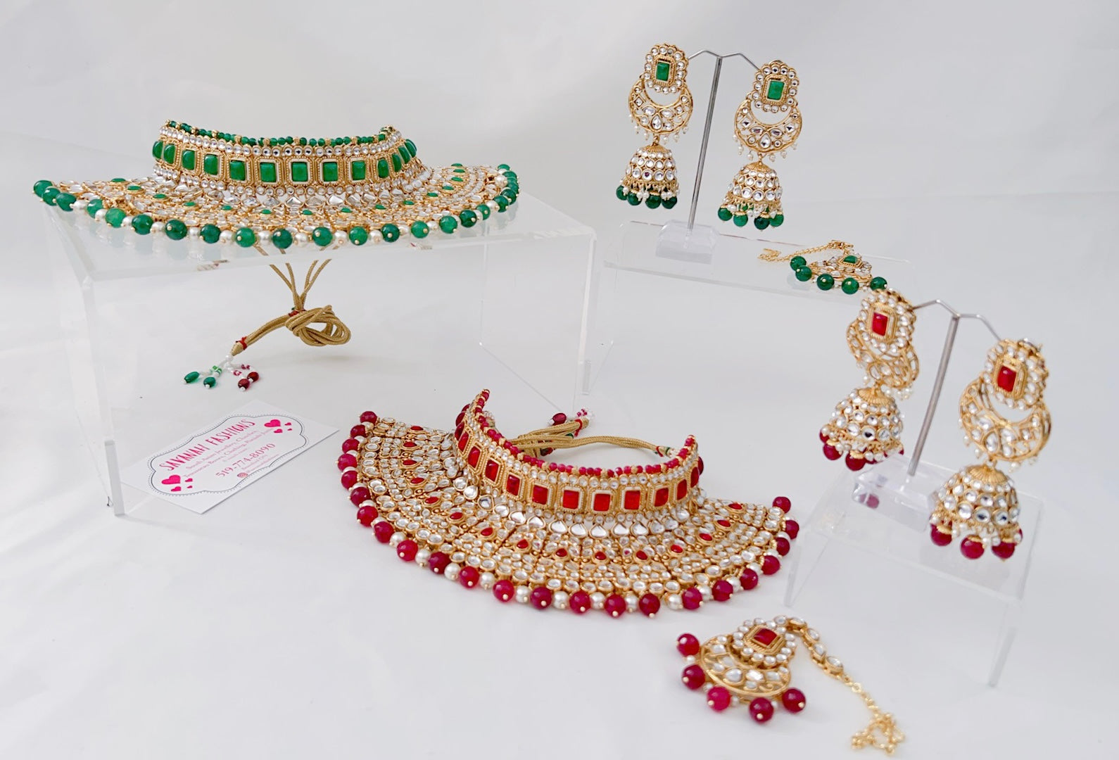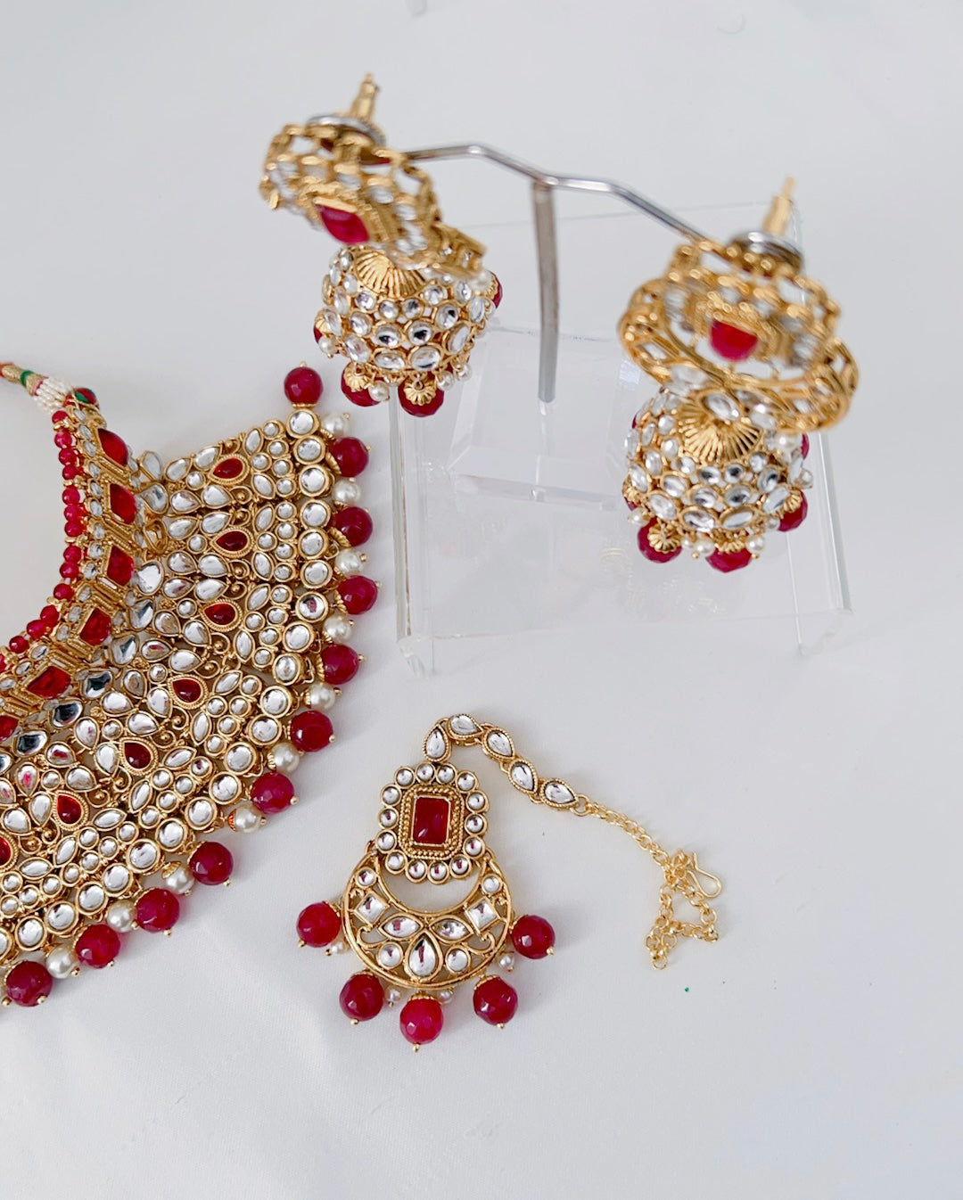 Full set includes: choker, earrings, and tikka on a kundan base with red pearls.