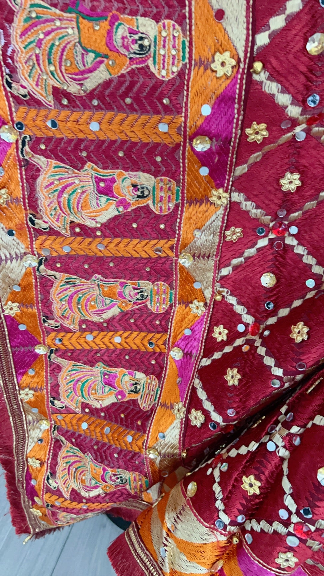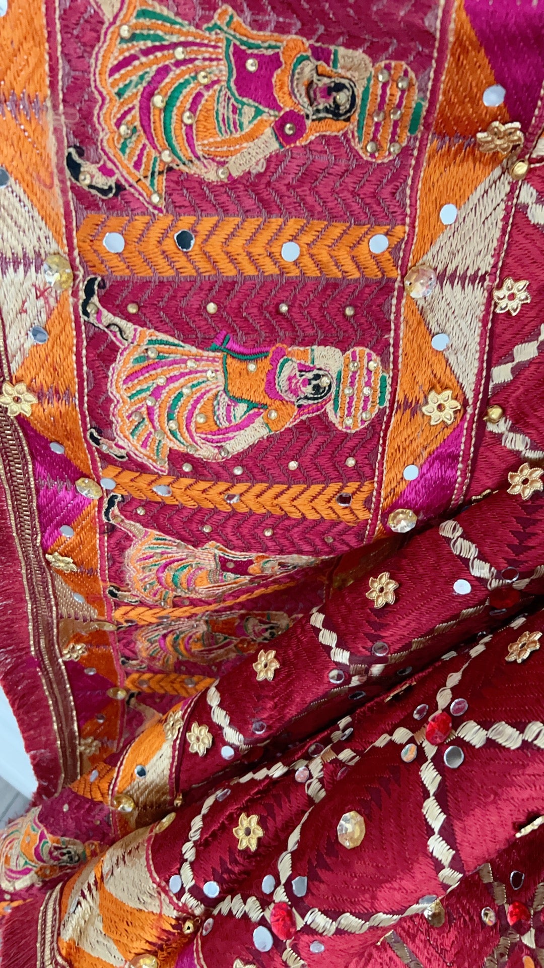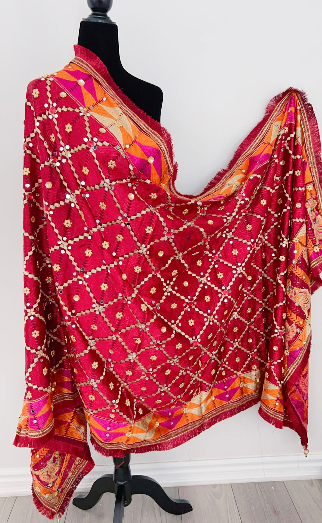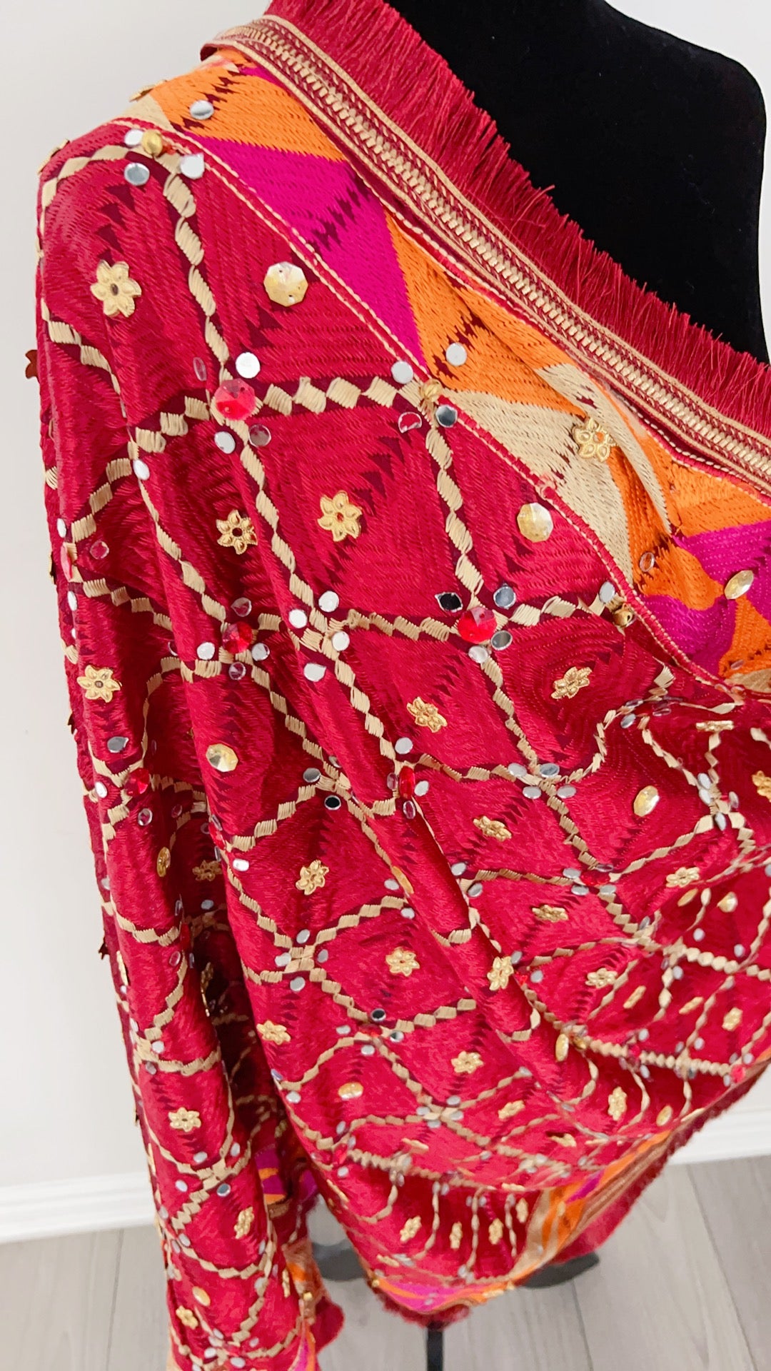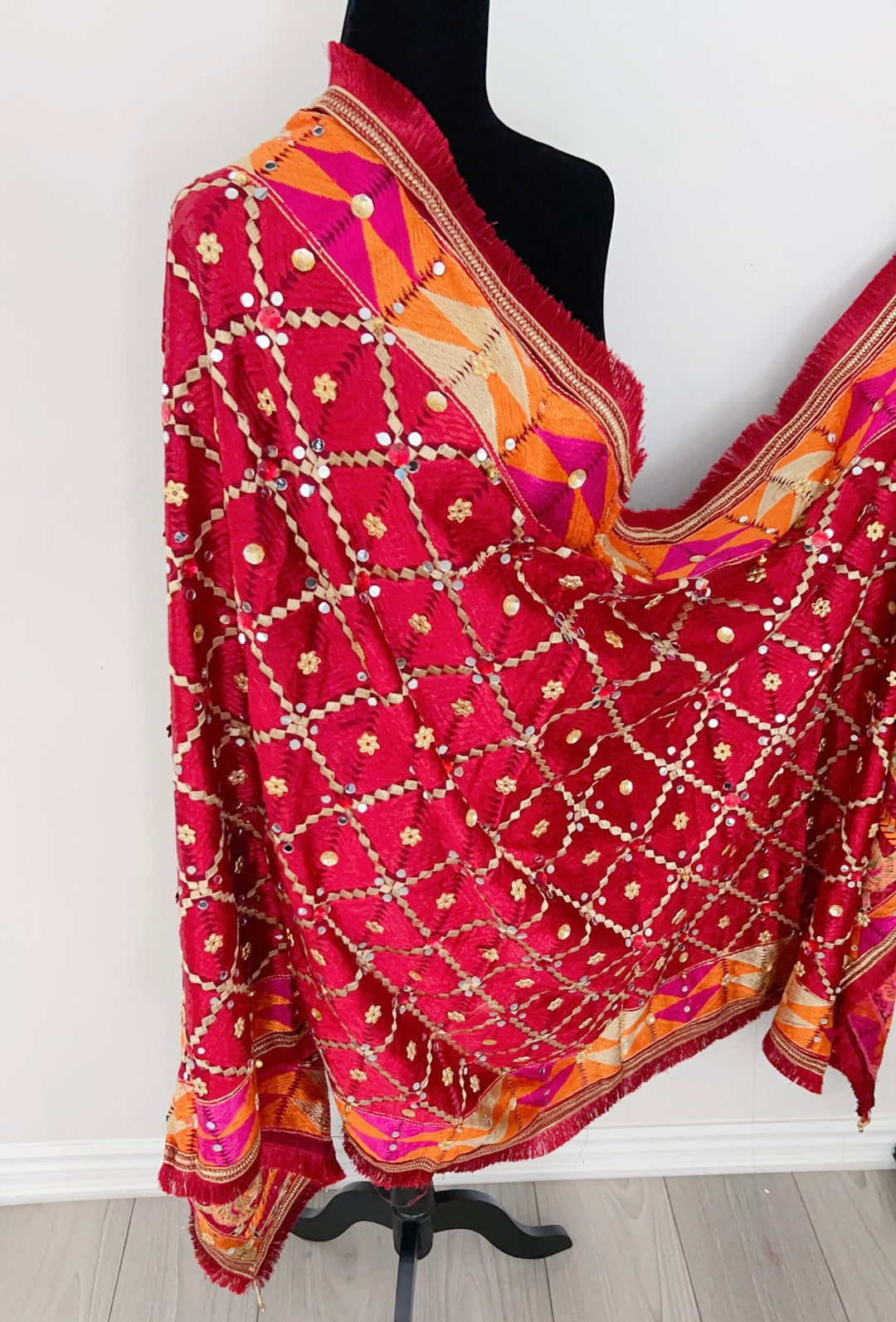 Heavily embroidered phulkari dupatta. This versatile dupatta can be matched with a plain suit for the ultra glam style; ideal for a party or bridal photoshoot; as a Maiyan chunni decor for the bride or groom.