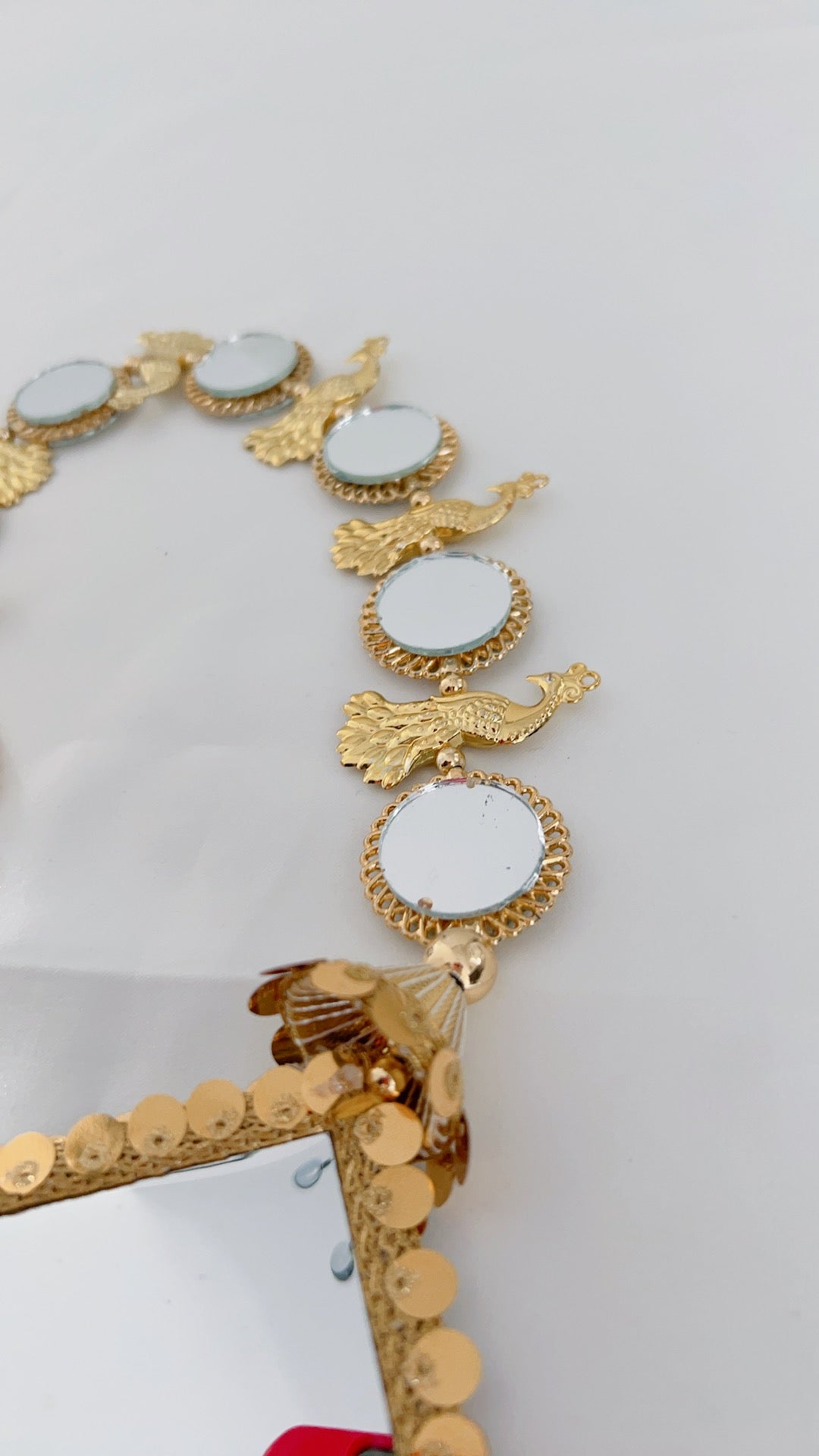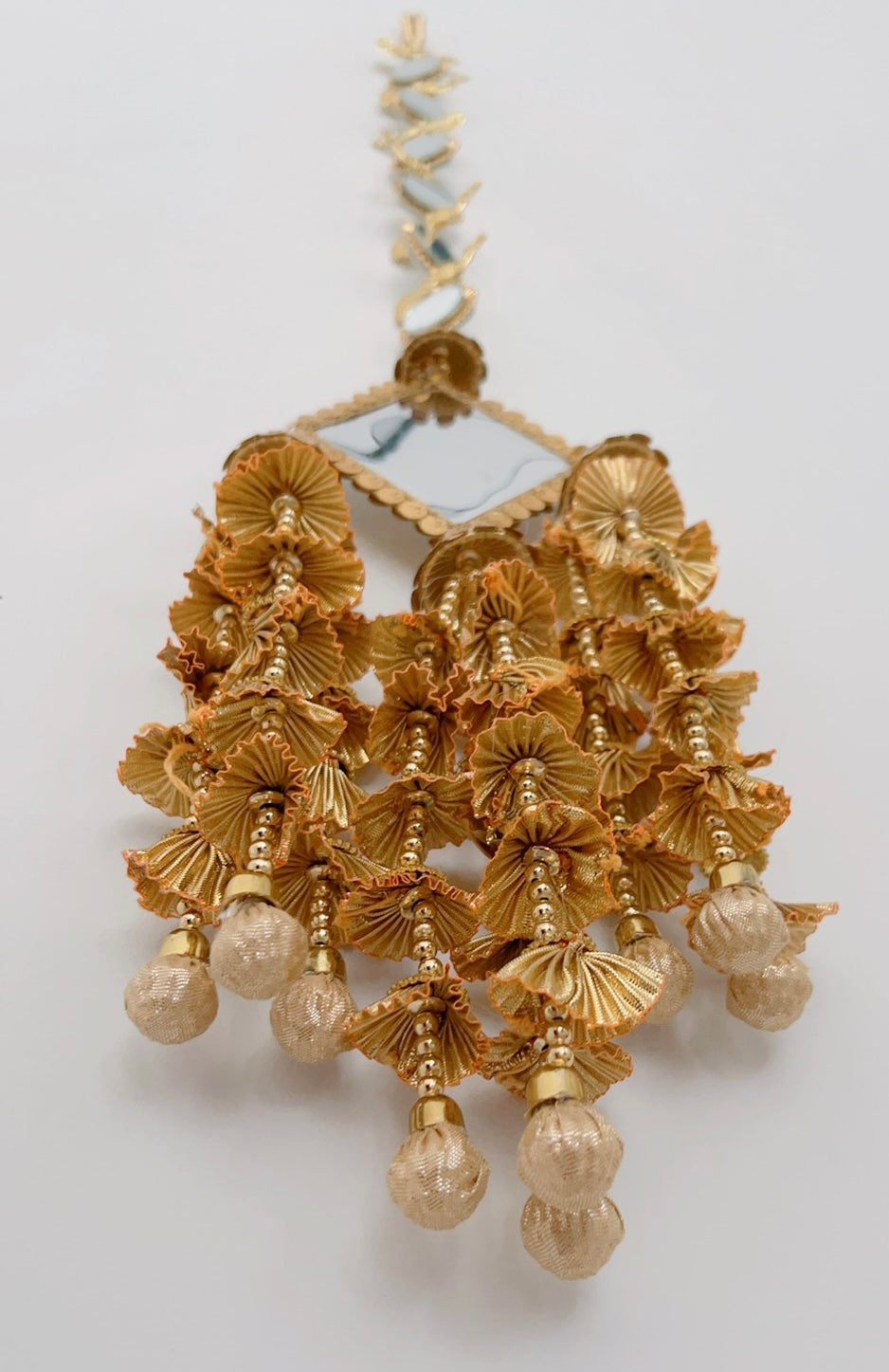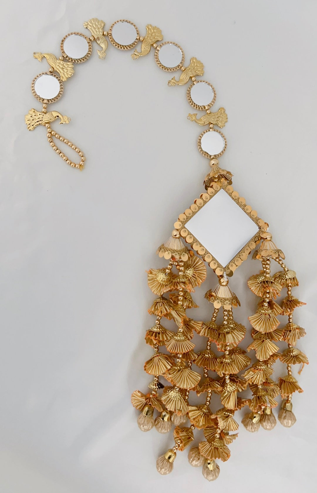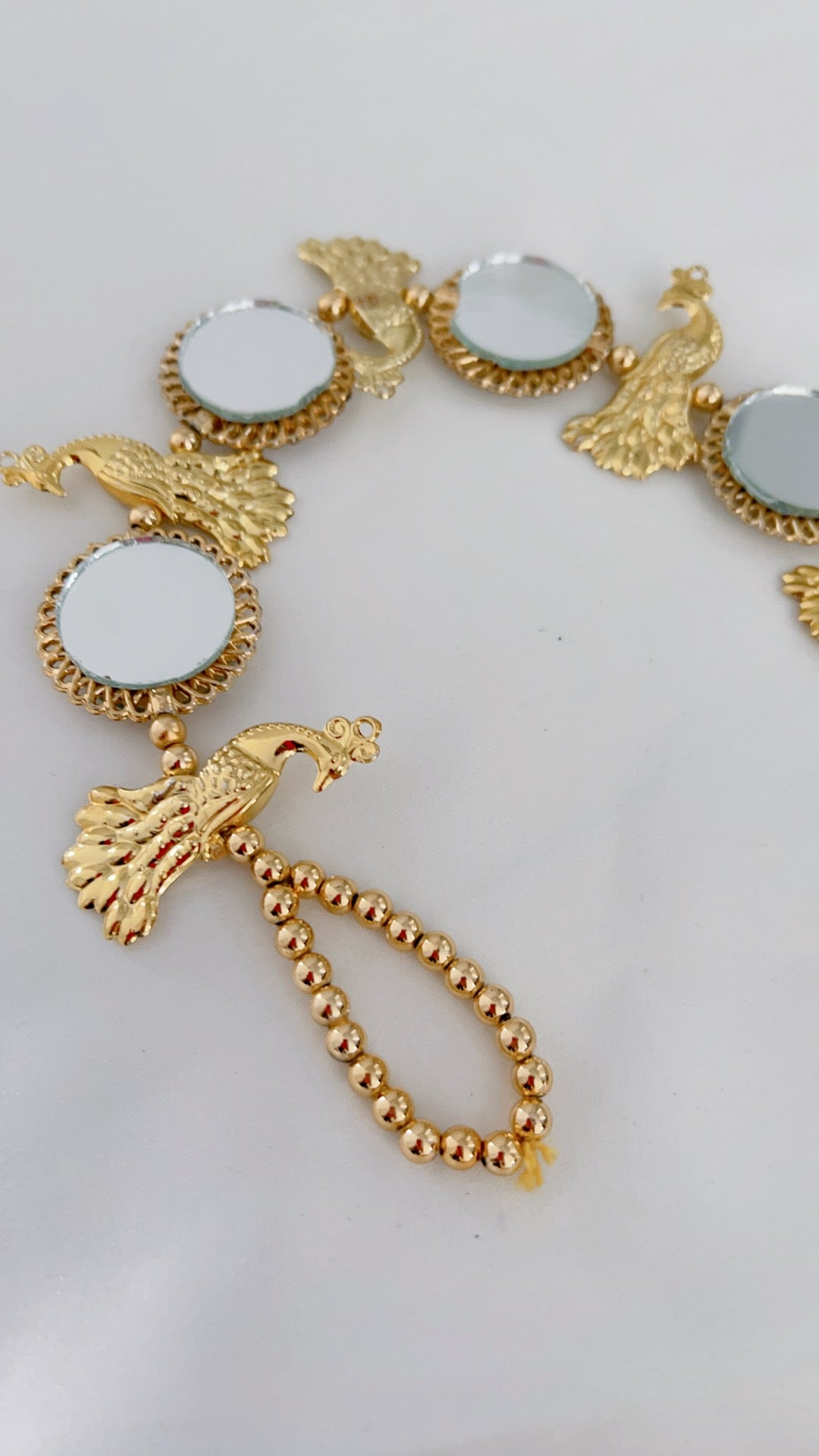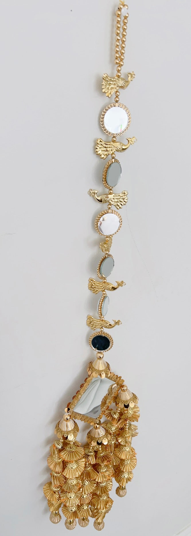 Full braid mirror work and peacock design paranda in gold.