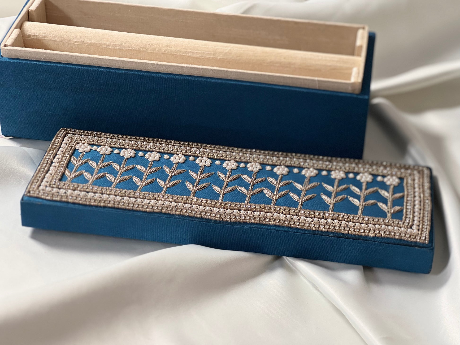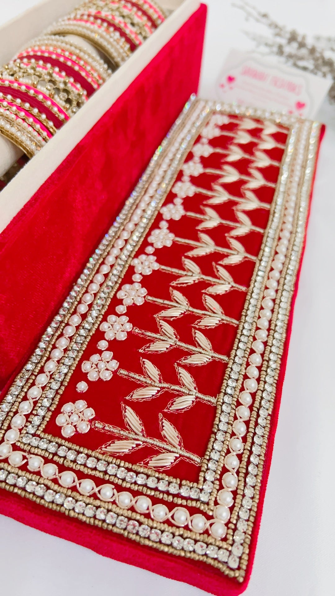 Our Pari bangle box consists of detailed hand embroidery on high quality velvet fabric with suede or silk interior. This was created by keeping in mind the design that our bride Priscilla wanted for her wedding theme, floral. We incorporated our Jazmyn clutch design florals to be side-by-side on the lid of this bangle box.