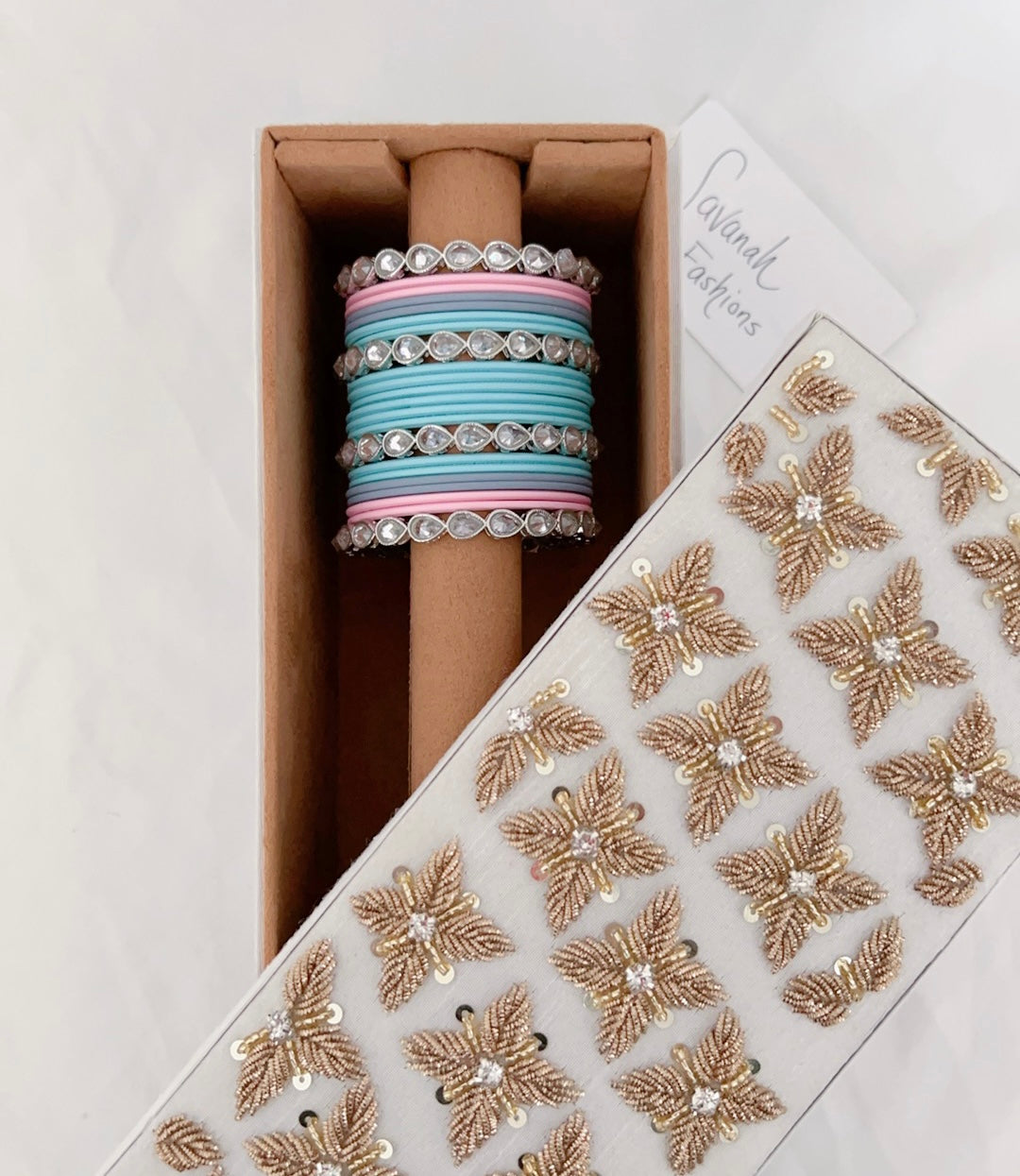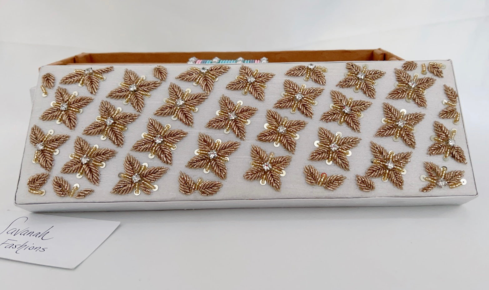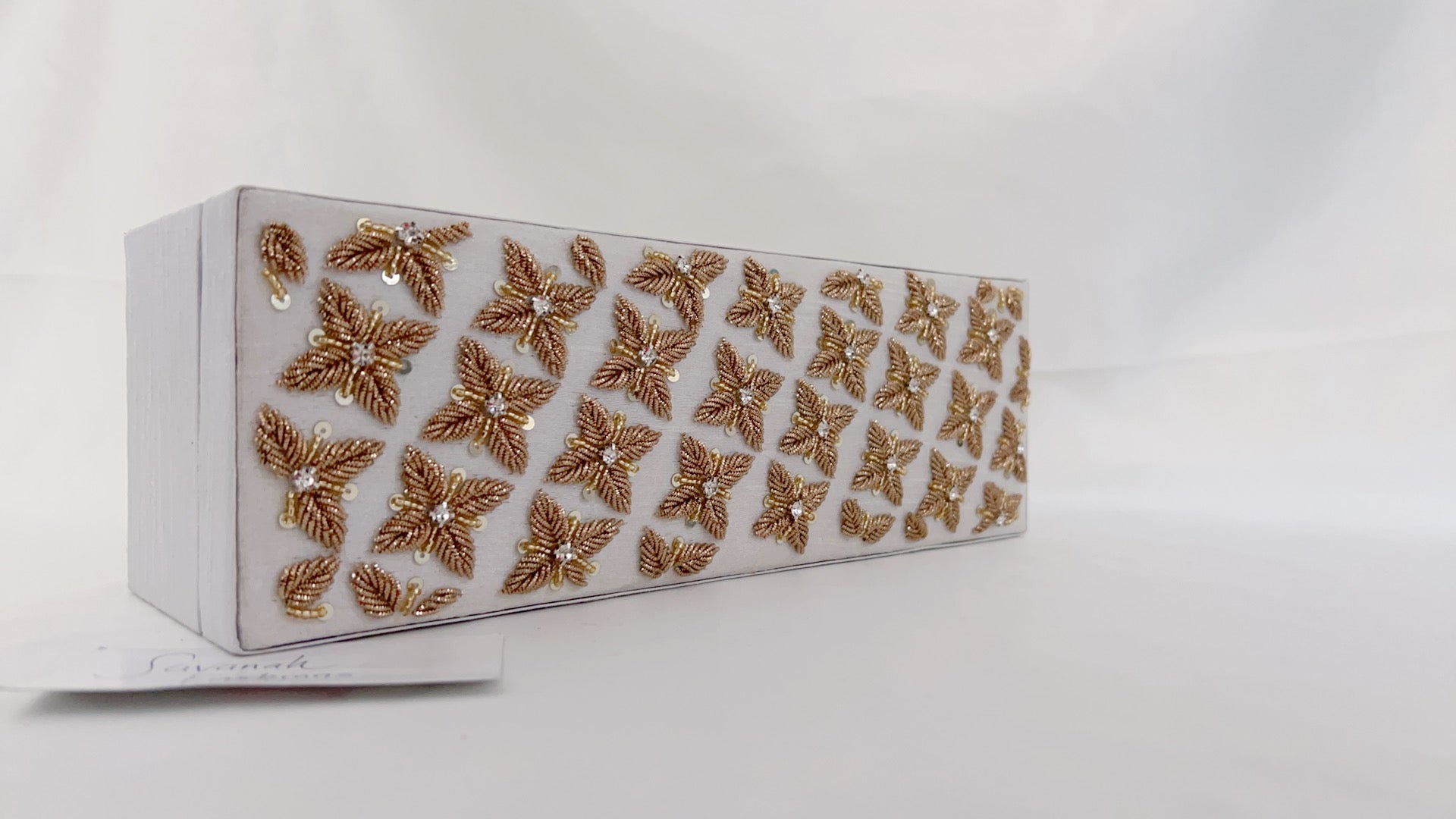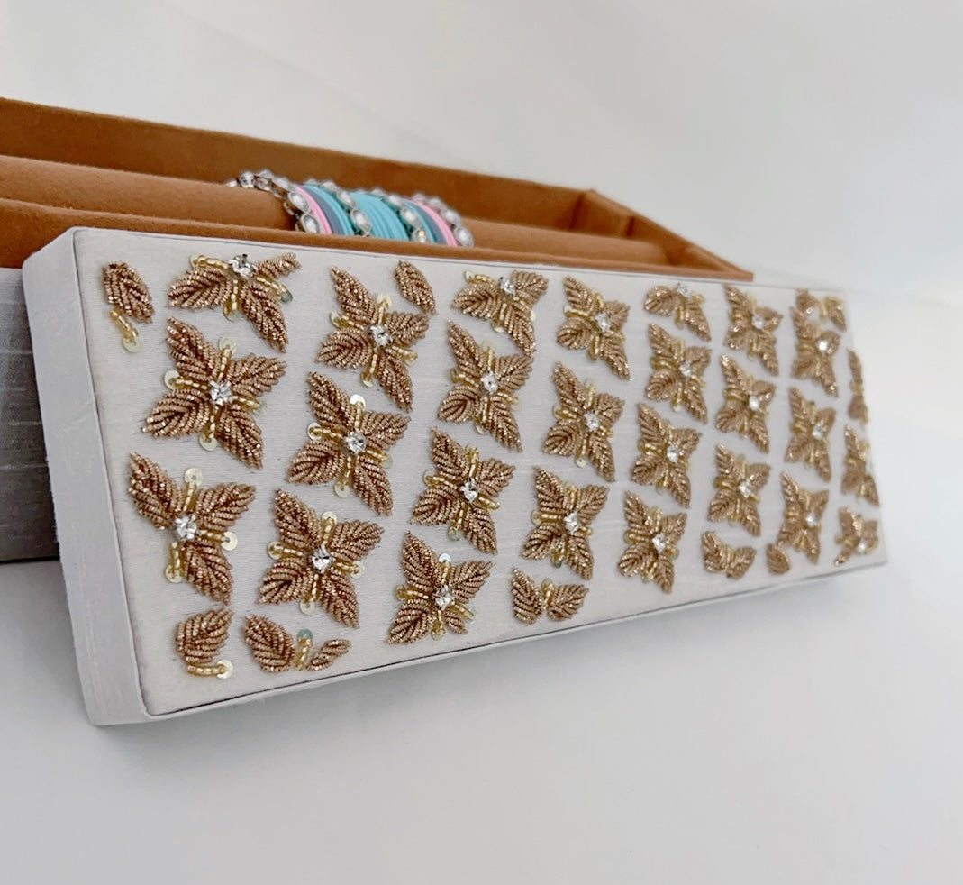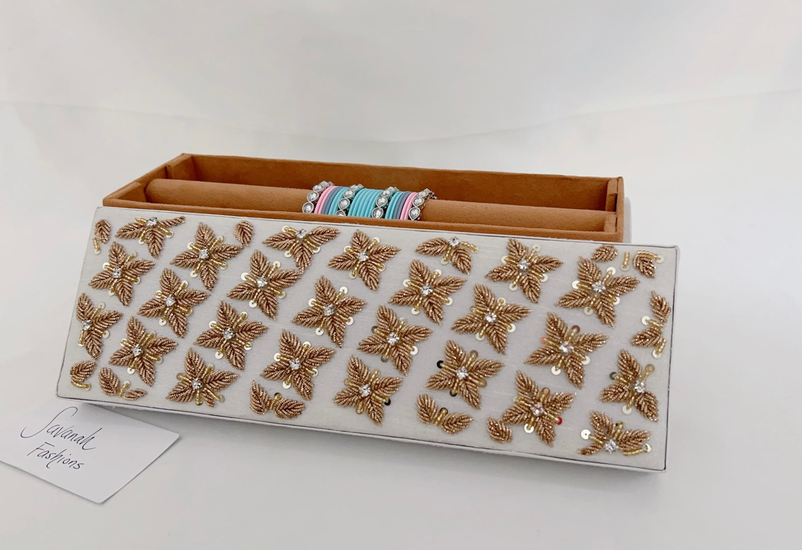 Exclusively designed by Savanah Fashions, hand crafted with high quality exterior and suede interior. This hand embroidered design makes for a perfect keepsake of your expensive bangles or a great gift for any bride. Our bangle boxes can be made in any colour with your personalized name or hashtag.