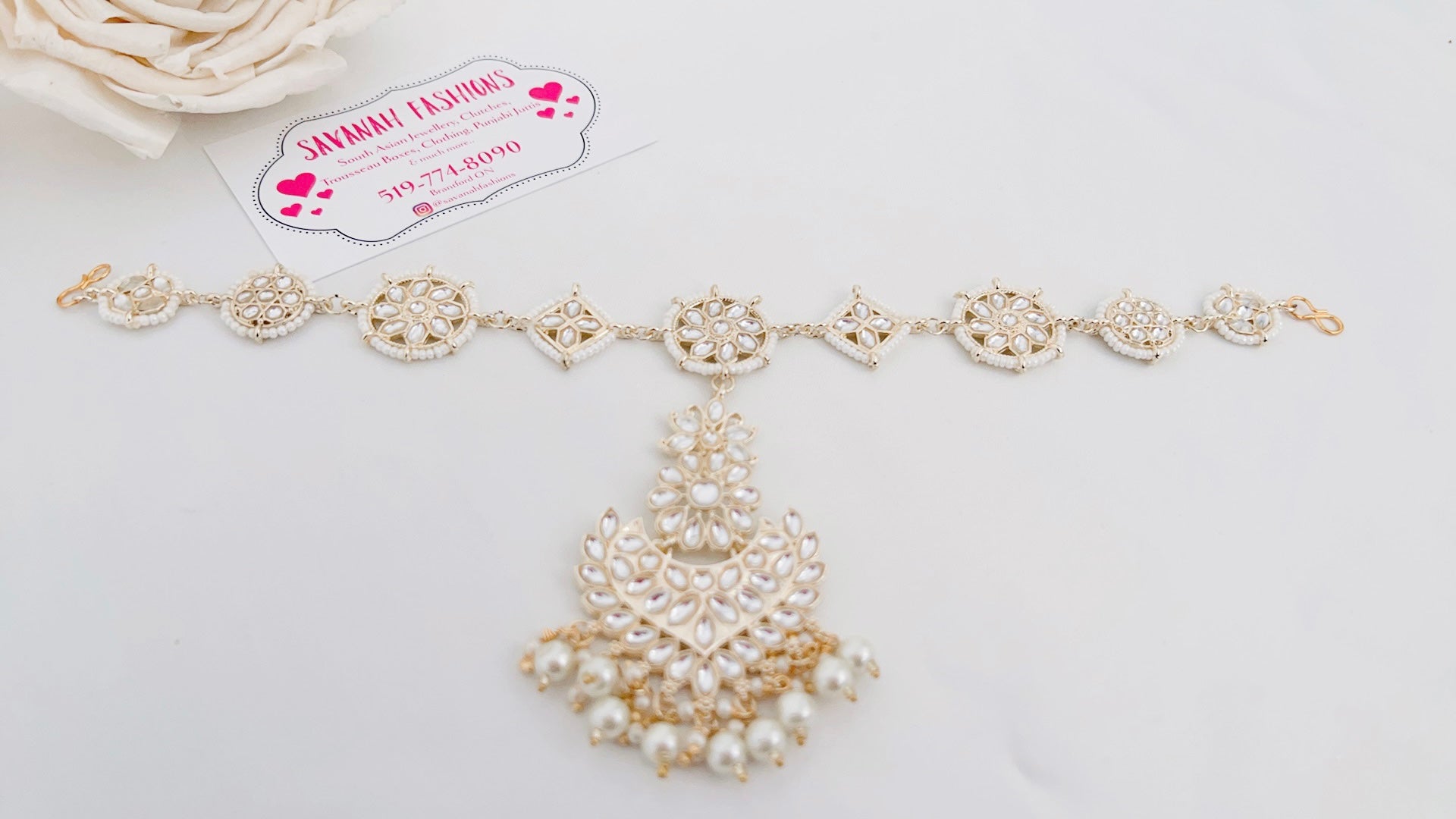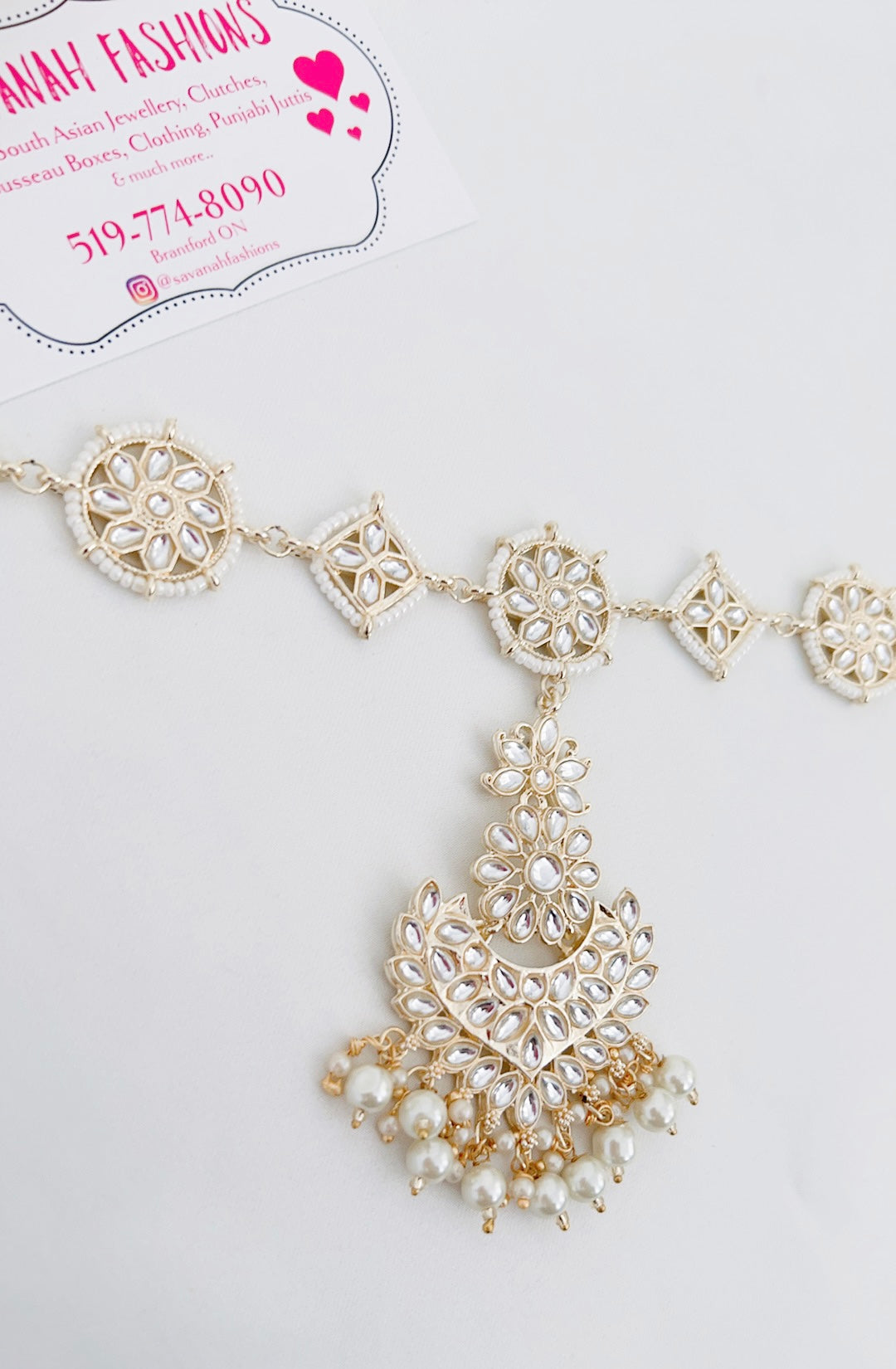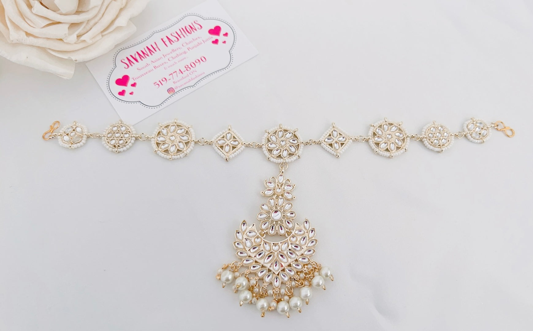 A variation of our Karishma sheeshphool - this sheesh phool contains a tikka with it, can be worn alone or with any of our necklace sets from this collection.