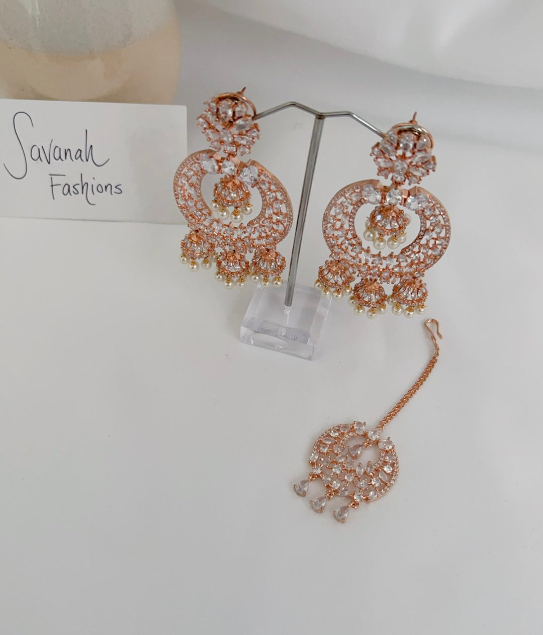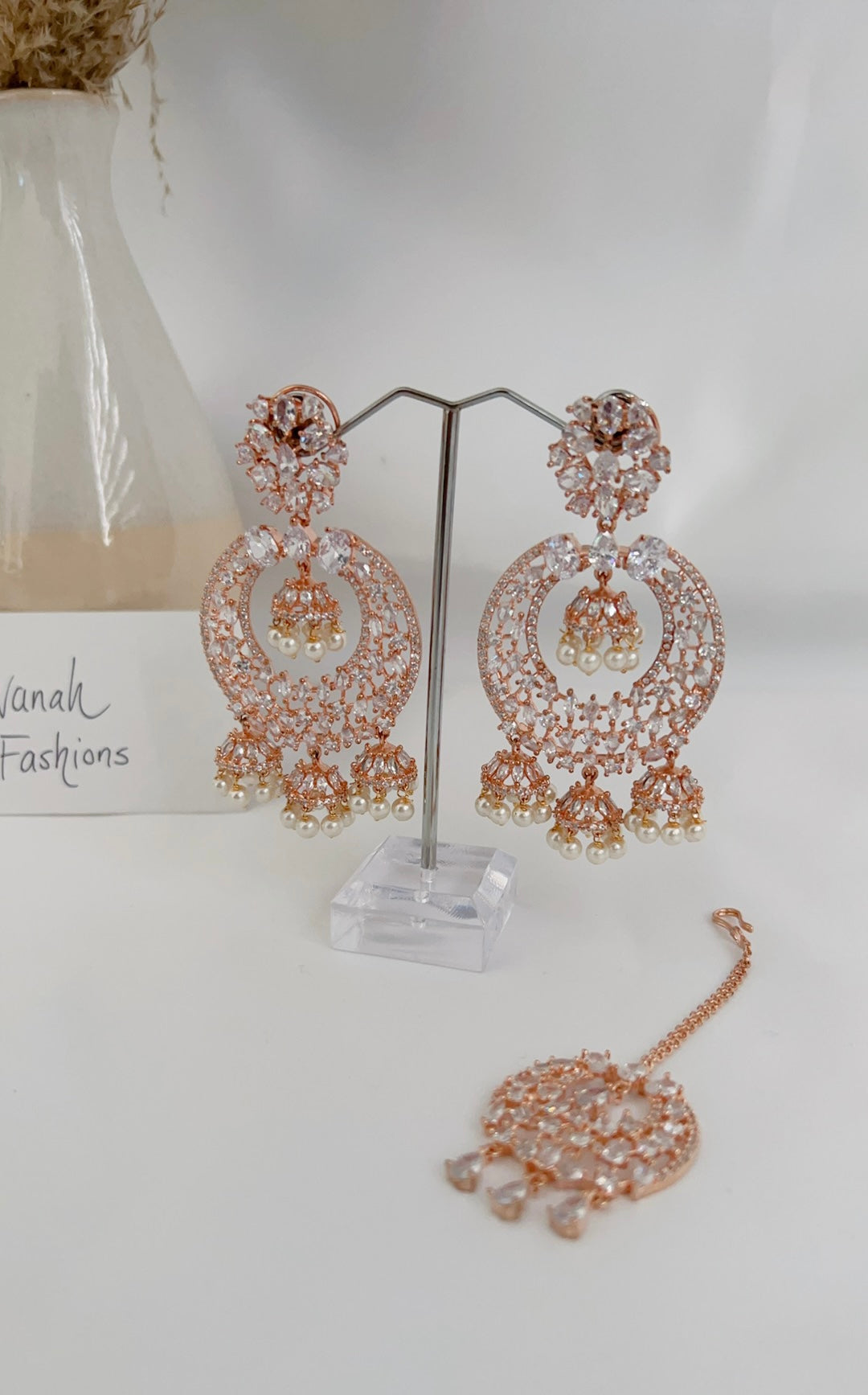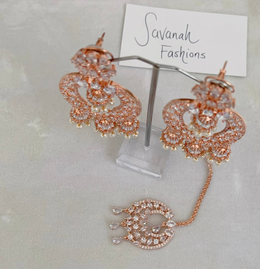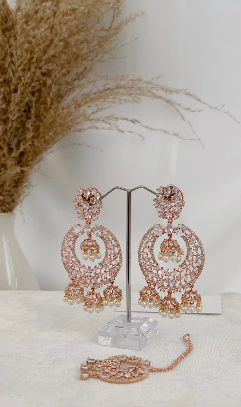 Traditional style meets contemporary in this beautiful American diamond tikka set with a rose base and clear stones. Pair this set with your south asian or western attire.