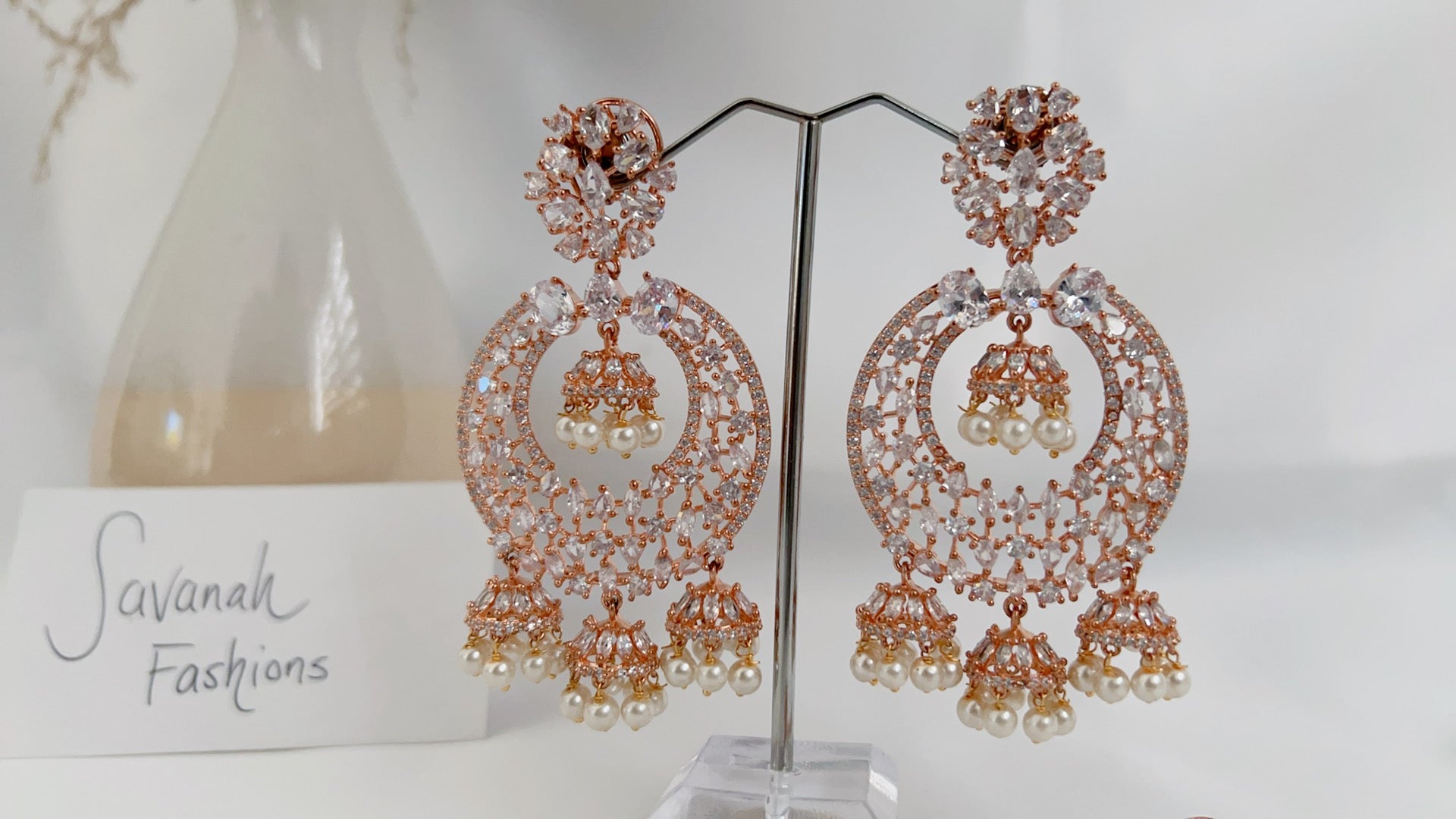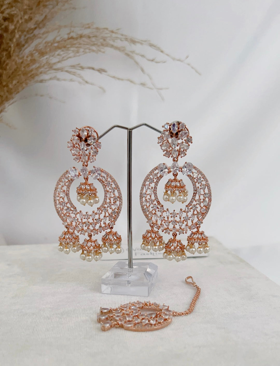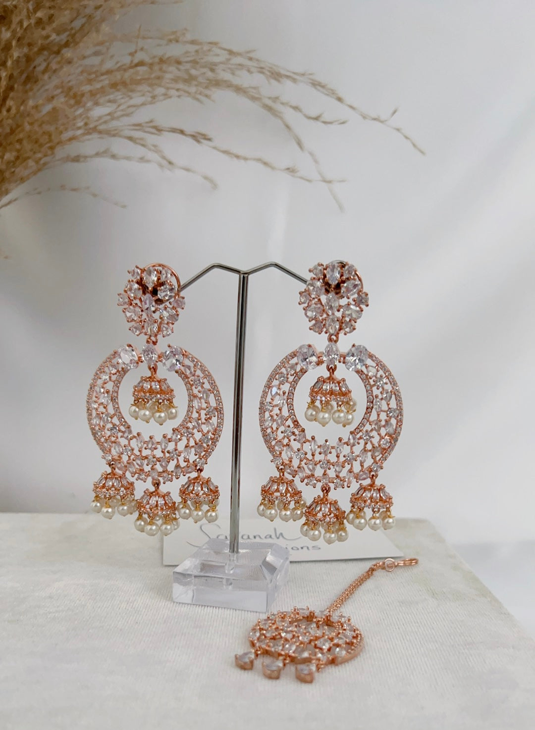 Traditional style meets contemporary in this beautiful American diamond tikka set with a rose base and clear stones. Pair this set with your south asian or western attire.
