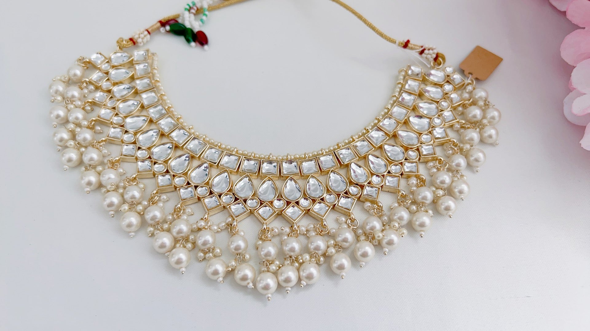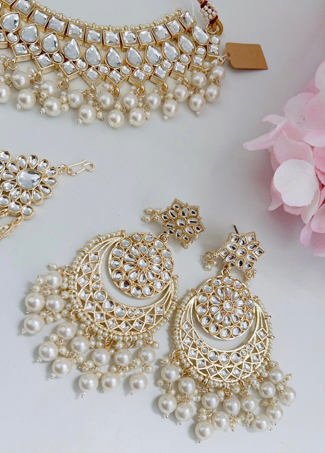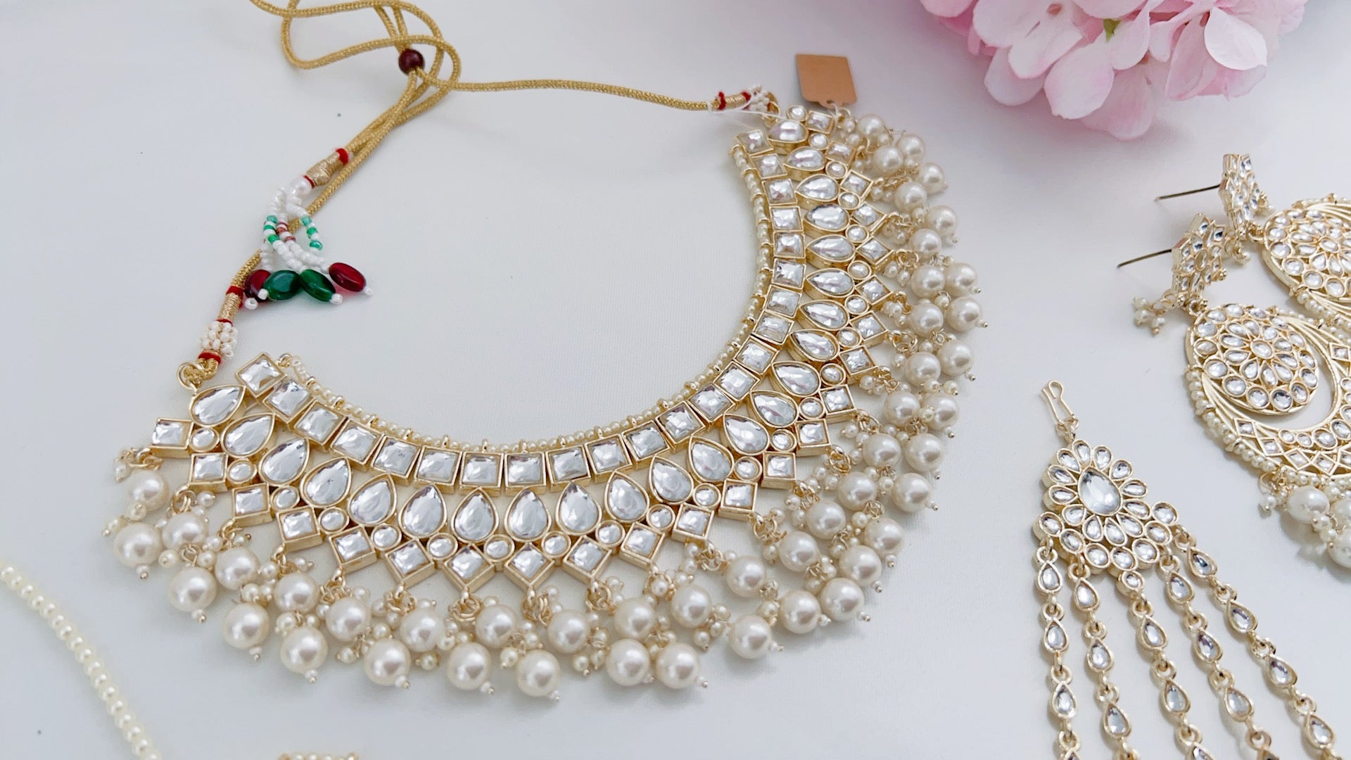 Full set includes: necklace, tikka, earrings, and jhoomar.