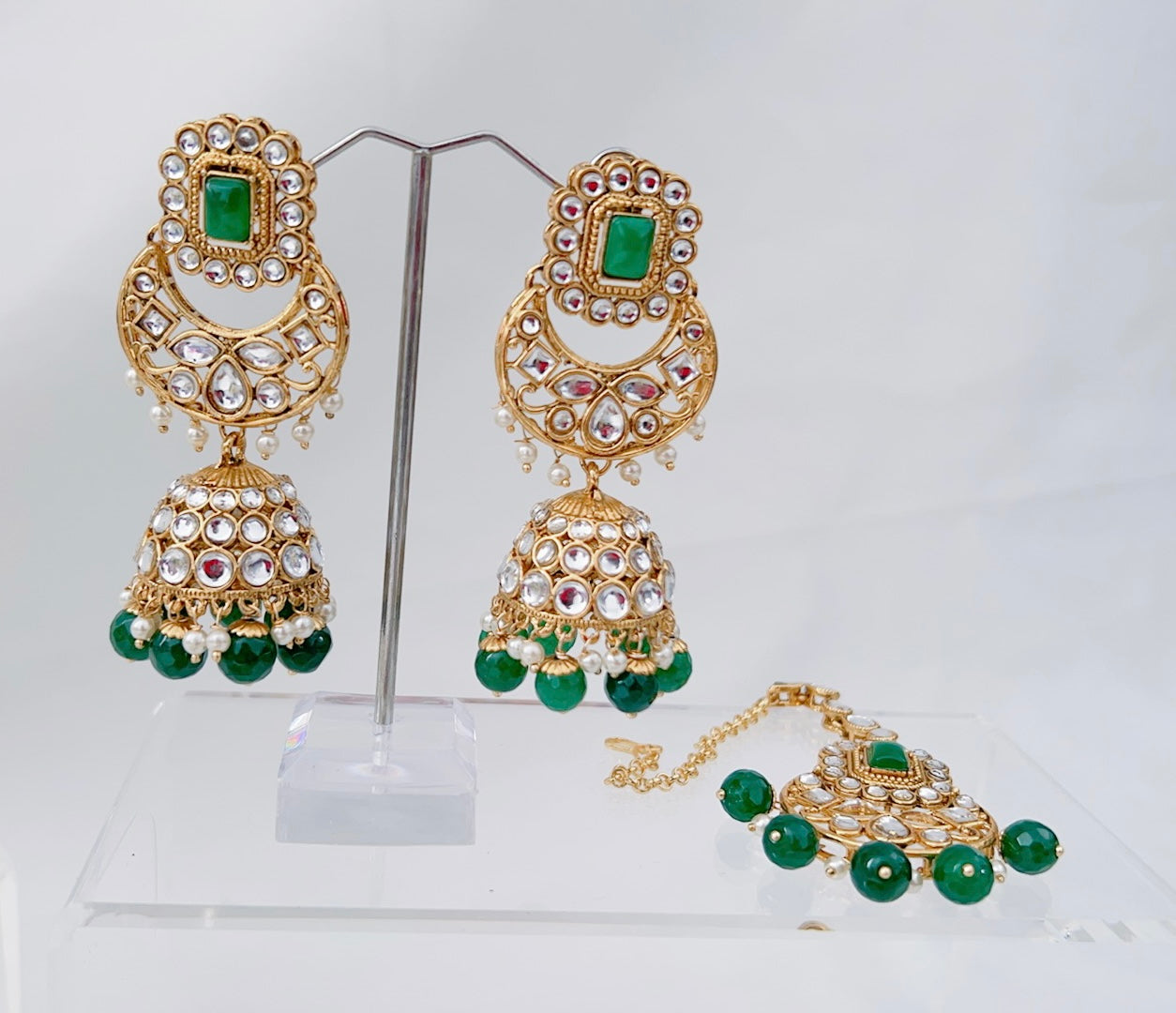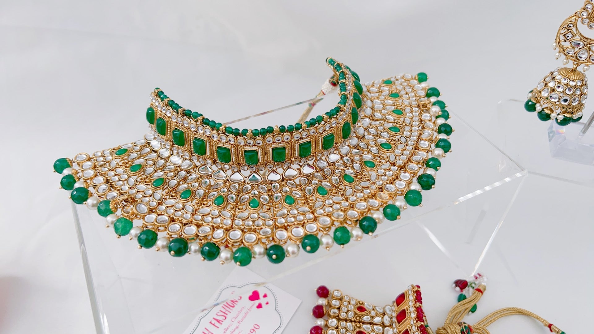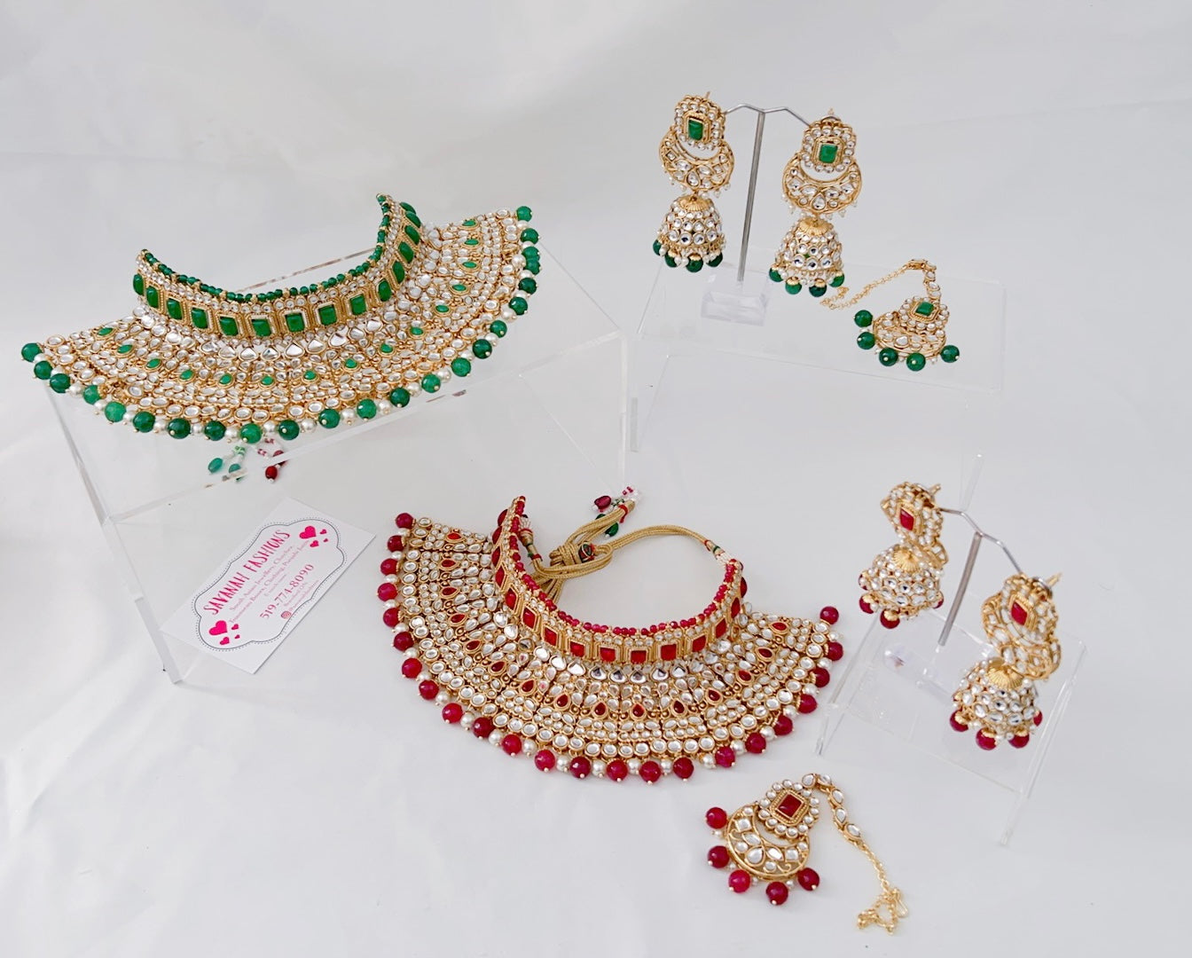 Full set includes: choker, earrings, and tikka on a kundan base with green pearls.