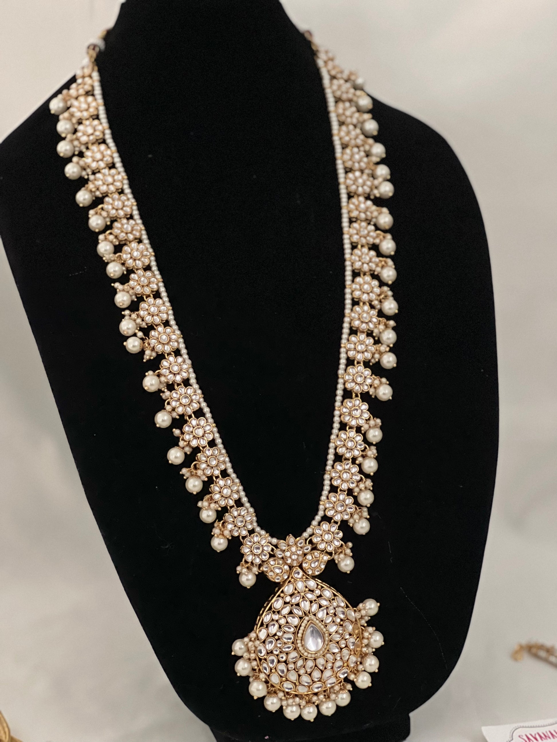 Kundan bridal set that speak elegance inspired by Alia Bhatt's wedding jewellery. This full set includes: choker, long haar, jhoomar, matha patti, tikka, hand accessories, nath (nose ring), and earrings to complete the full glam.