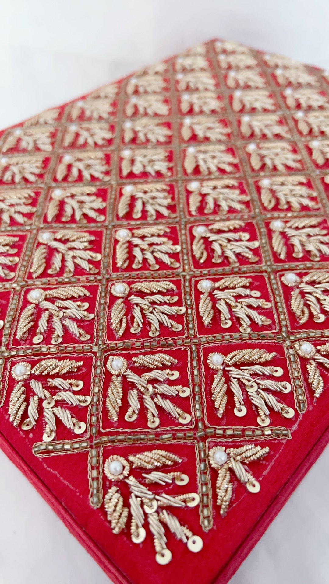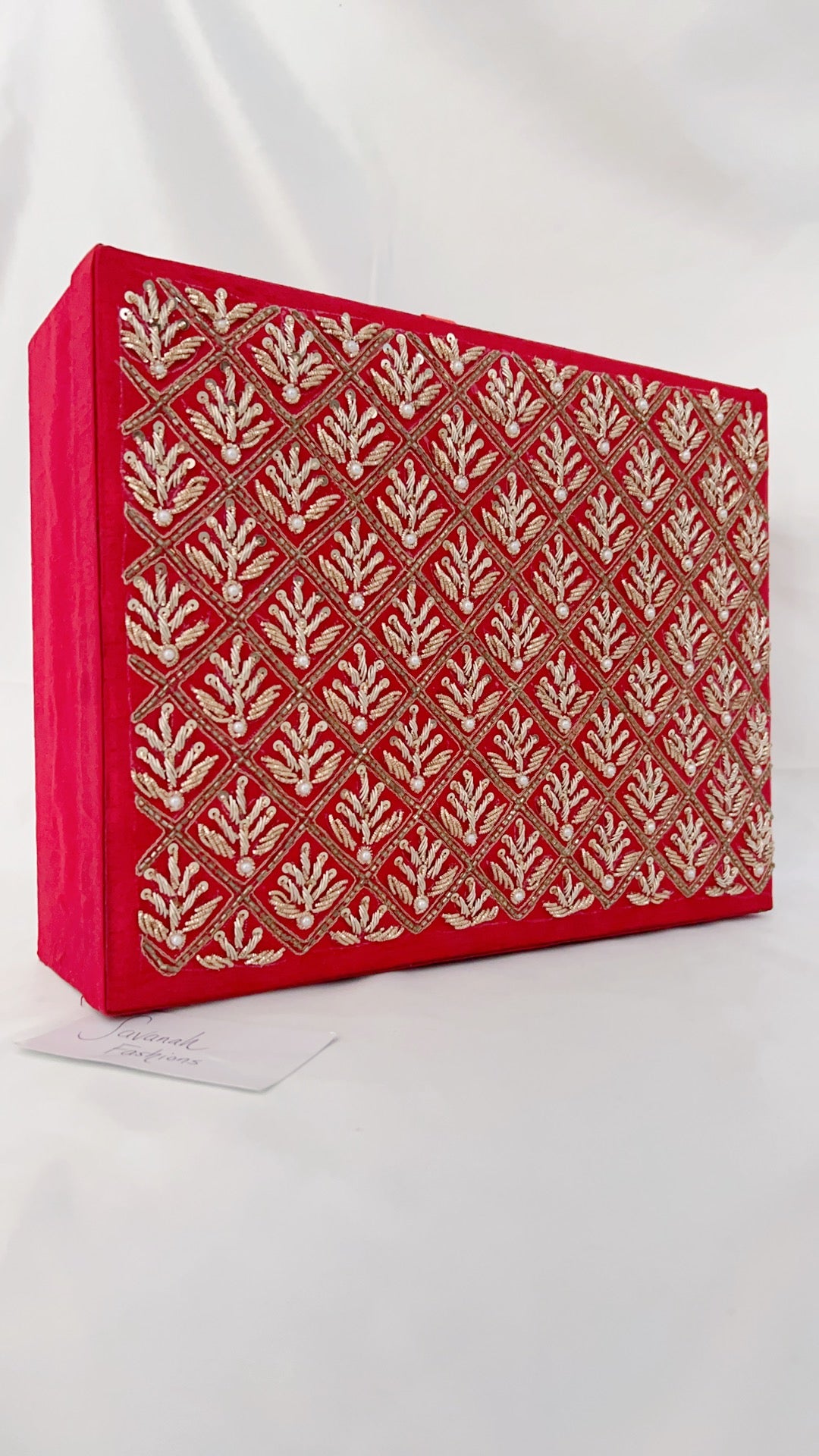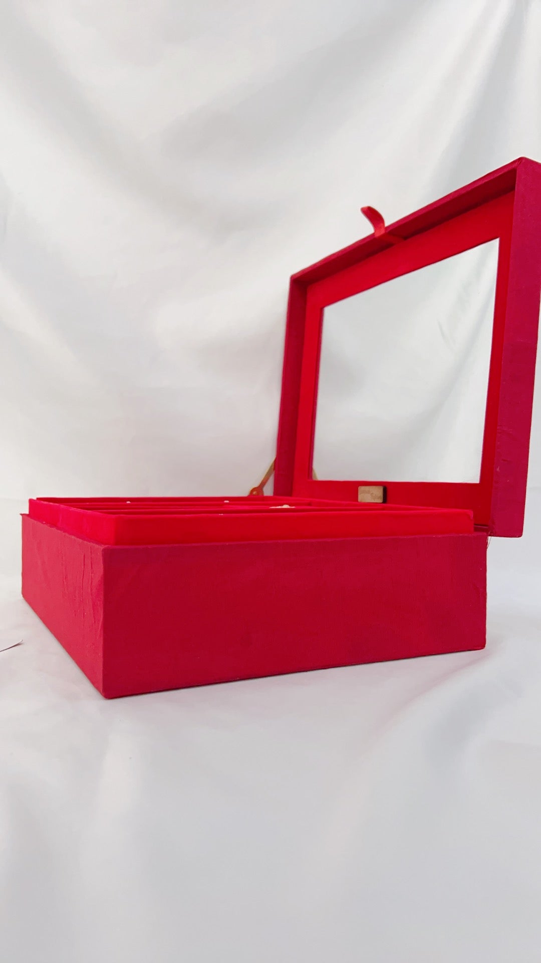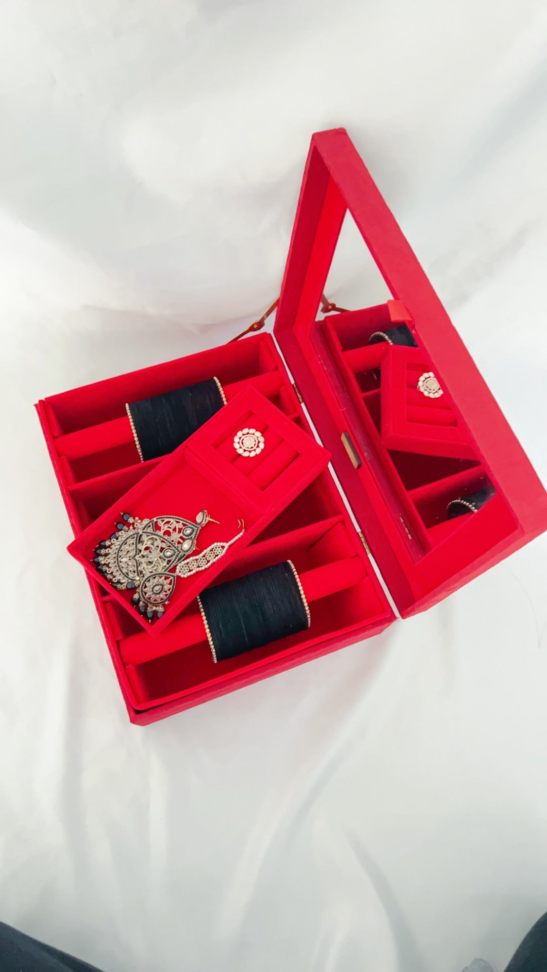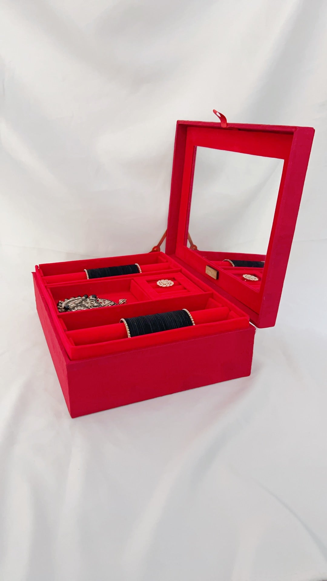 Hand crafted trousseau box with high quality velvet and suede interior. It has 3 compartments: 2 bangle rods and the middle jewellery section where you can store you bridal set, rings, and more. These sections are conveniently detachable. This versatile box makes for a great keepsake or gift.