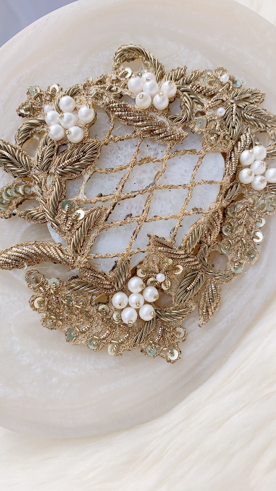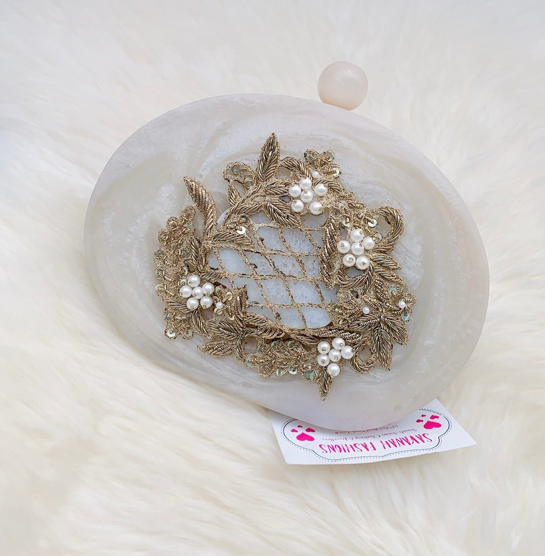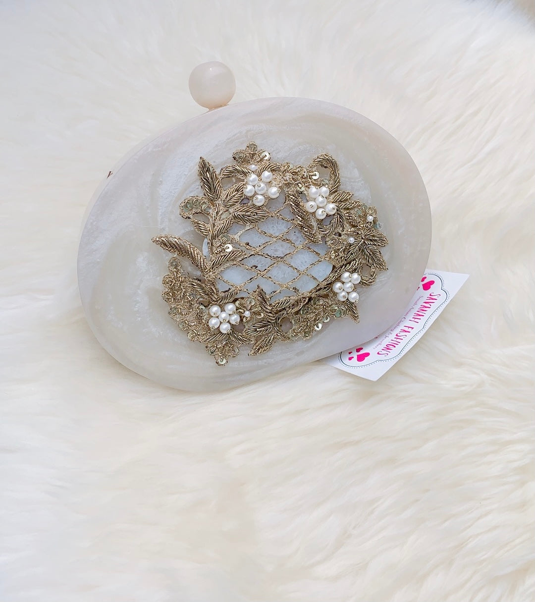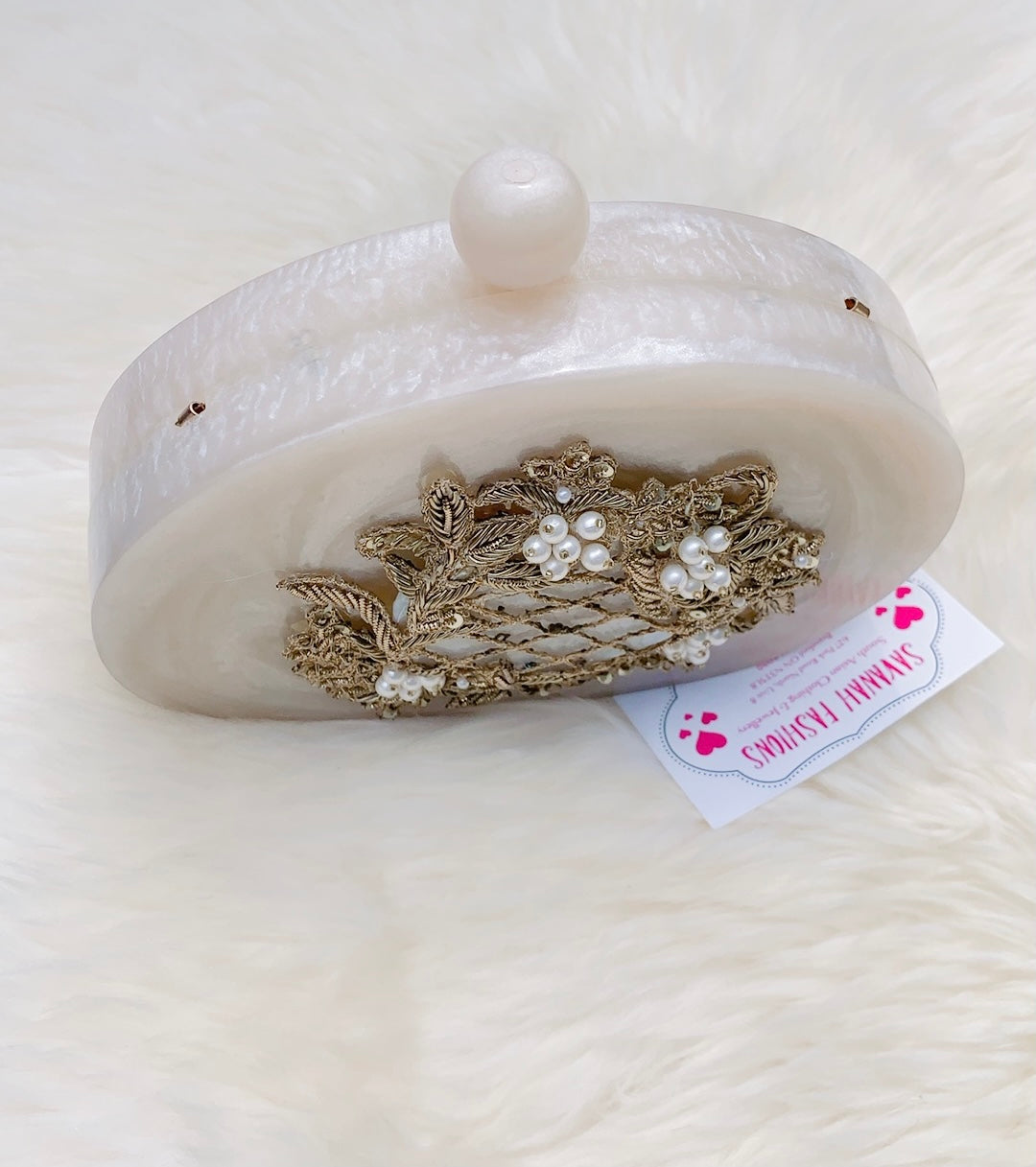Hand poured resin clutch with hand embroidery embellishment on top of agate stone.