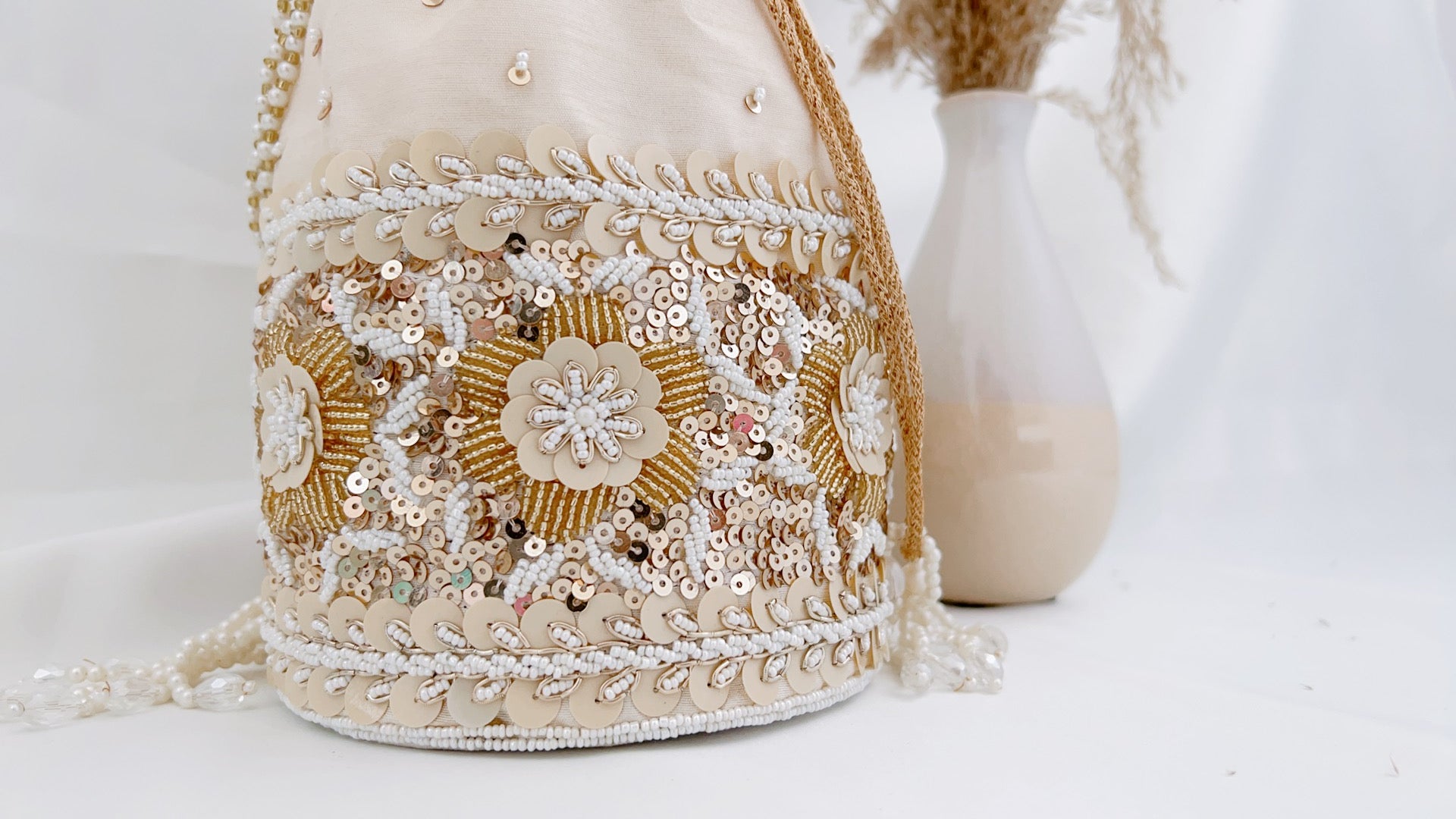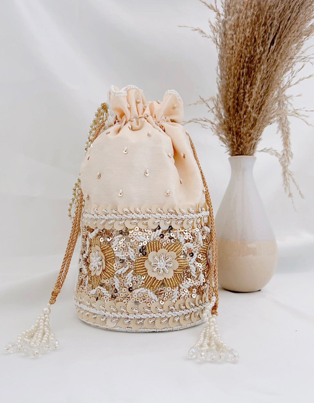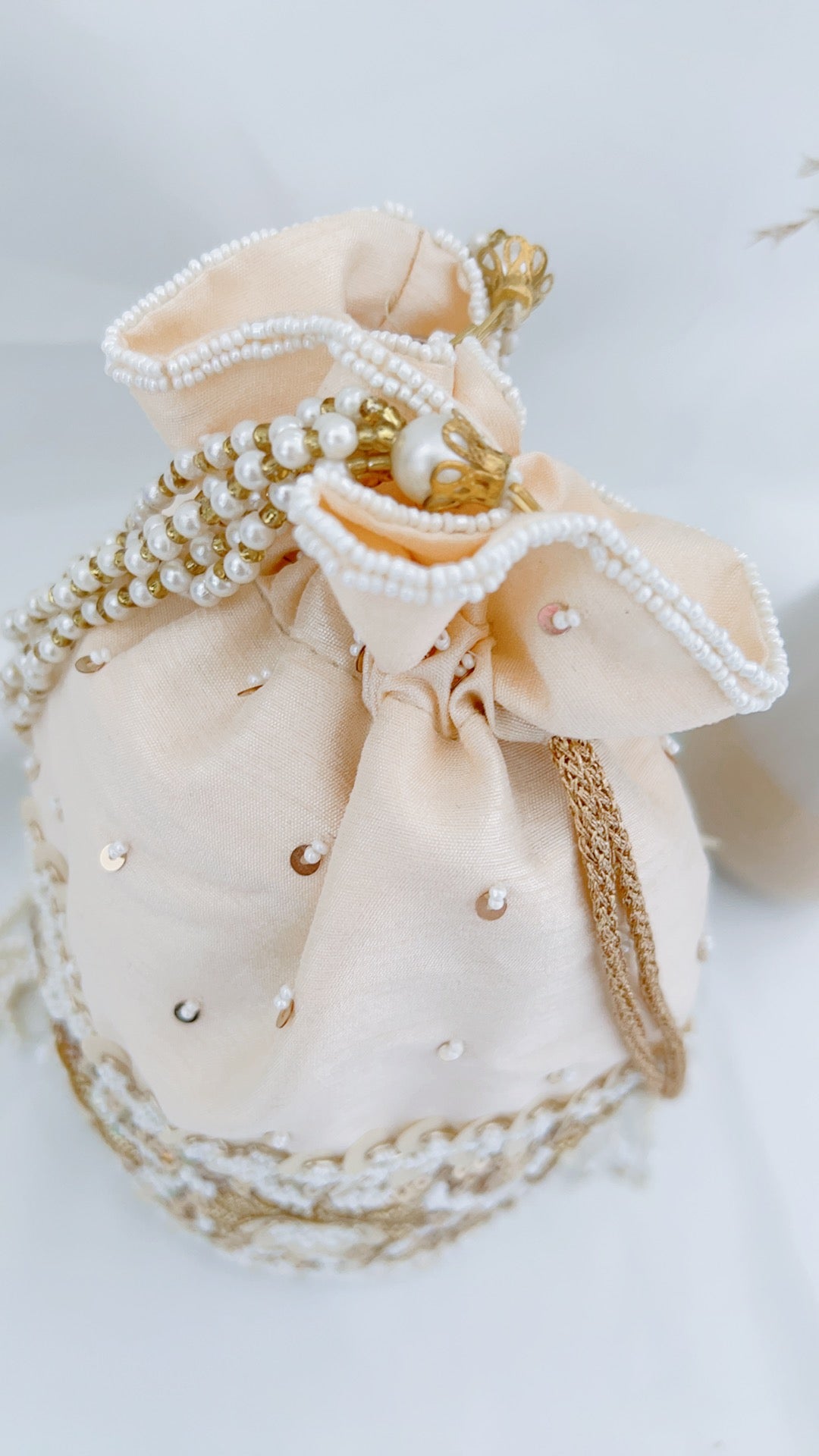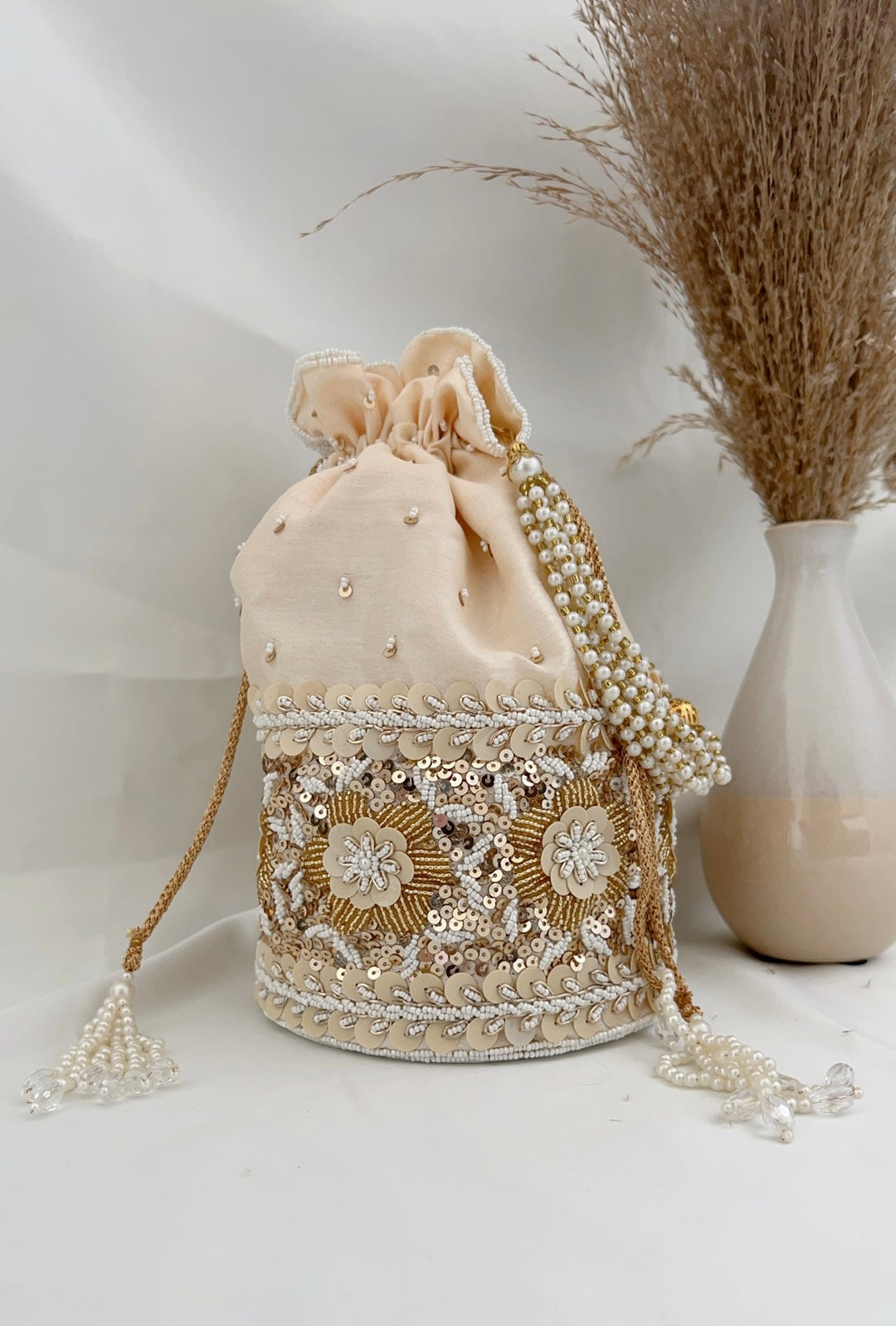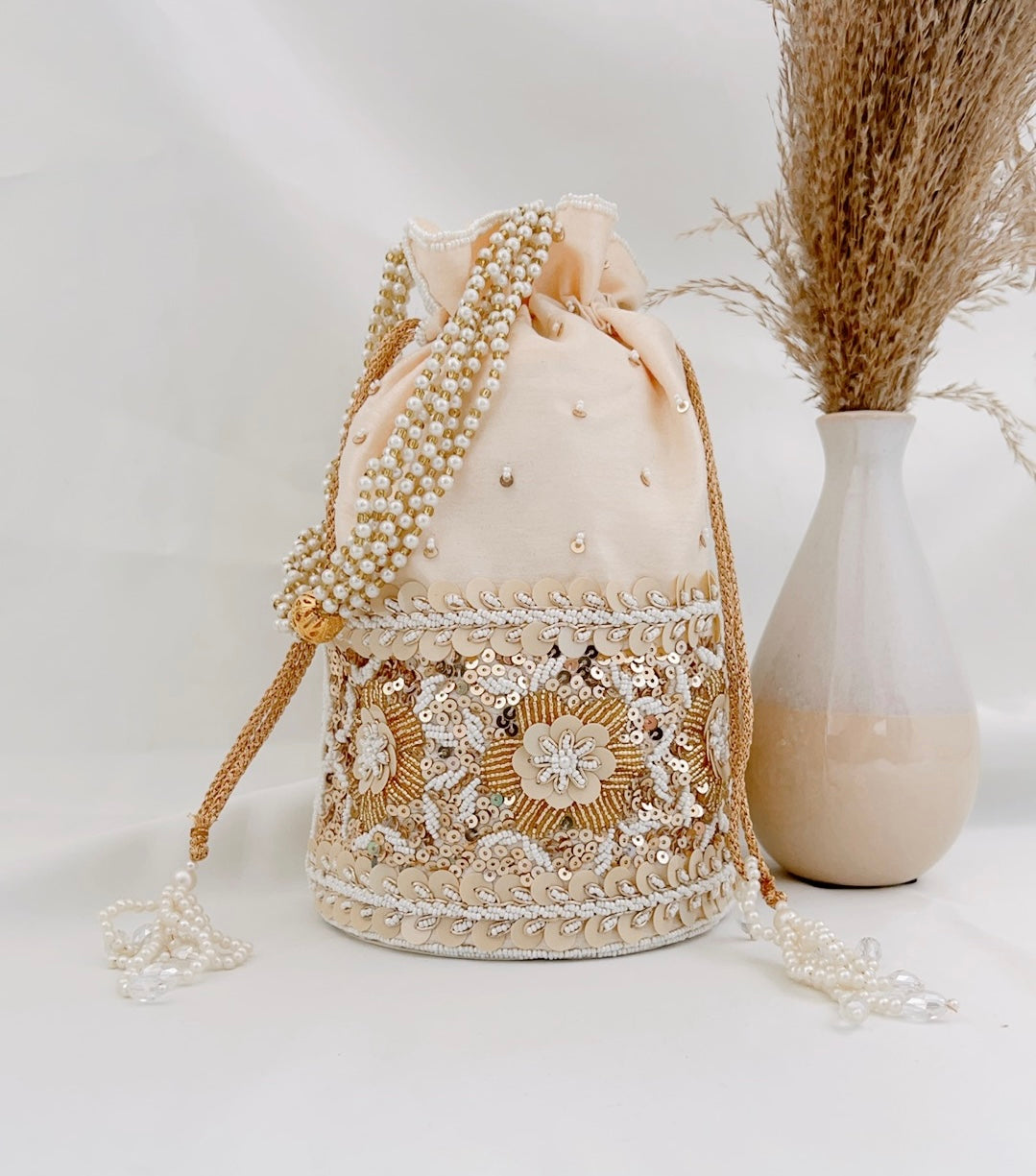 The embellishments of this potli design grabs attention. Beautifully created on silk fabric with details that truly matter - pearls hugging the potli from top to bottom with floral designs of sequins and beads. A pretty accessory to complete your look.