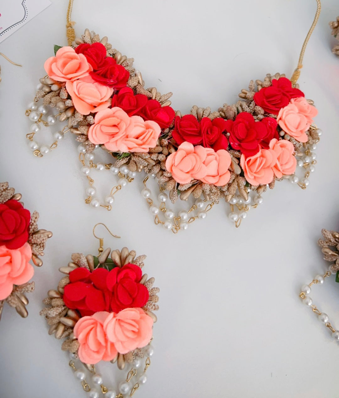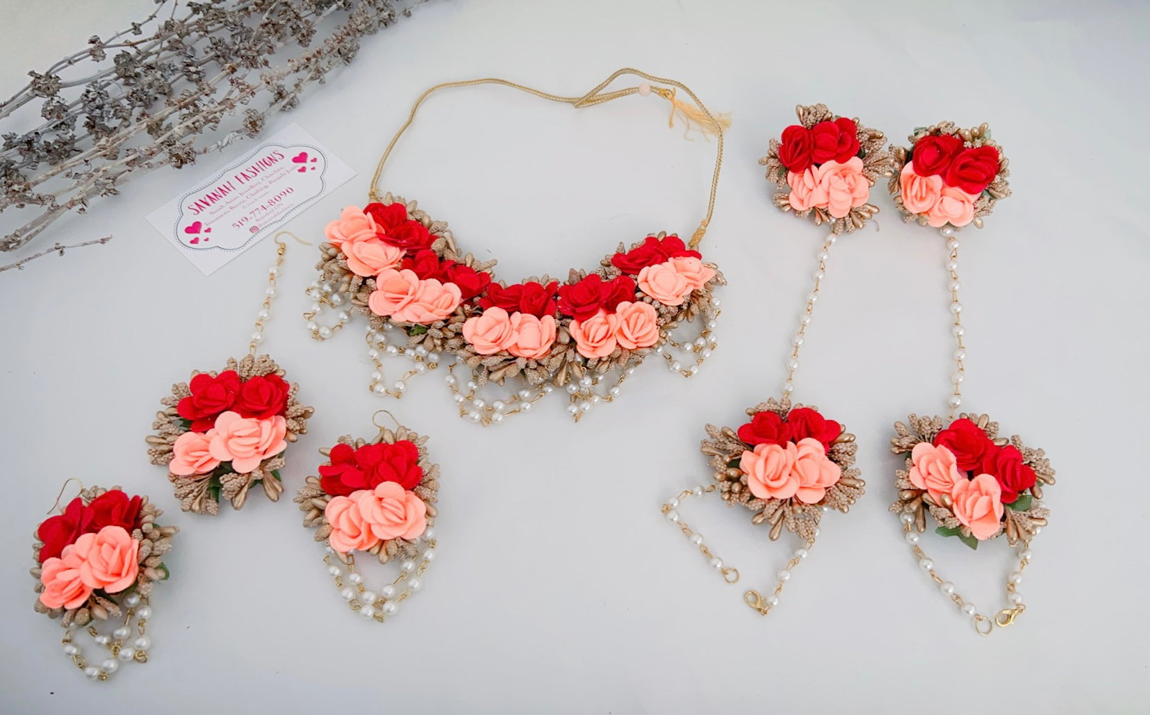 Flower jewellery is unique and in latest trend for all special occasions like Mehendi, Wedding, Sangeet, and Haldi. This full set consists of necklace, tikka, earrings, and bracelets. Hand made with soft material.