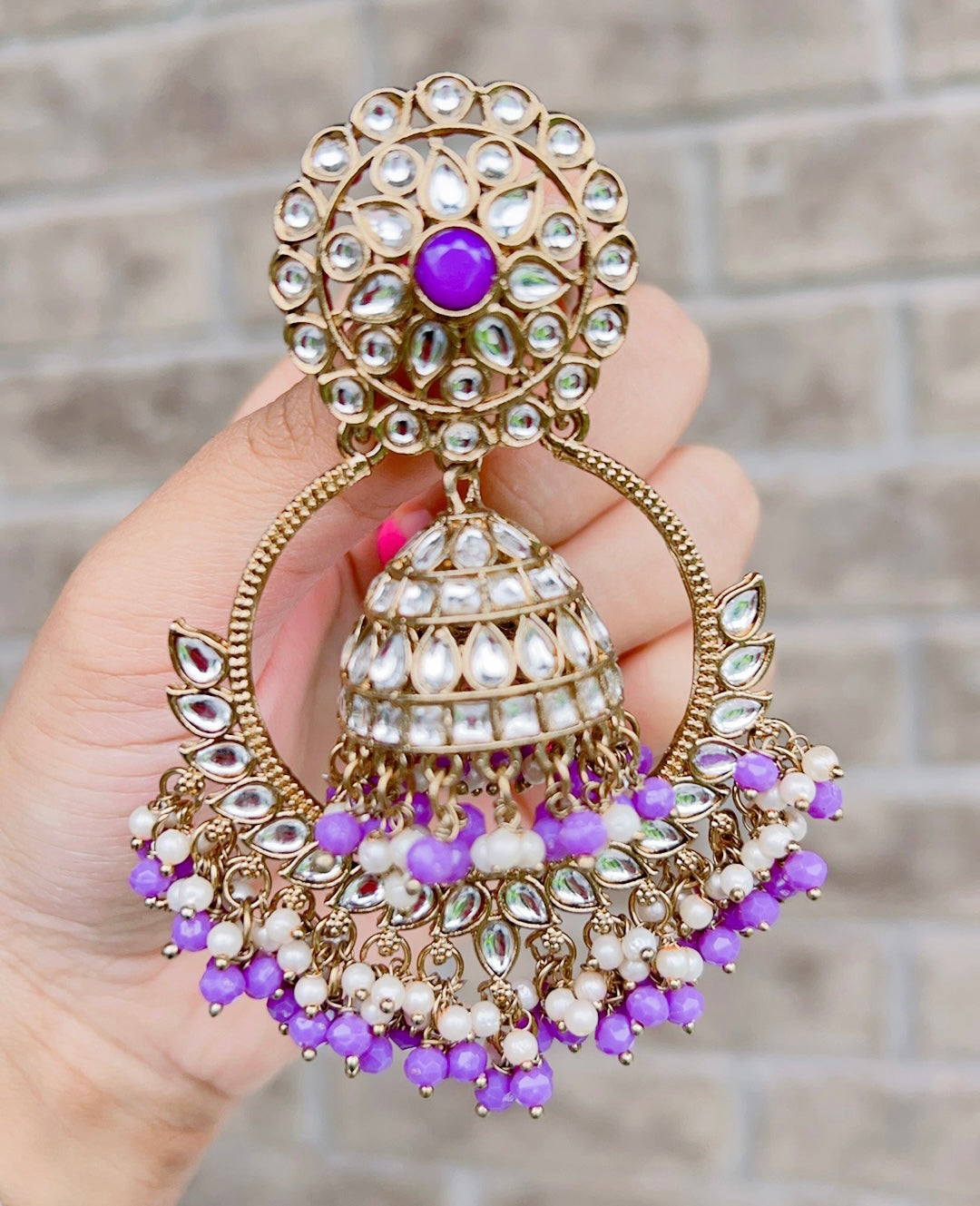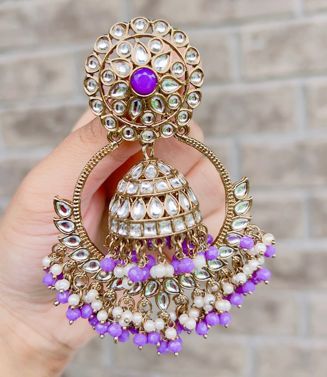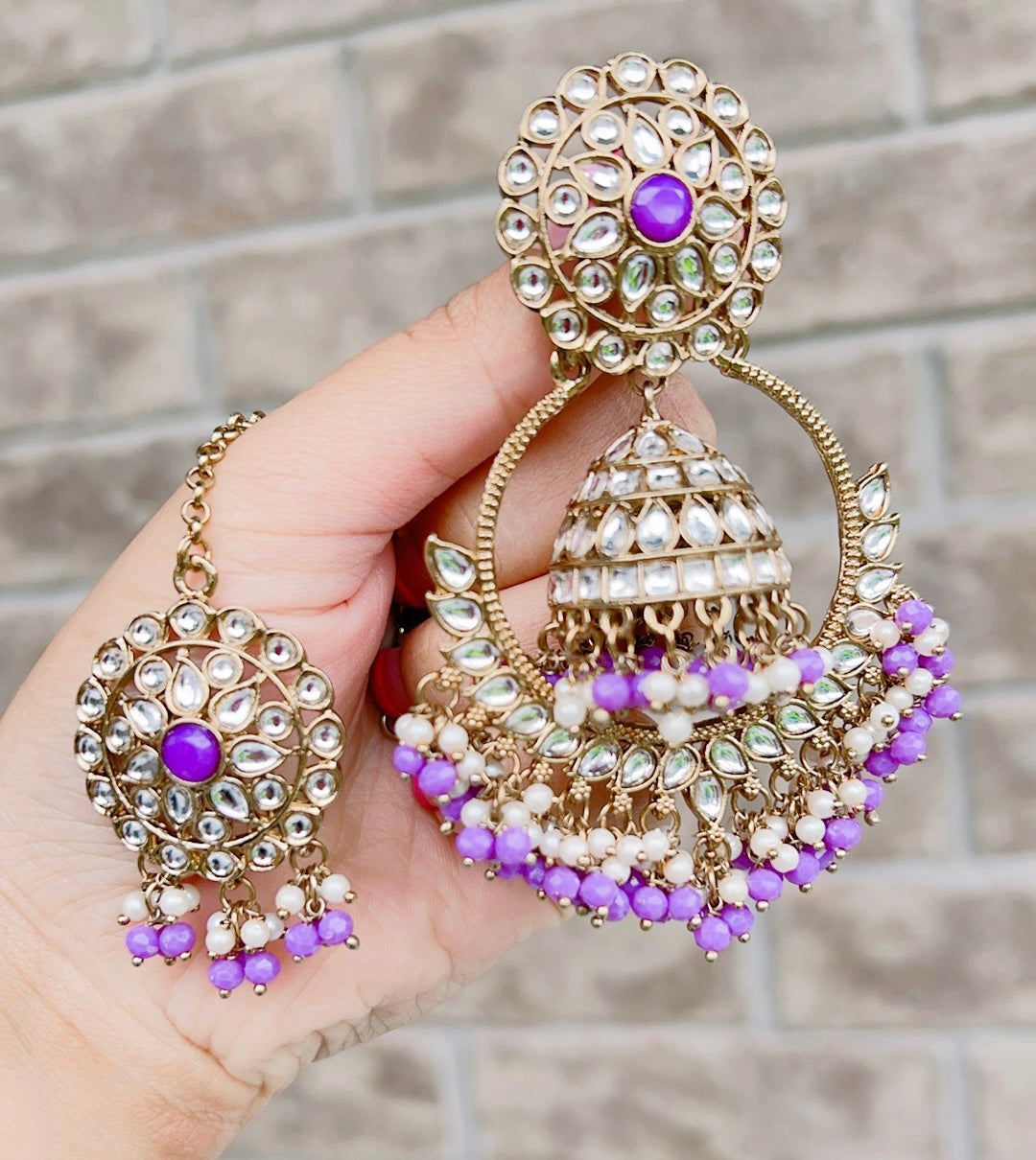 Beautiful combination of studs and jhumkis put together. Full set includes: earrings and tikka.