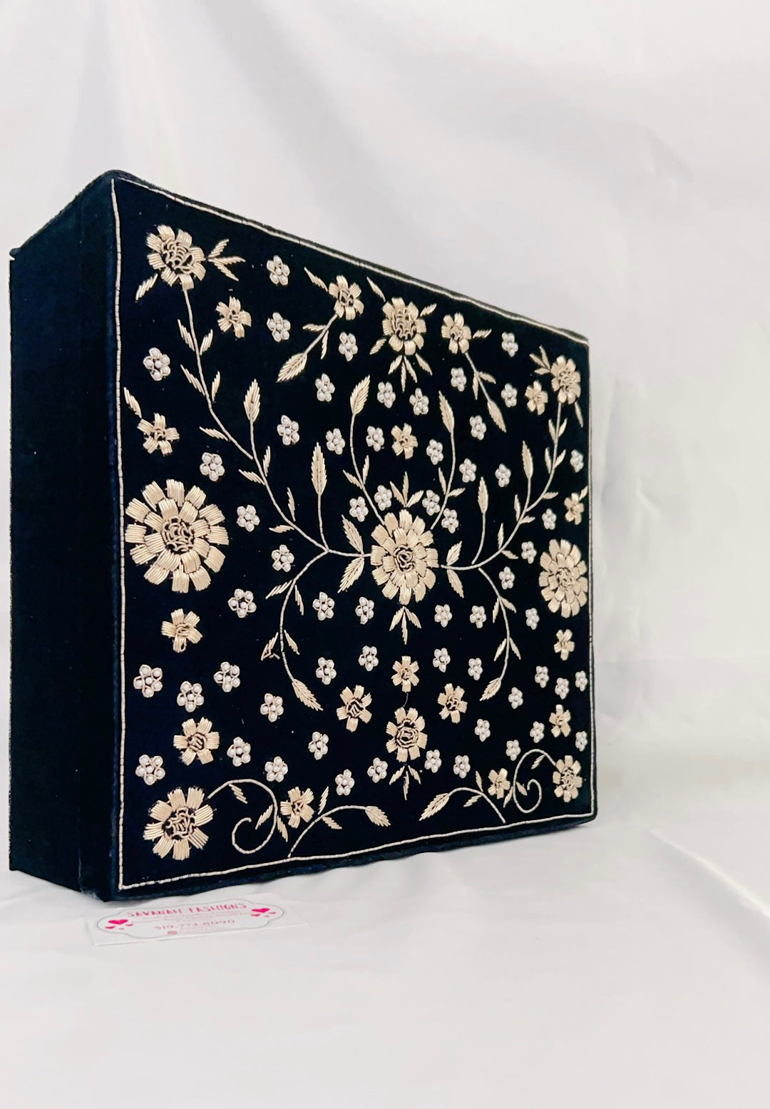 Made with high quality velvet fabric exterior and complimentary embroidery, with luxury suede interior, all hand crafted to perfection. It has 3 compartments, 2 bangle sections on each side and middle consisting of a jewellery section. Easily store your jewellery, bangles, rings, and more. It's a versatile box with sections that are conveniently detachable.