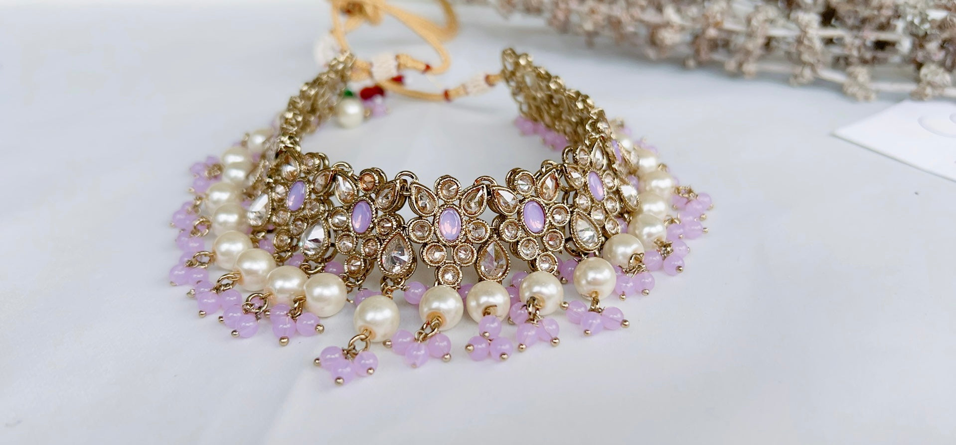 Beautiful pearl and blue combination. Full set includes: Necklace (that can be worn as a choker), earrings, and tikka.