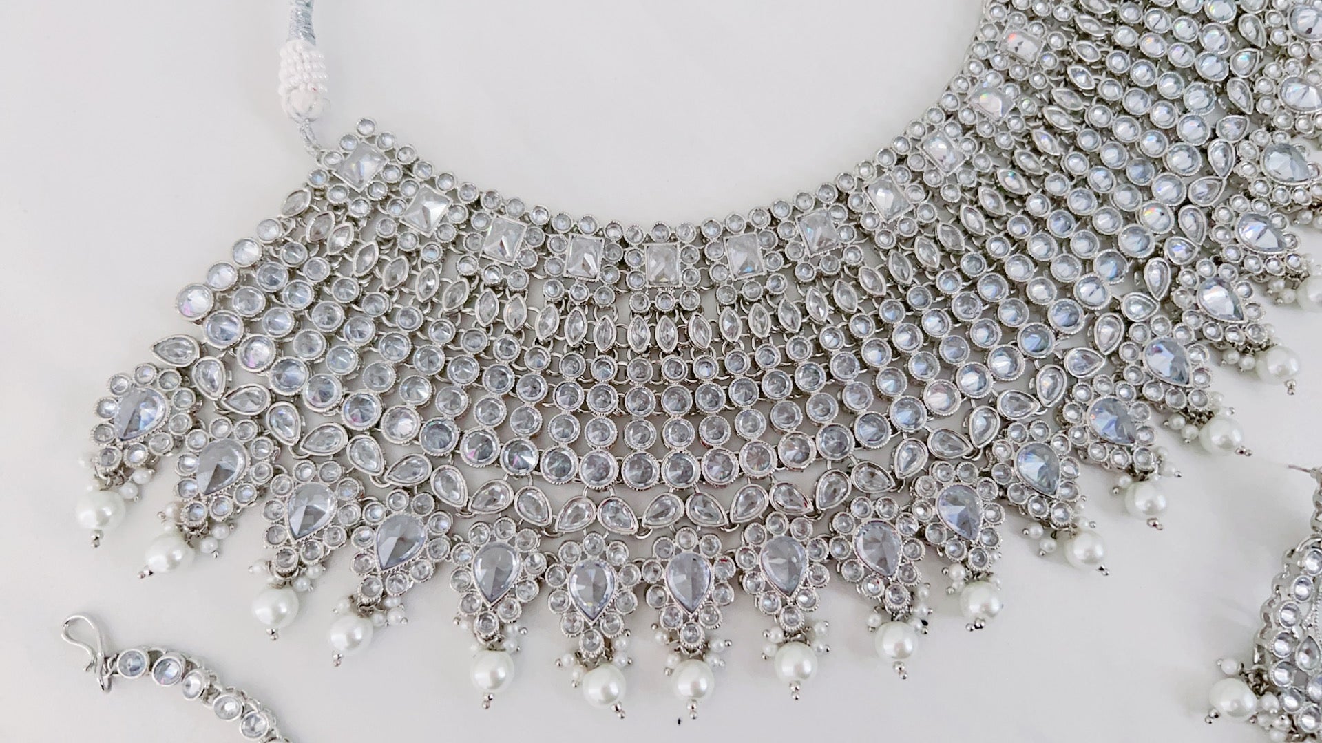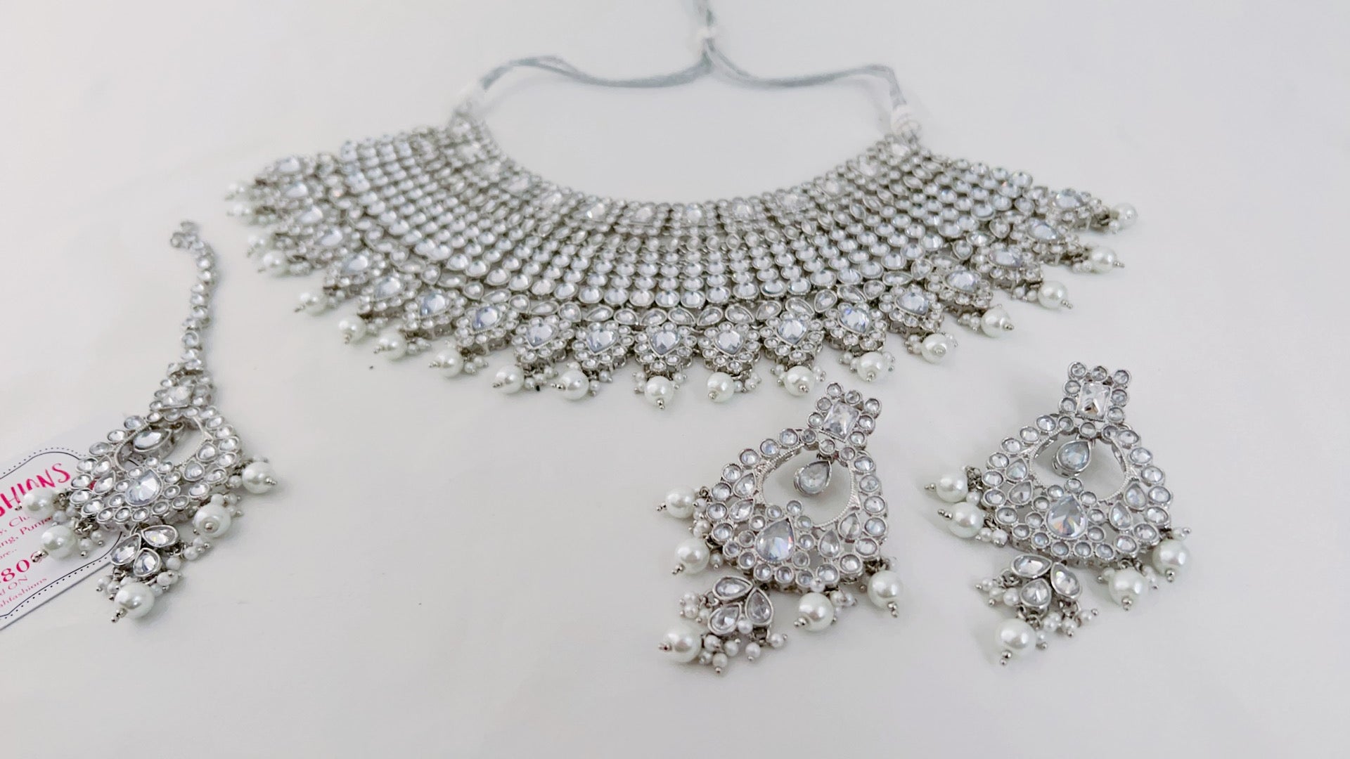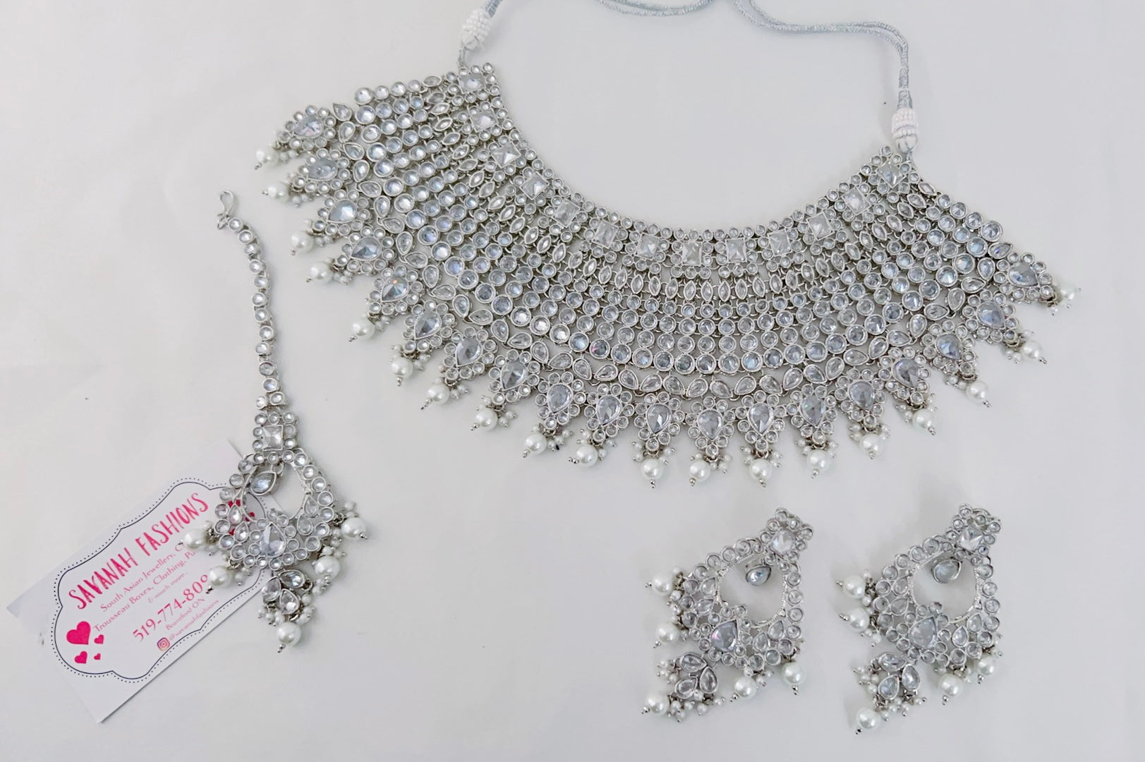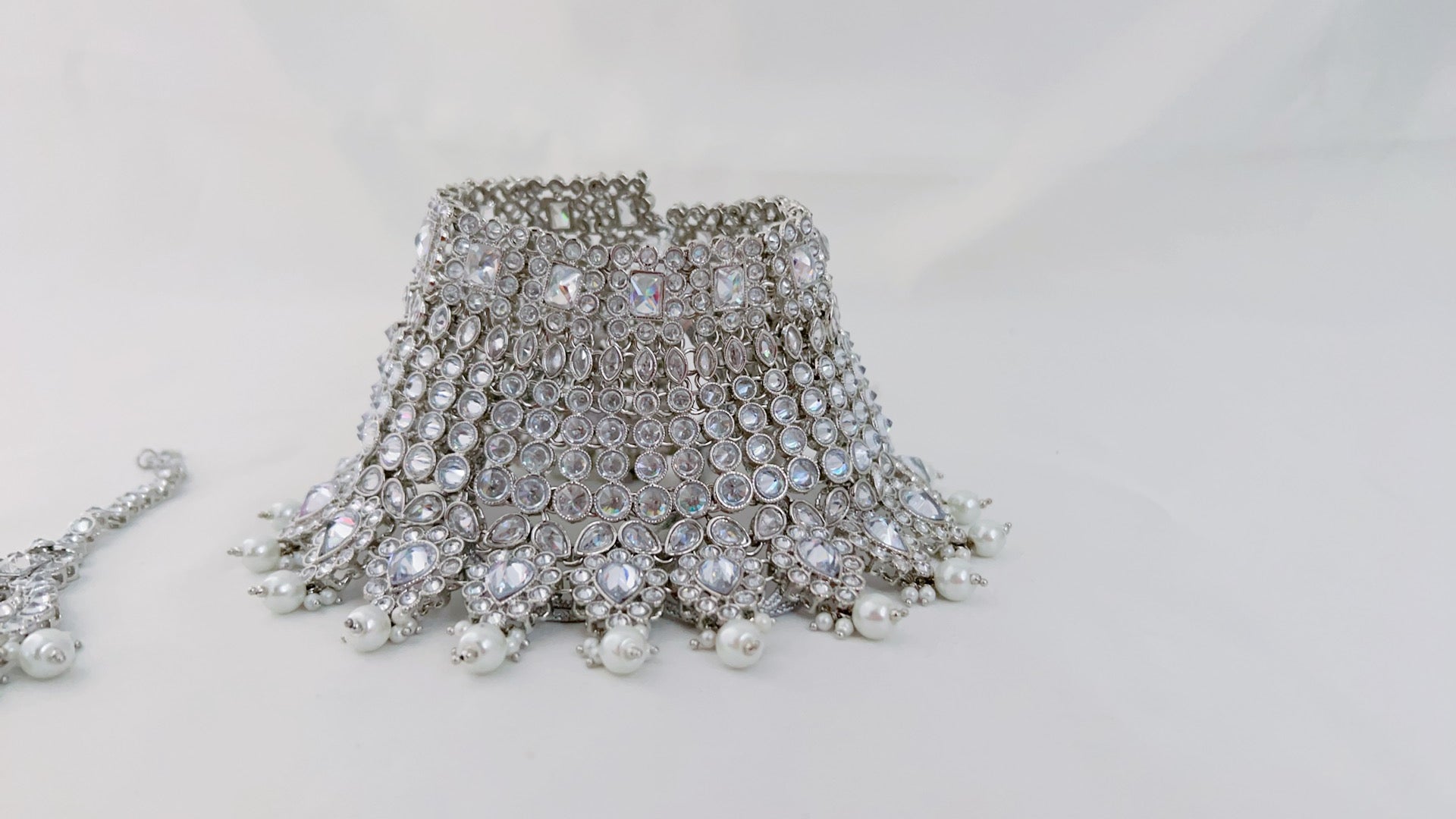 Silver bridal set that comes with a heavy choker (necklace), earrings and tikka.