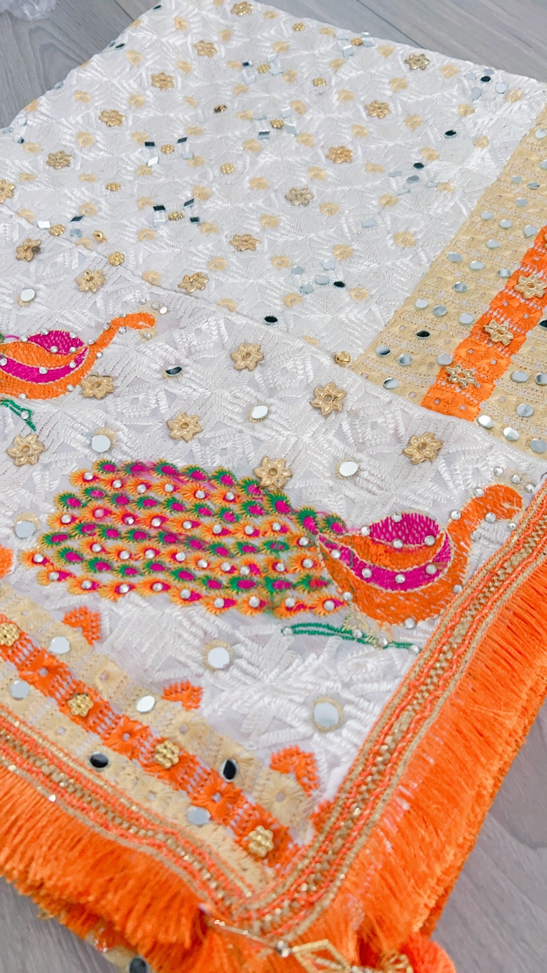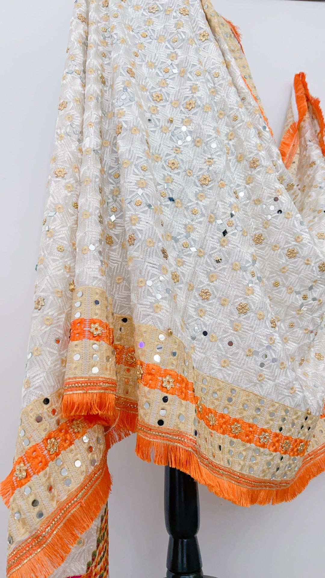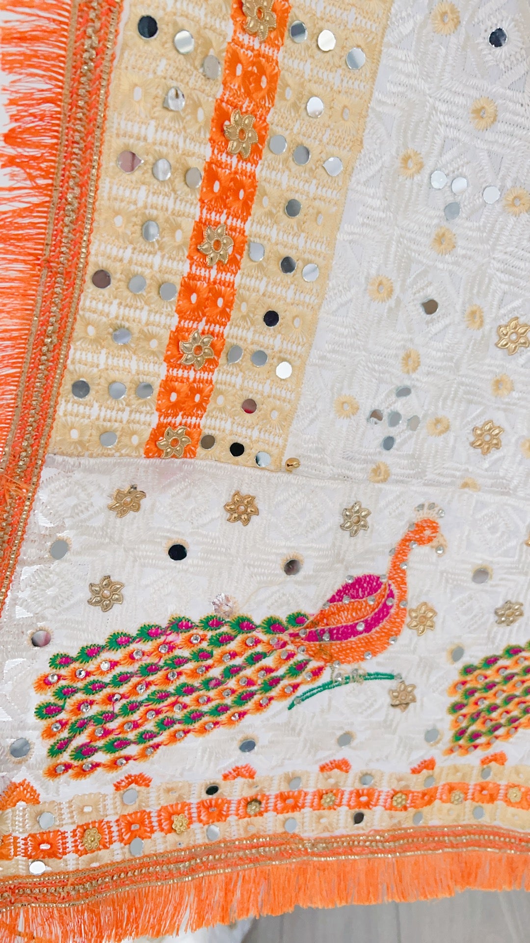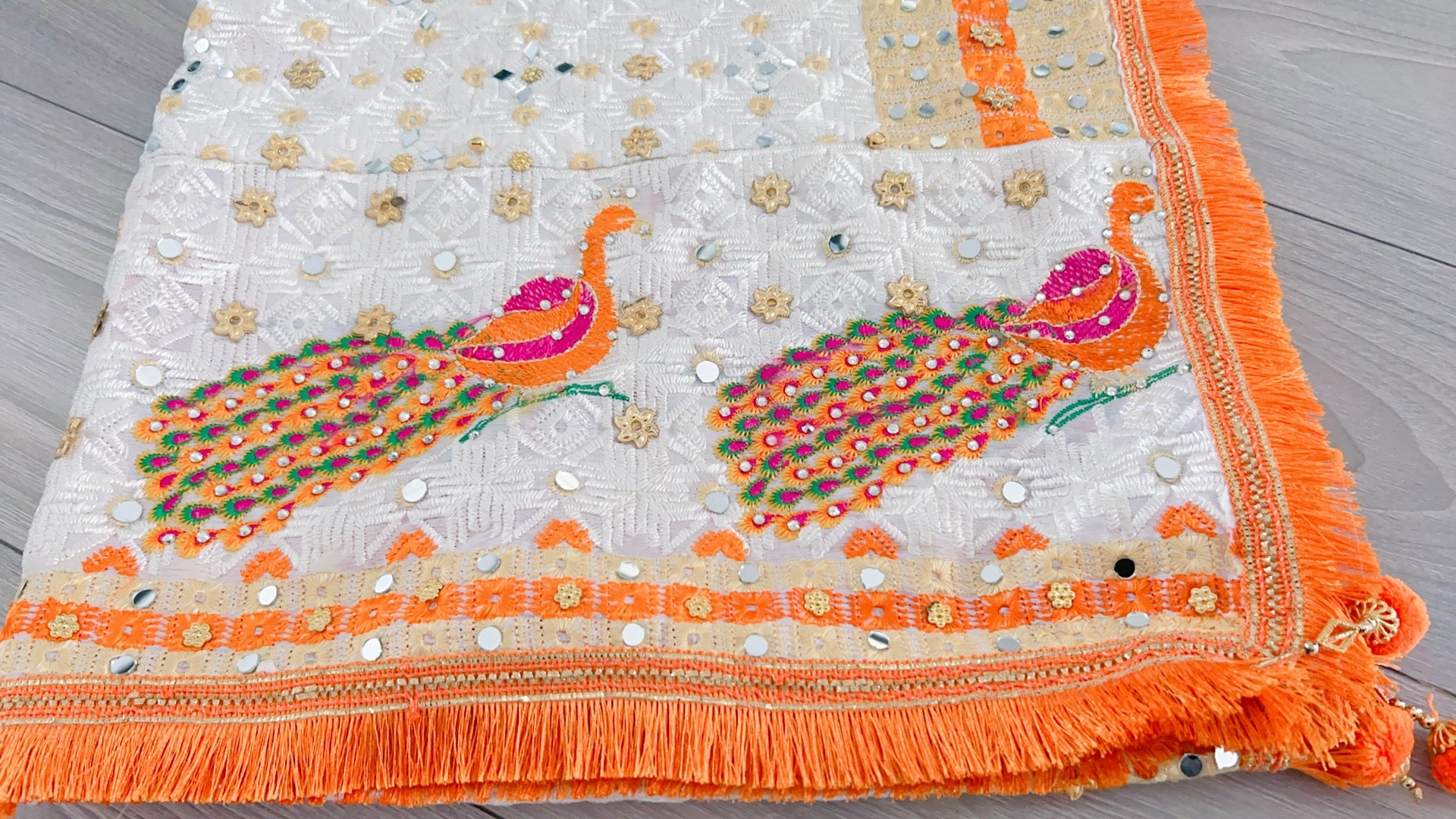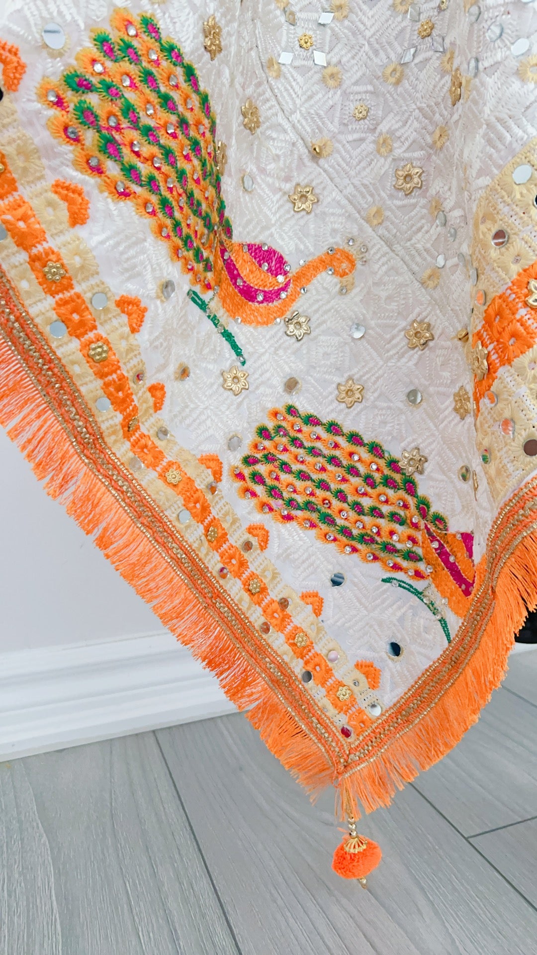Heavily embroidered phulkari dupatta. This versatile dupatta can be matched with a plain suit for the ultra glam style; ideal for a party or bridal photoshoot; as a Maiyan chunni decor for the bride or groom.