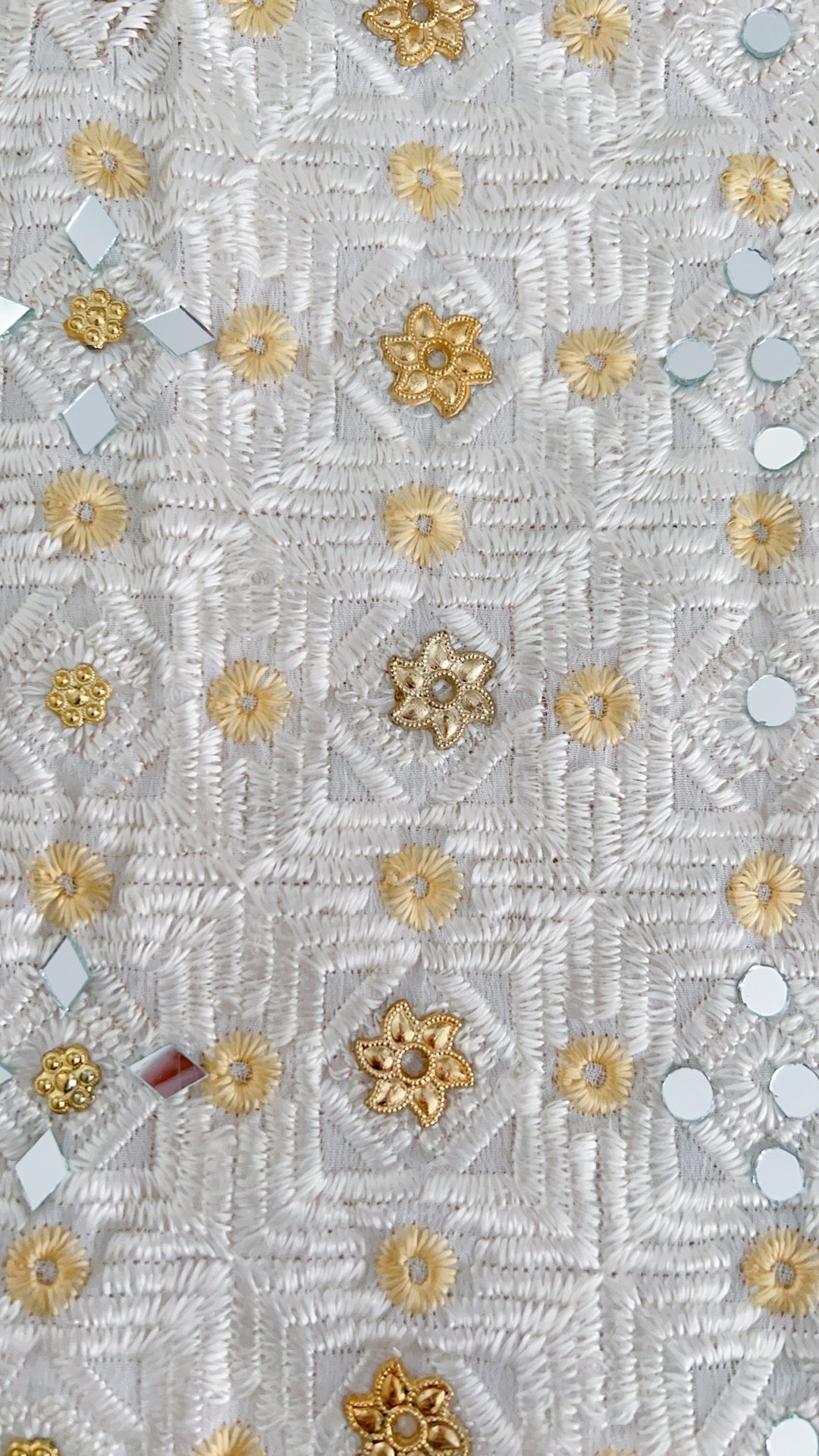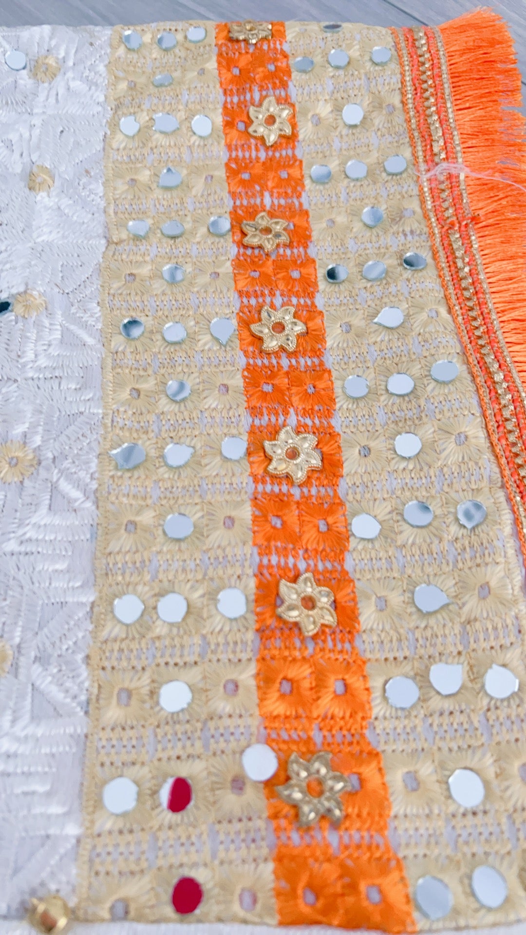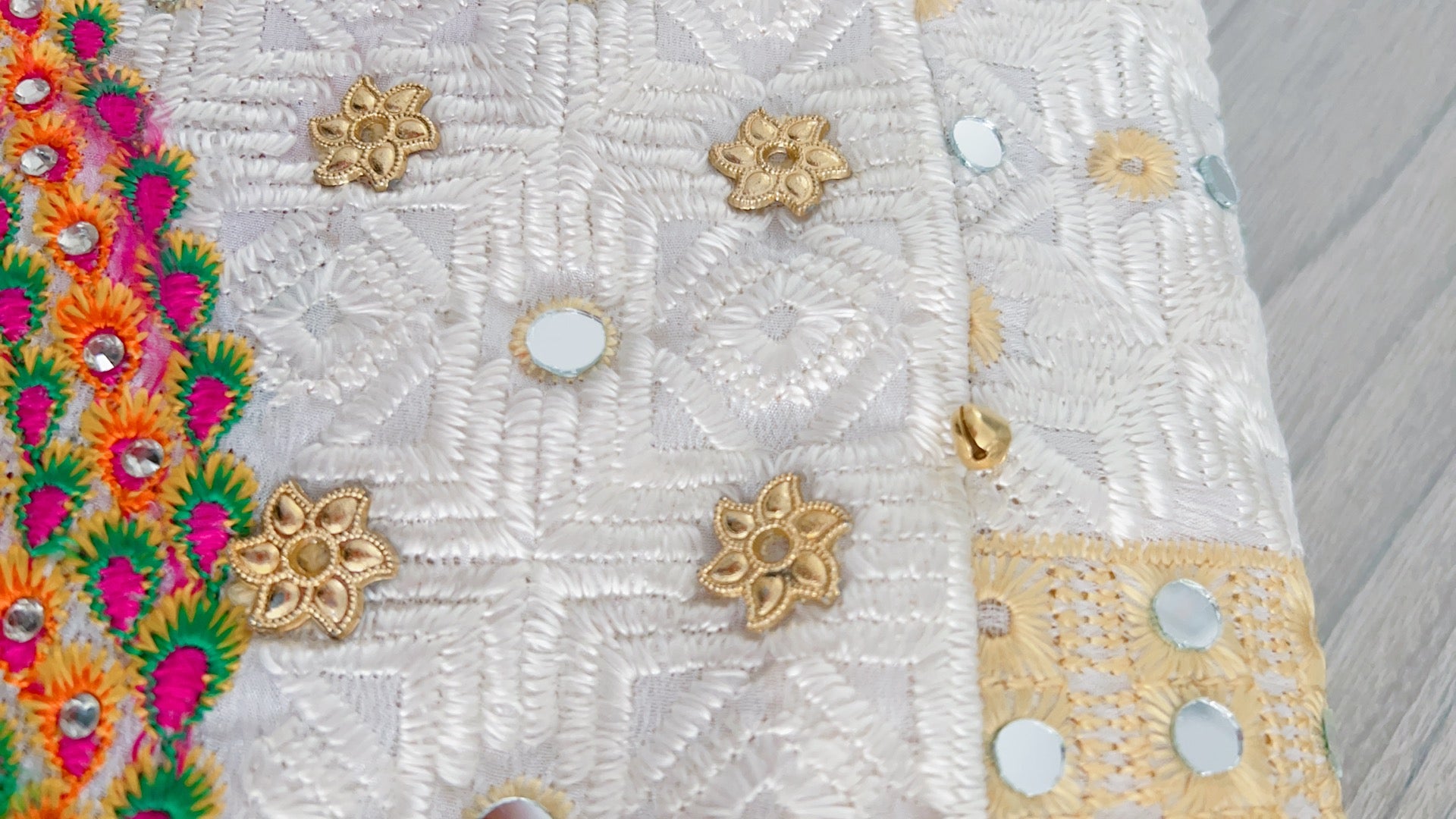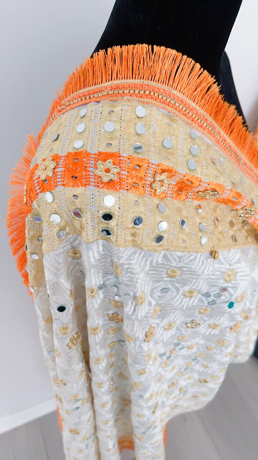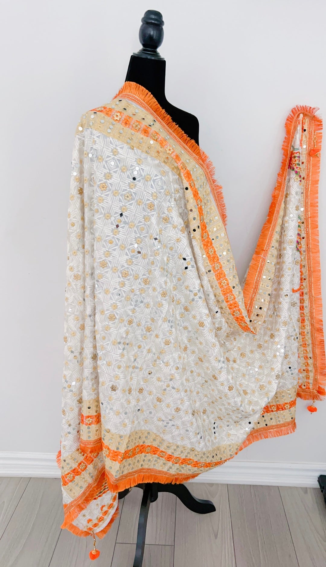 Heavily embroidered phulkari dupatta. This versatile dupatta can be matched with a plain suit for the ultra glam style; ideal for a party or bridal photoshoot; as a Maiyan chunni decor for the bride or groom.