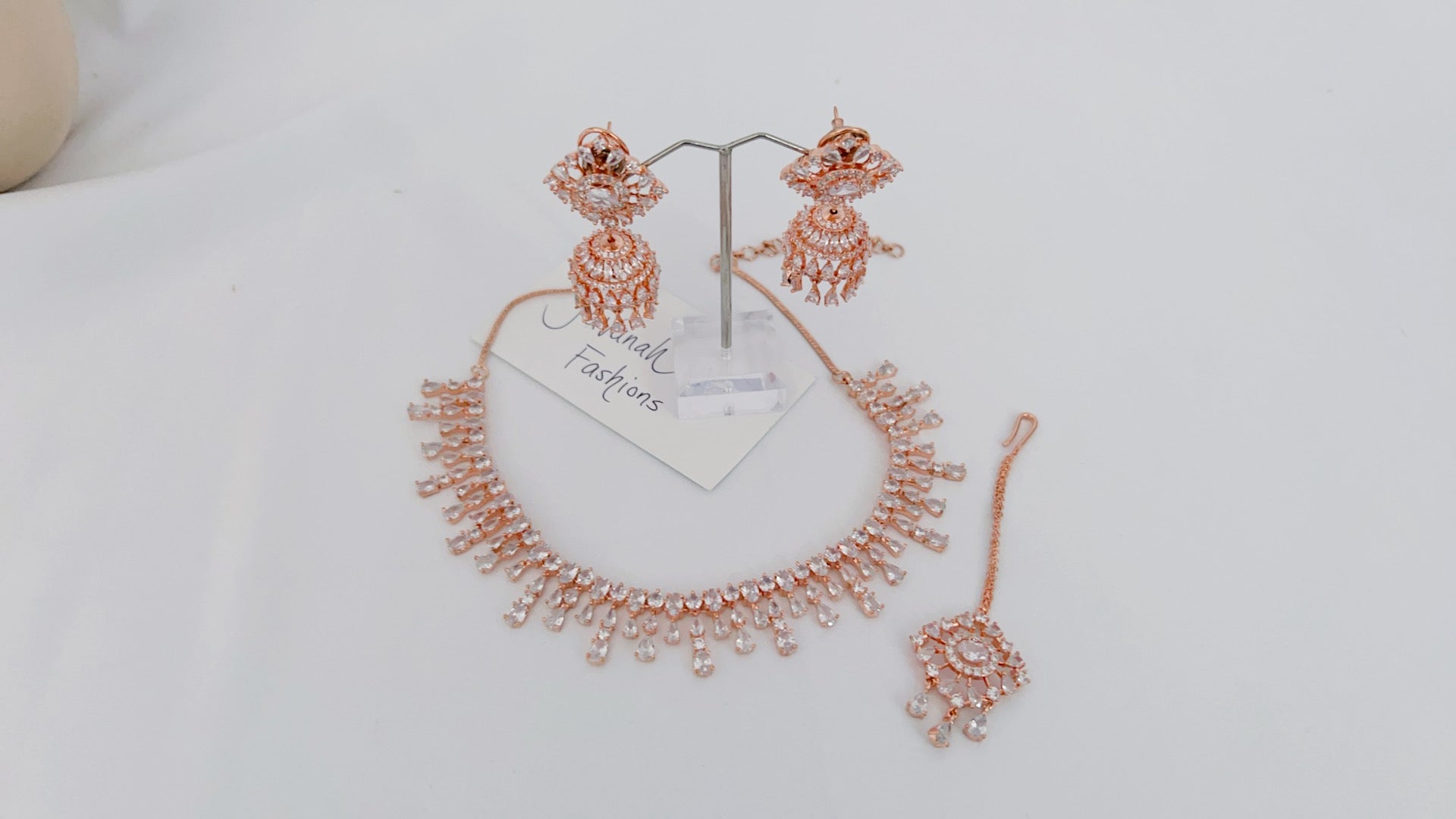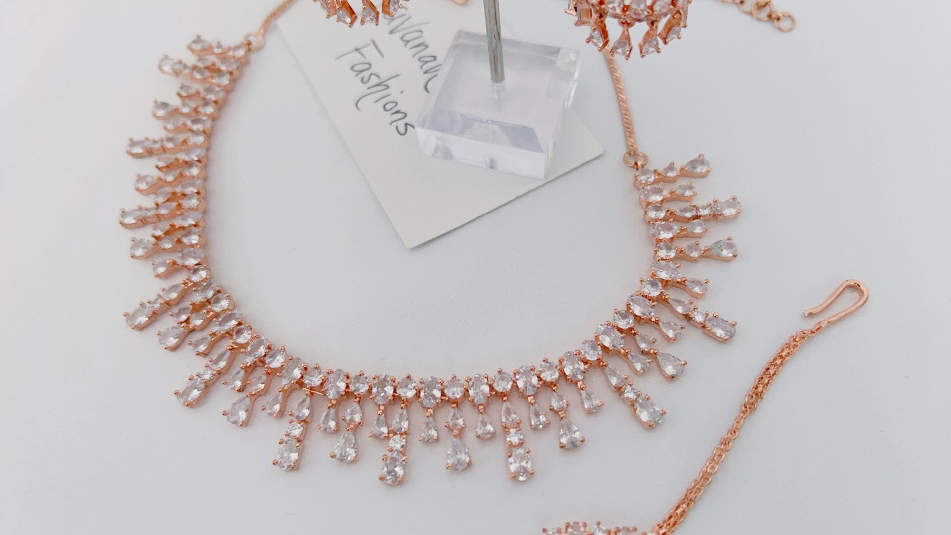 Traditional style meets contemporary in this beautiful American diamond cut choker set with a rose base and rose stones. Pair this set with your south asian or western attire.