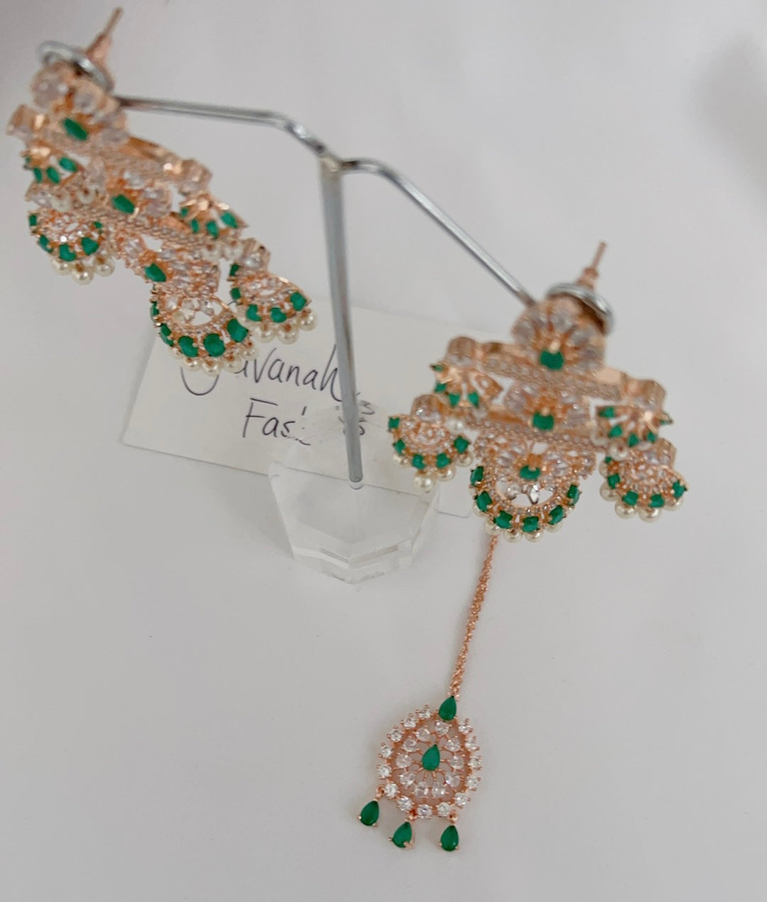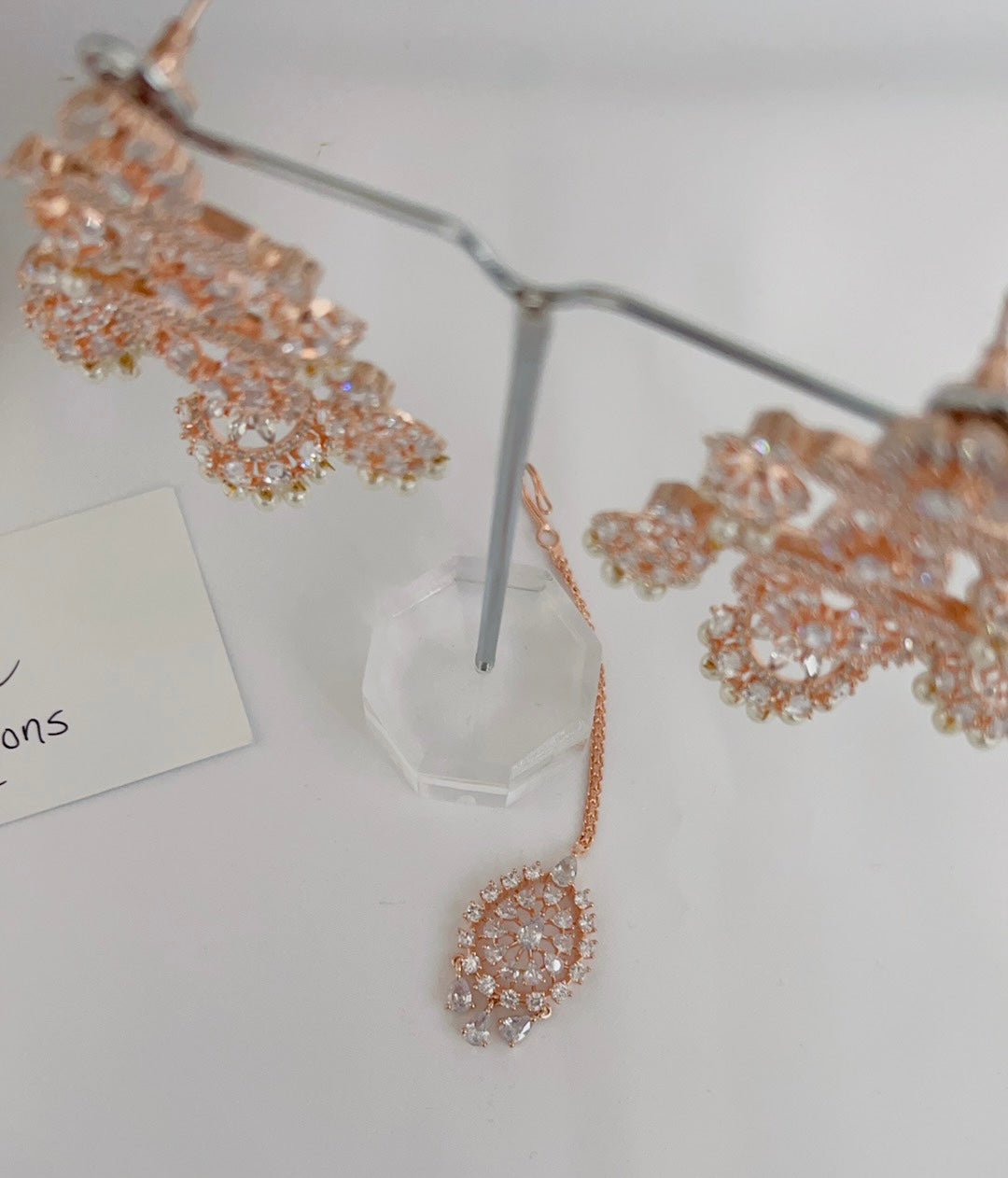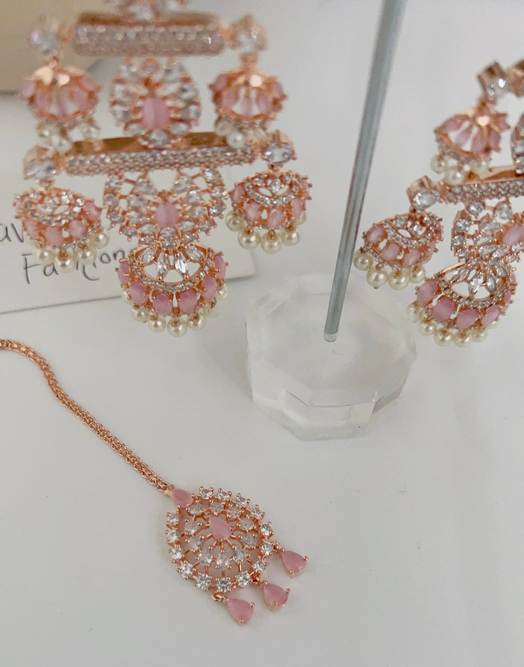 Traditional style meets contemporary in this beautiful American diamond cut tikka sets, comes in rose gold base tone with coloured stones. Pair this set with your south asian or western attire.
