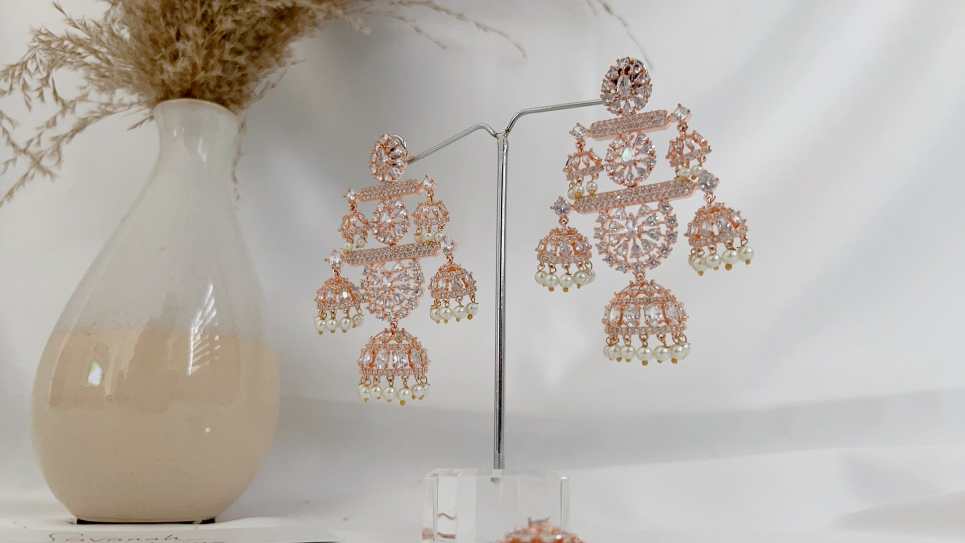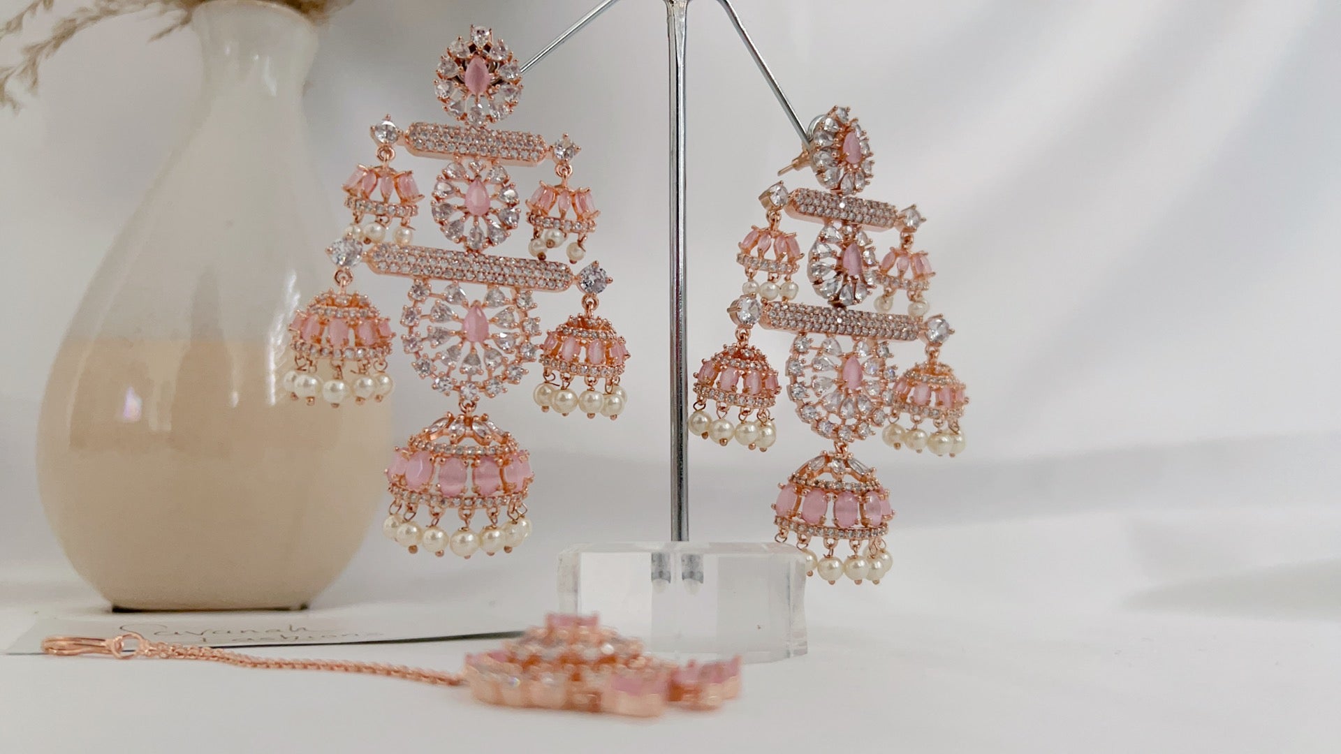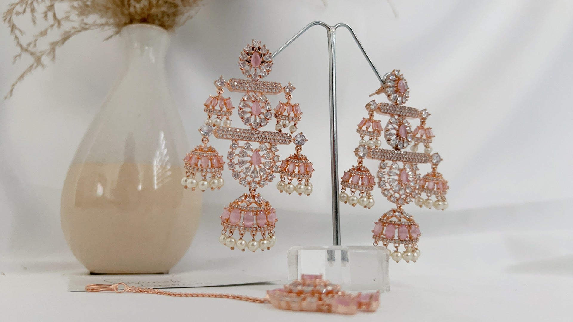 Traditional style meets contemporary in this beautiful American diamond cut tikka sets, comes in rose gold base tone with coloured stones. Pair this set with your south asian or western attire.