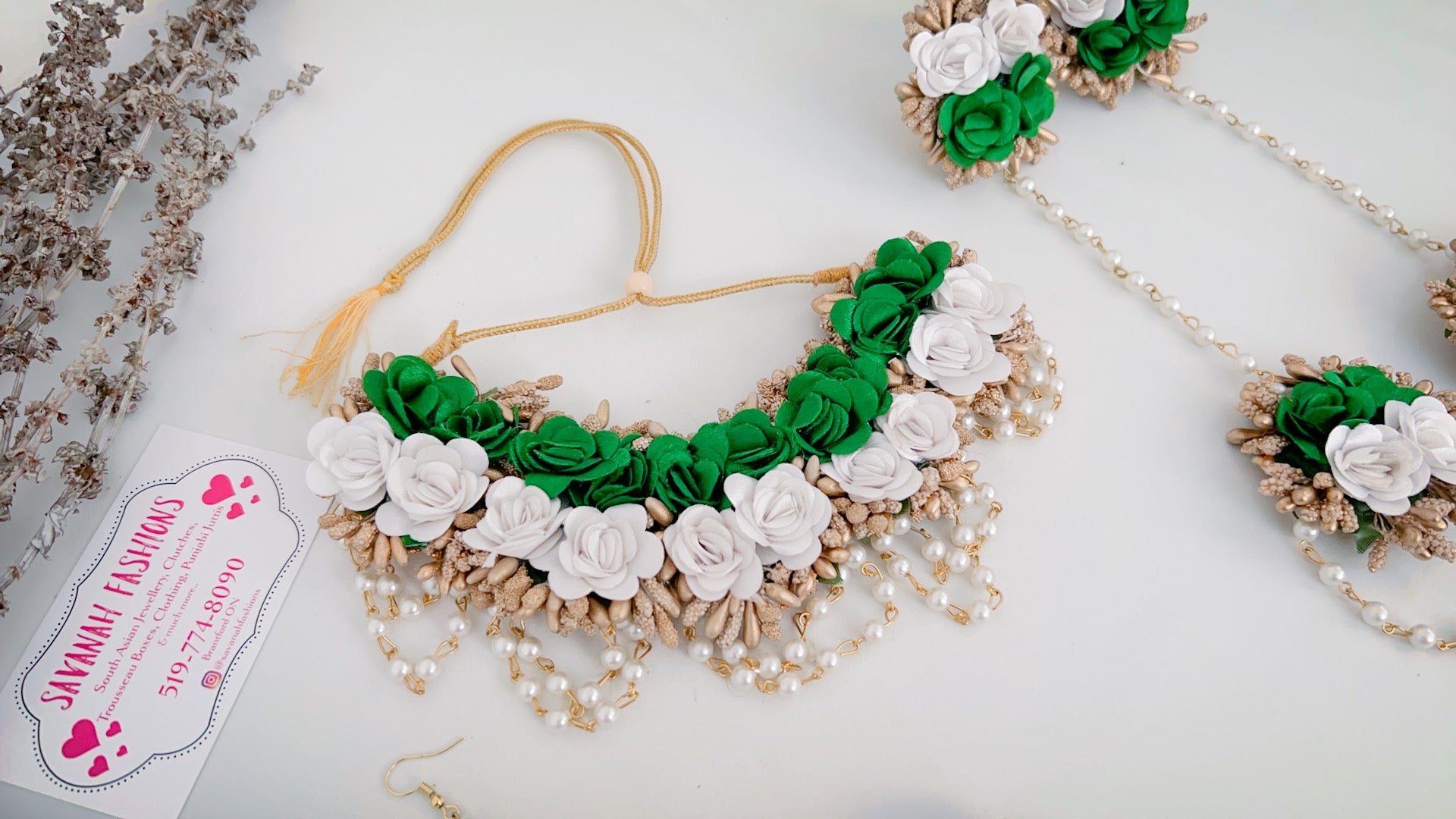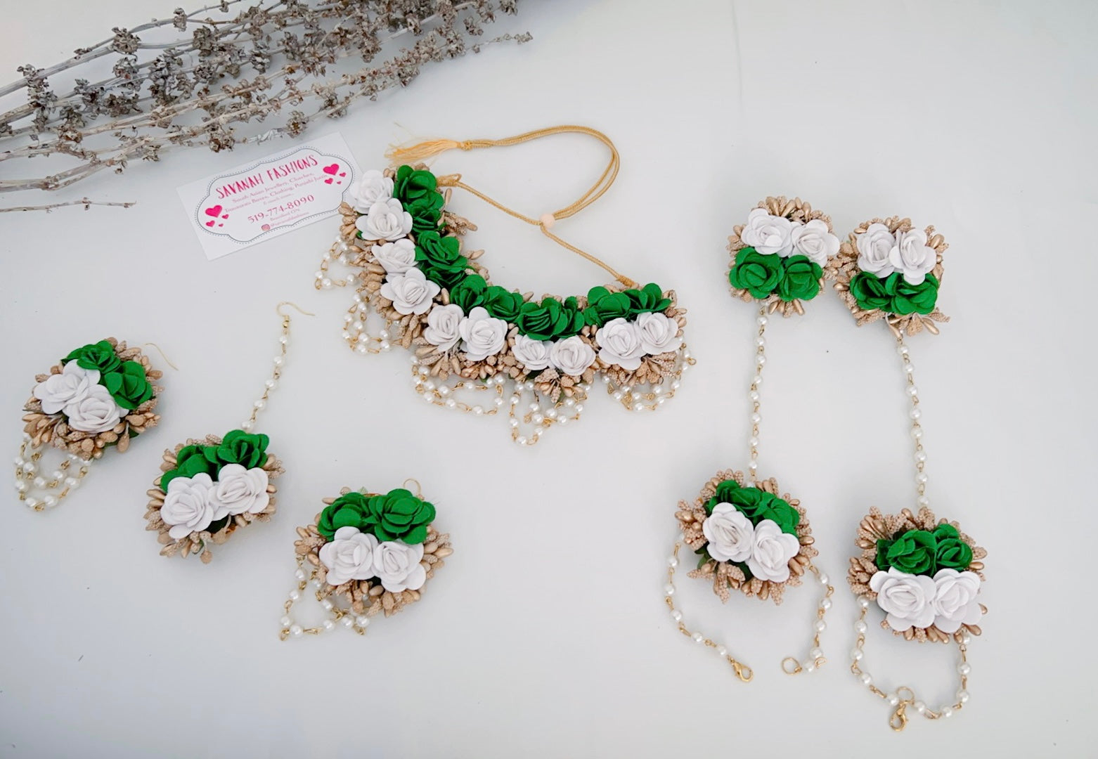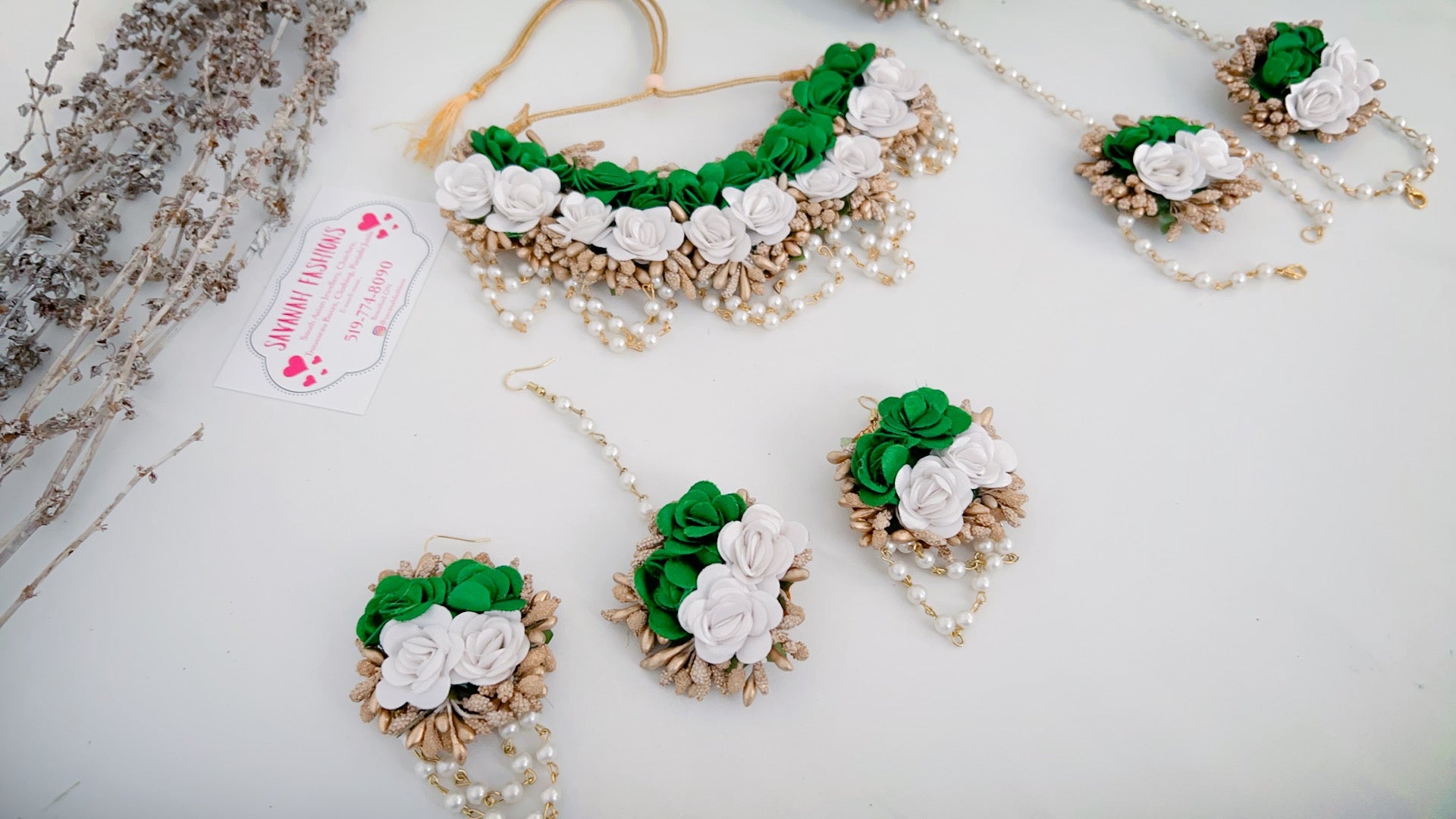Flower jewellery is unique and in latest trend for all special occasions like Mehendi, Wedding, Sangeet, and Haldi. This full set consists of necklace, tikka, earrings, and bracelets. Hand made with soft material.