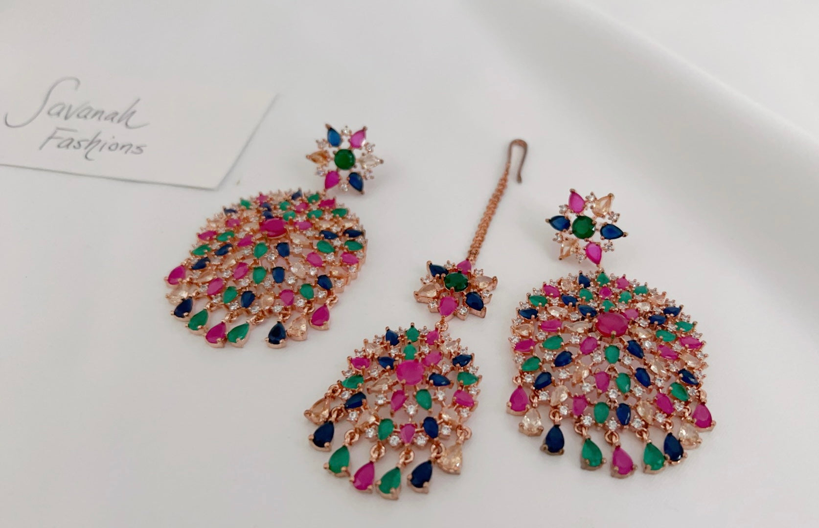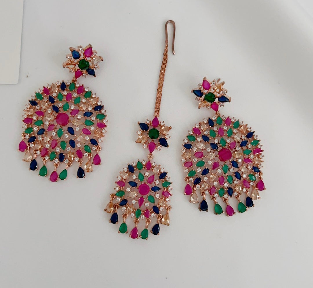 Traditional style meets contemporary in this beautiful American diamond tikka set with a rose gold base and multicoloured stones. Pair this set with your south asian or western attire.