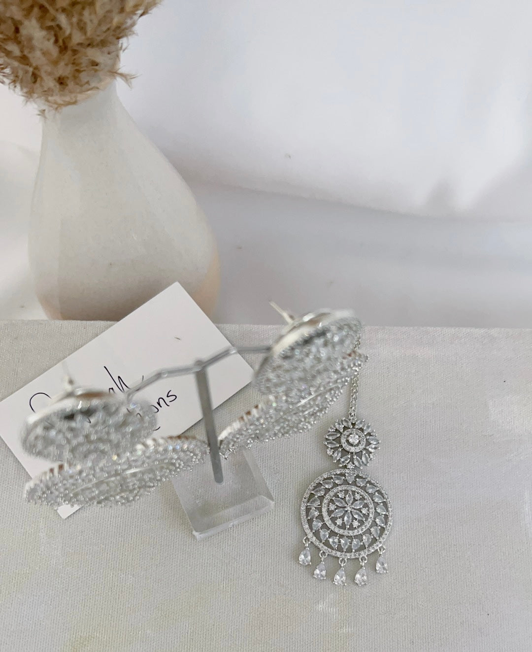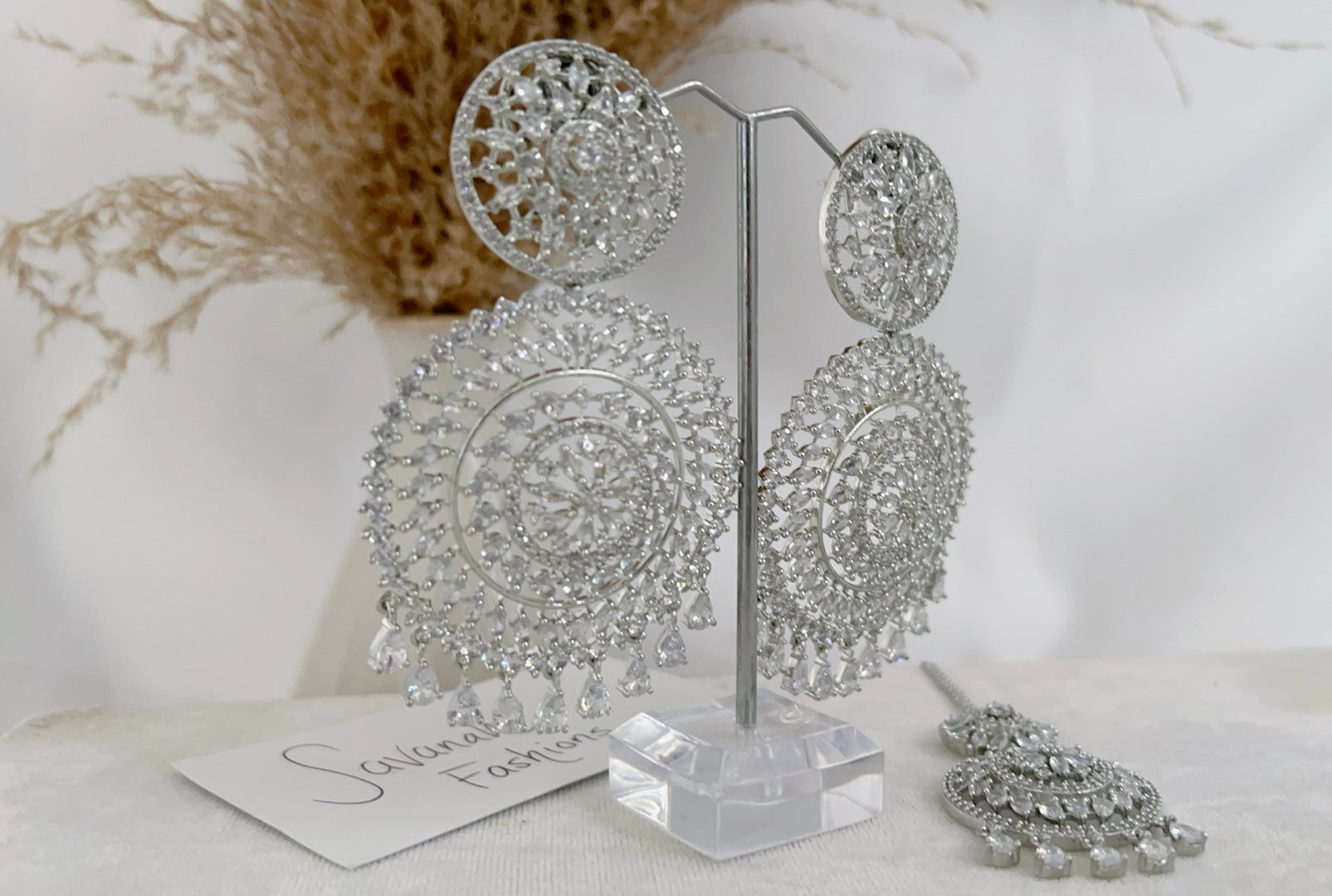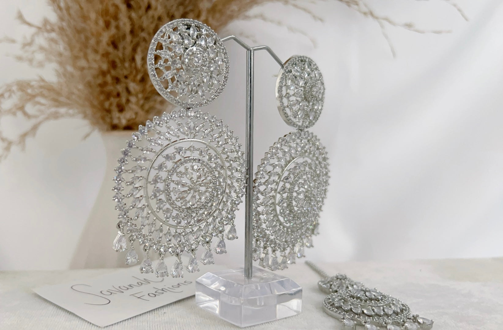 Traditional style meets contemporary in this beautiful American diamond tikka set with a silver base and silver stones. Pair this set with your south asian or western attire.